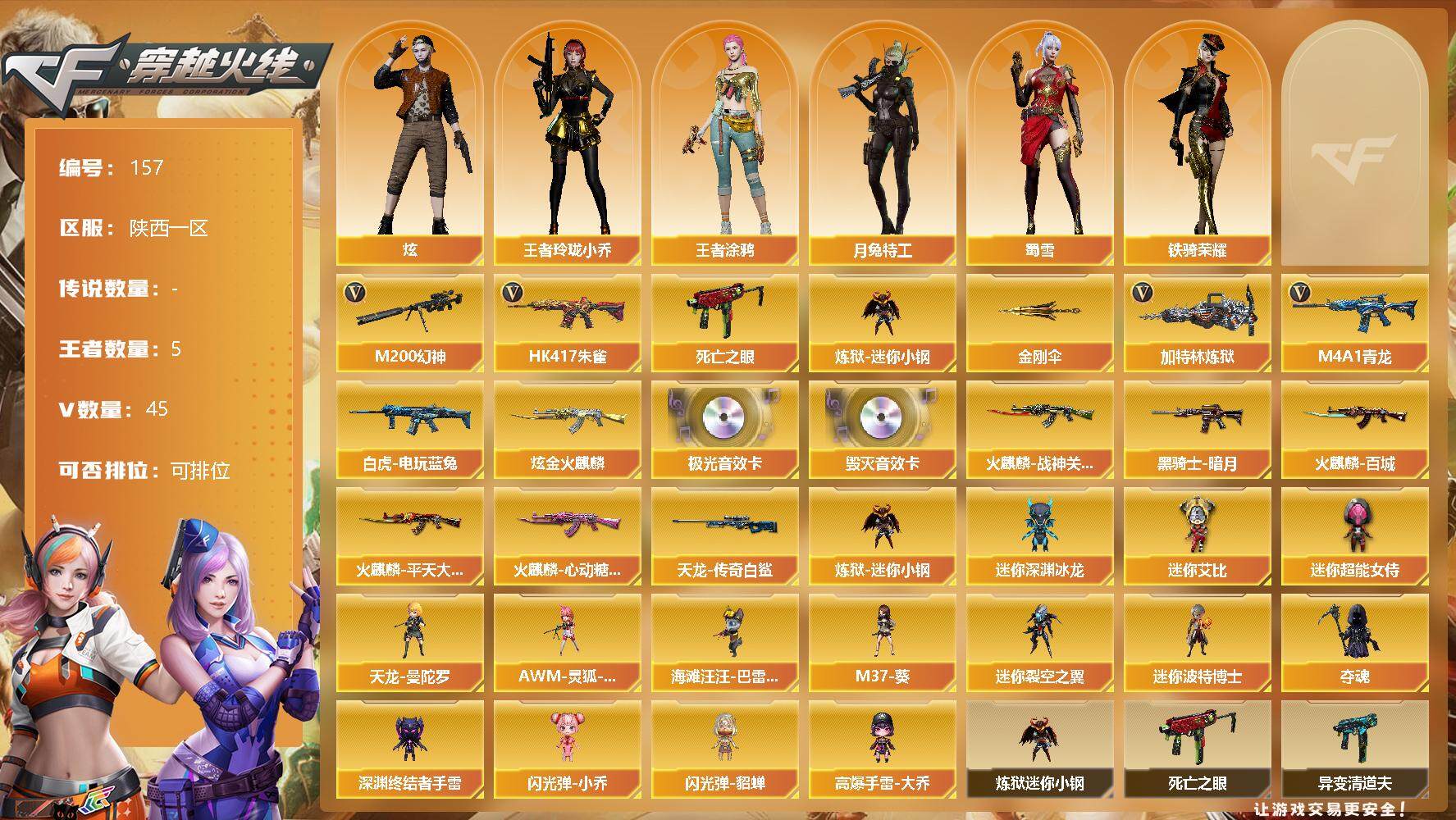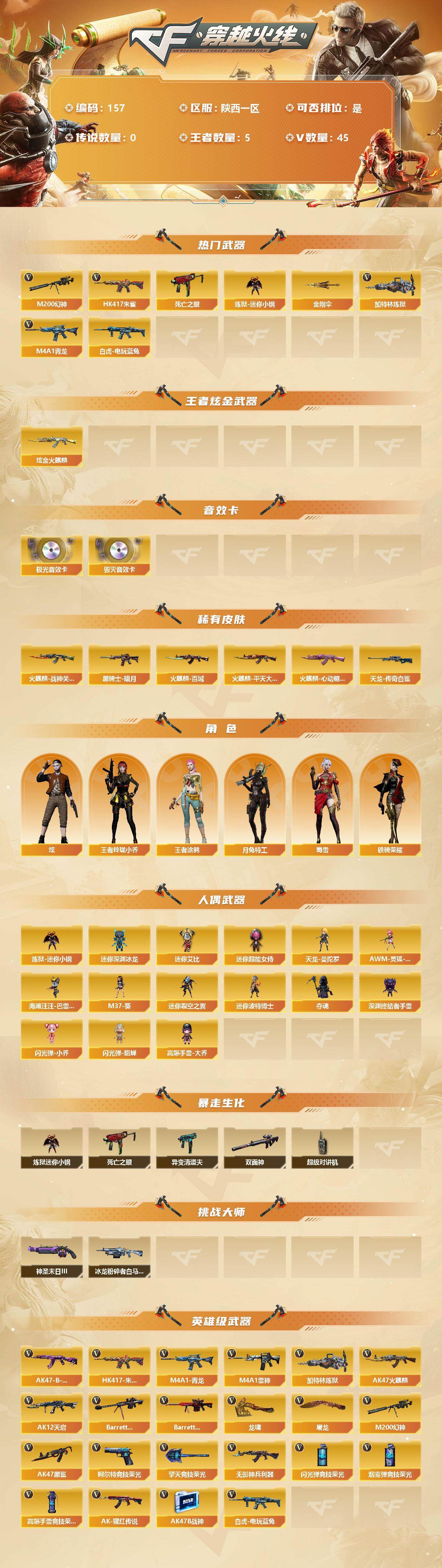 [12721301]陕西一区-45V-5王者-1炫金 【热门武器】:HK417-朱雀,M4A1-青龙,M200-幻神,死亡之眼,白虎-电玩蓝兔,炼狱-迷你小钢,加特林-炼狱*2,金刚伞 【王者炫金武器】:炫金火麒麟 【音效卡】:Barrett-毁灭音效卡,Barrett-极光音效卡 【稀有皮肤】:火麒麟-战神关羽,火麒麟-平天大圣,火麒麟-百城*2,火麒麟-心动糖果,黑骑士-暗月,AWM-天龙-传奇白鲨 【角色】:王者涂鸦,王者玲珑-小乔,炫,月兔特工,蜀雪,铁骑荣耀 【人偶武器】:天龙-曼陀罗,AWM-灵狐-15周年嘉年华,海滩汪汪-巴雷特,M37-葵,炼狱-迷你小钢,迷你深渊冰龙,迷你艾比,迷你超能女侍,迷你裂空之翼,迷你波特博士,夺魂*2,深渊终结者手雷*2,闪光弹-小乔*2,闪光弹-貂蝉,高爆手雷-大乔 【暴走生化】:炼狱-迷你小钢,死亡之眼,异变清道夫,双面神,超级对讲机 【挑战大师】:神圣爆裂者-末日III,冰龙粉碎者-白马银枪*3 【英雄级武器】:柯尔特-竞技荣光,擎天-竞技荣光,高爆手雷-竞技荣光,烟雾弹-竞技荣光,闪光弹-竞技荣光,HK417-朱雀,M4A1-青龙,白虎-电玩蓝兔,无影-神兵利器,M4A1-雷神*2,加特林-炼狱*2,AK47-火麒麟*2,AK12-天启,Barrett-毁灭,Barrett-极光,M200-幻神,AK47-黑鲨,AK-47-猩红传说,AK47-B-战神,AK47-B-常胜将军,龙啸,屠龙*2 【特殊枪械】:2炼狱