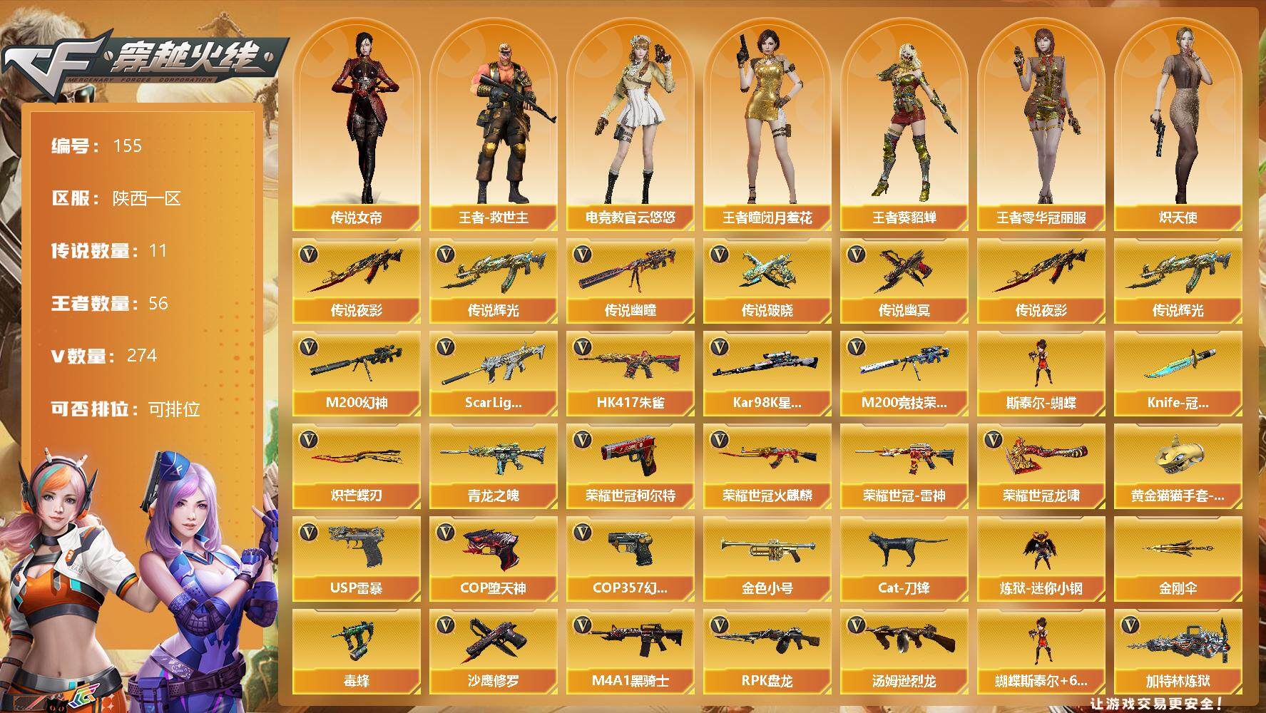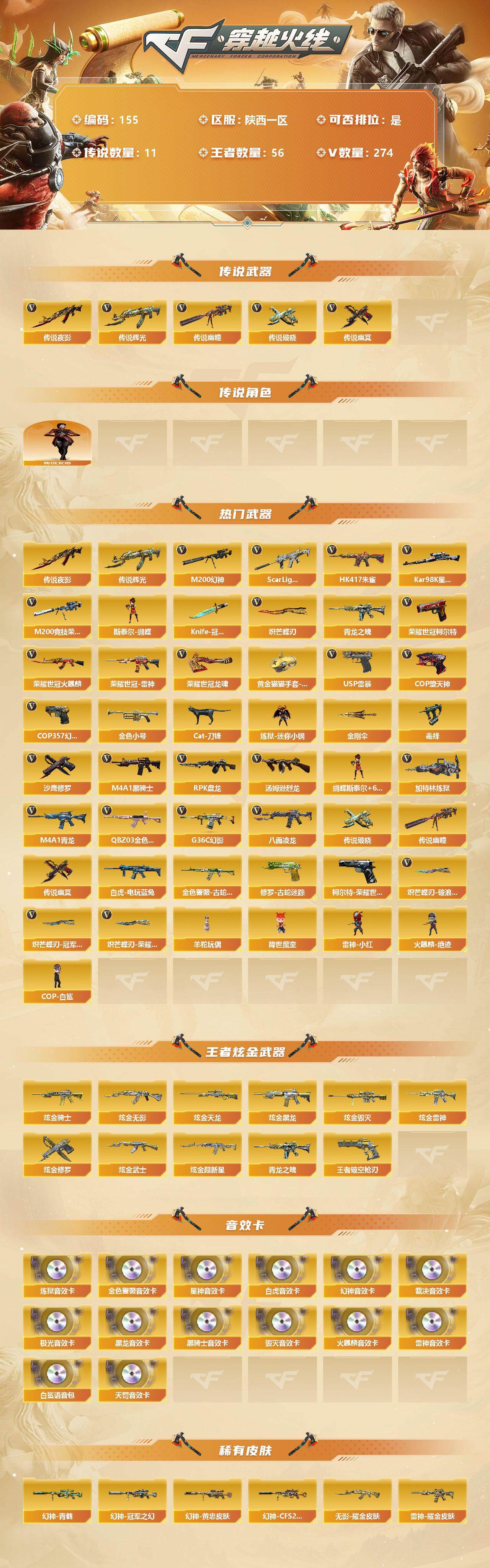 [12721249]陕西一区-274V-56王者-10炫金 【传说武器】:传说夜影*2,传说辉光,传说幽瞳*2,传说破晓*3,传说幽冥*2 【传说角色】:传说女帝 【热门武器】:传说夜影*2,传说辉光,传说幽瞳*2,传说破晓*3,传说幽冥*2,G36C-幻影,QBZ03-金色蔷薇*2,Scar Light-白虎*5,HK417-朱雀,M4A1-青龙,M200-幻神*2,柯尔特-荣耀世冠白鲨2023,金色蔷薇-古蛇迷踪,修罗-古蛇迷踪,M200-竞技荣光,八面凌龙,青龙之魄,荣耀世冠-火麒麟*2,荣耀世冠-雷神,白虎-电玩蓝兔,荣耀世冠-柯尔特,Kar98K-星神,金色小号,Cat-刀锋,炼狱-迷你小钢,毒蜂,M4A1-黑骑士*6,汤姆逊-烈龙*6,RPK-盘龙*3,加特林-炼狱*2,斯泰尔-蝴蝶,羊驼玩偶,降世魔童,雷神-小红,火麒麟-绝迹,COP-白鲨,USP-雷暴*2,COP-堕天神,COP 357-幻灵,沙鹰-修罗*4,Knife-冠军之刃,炽芒蝶刃*3,炽芒蝶刃-破浪逐光 皮肤,炽芒蝶刃-冠军炽芒皮肤,炽芒蝶刃-荣耀世冠白鲨2023 皮肤,荣耀世冠-龙啸,黄金猫猫手套-白鲨,金刚伞 【王者炫金武器】:炫金骑士,炫金无影*2,炫金天龙,炫金黑龙,炫金毁灭,炫金雷神,炫金修罗,炫金武士,炫金超新星,青龙之魄,王者破空枪刃 【音效卡】:M200-幻神音效卡*2,AK47-火麒麟音效卡*2,M4A1-雷神音效卡,M4A1-黑龙音效卡,M4A1-黑骑士音效卡,Barrett-毁灭音效卡*2,Barrett-极光音效卡,QBZ03-金色蔷薇音效卡,AWM-裁决音效卡,Scar Light-白虎音效卡,Kar98K-星神音效卡,QBZ03-天罚音效卡*2,加特林-炼狱音效卡,白鲨语音包 【稀有皮肤】:M200-幻神-黄忠皮肤,幻神-冠军之幻,幻神-青鹤,幻神-CFS2022,幻神-星火小队签名臻藏版 皮肤,幻神-荣耀世冠白鲨2023 皮肤,幻神-曹操 皮肤,星神-枪娘默 皮肤,星神-巅峰荣耀 皮肤,白虎-大汉风骨,ScarLight-白虎-冠军之虎皮肤,白虎-巅峰荣耀 皮肤,QBZ03-荣耀世冠白鲨,QBZ03-金色蔷薇-斗鱼皮肤,雷神-能量核心,雷神-荣耀之魄,雷神-星空,M4A1-雷神-CFS 2019,雷神-虎将,雷神-耀金皮肤,雷神-冠军之魄,M4A1-战神赵云,雷神-宠儿-201