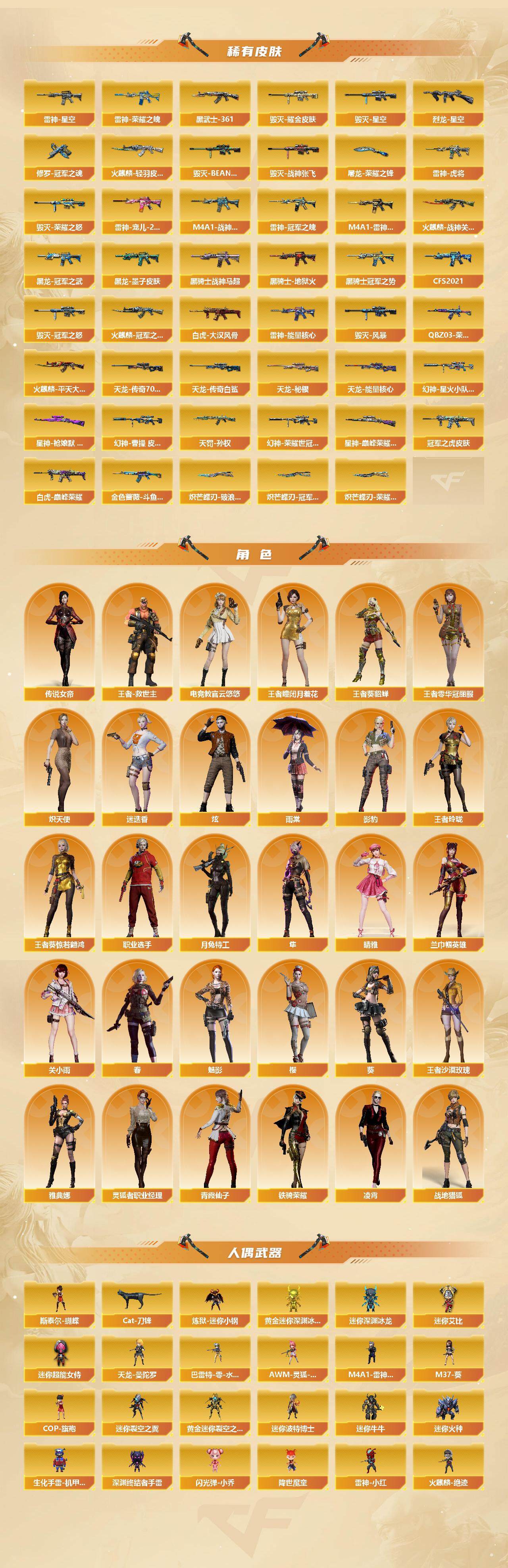 【稀有皮肤】:M200-幻神-黄忠皮肤,幻神-冠军之幻,幻神-青鹤,幻神-CFS2022,幻神-星火小队签名臻藏版 皮肤,幻神-荣耀世冠白鲨2023 皮肤,幻神-曹操 皮肤,星神-枪娘默 皮肤,星神-巅峰荣耀 皮肤,白虎-大汉风骨,ScarLight-白虎-冠军之虎皮肤,白虎-巅峰荣耀 皮肤,QBZ03-荣耀世冠白鲨,QBZ03-金色蔷薇-斗鱼皮肤,雷神-能量核心,雷神-荣耀之魄,雷神-星空,M4A1-雷神-CFS 2019,雷神-虎将,雷神-耀金皮肤,雷神-冠军之魄,M4A1-战神赵云,雷神-宠儿-201