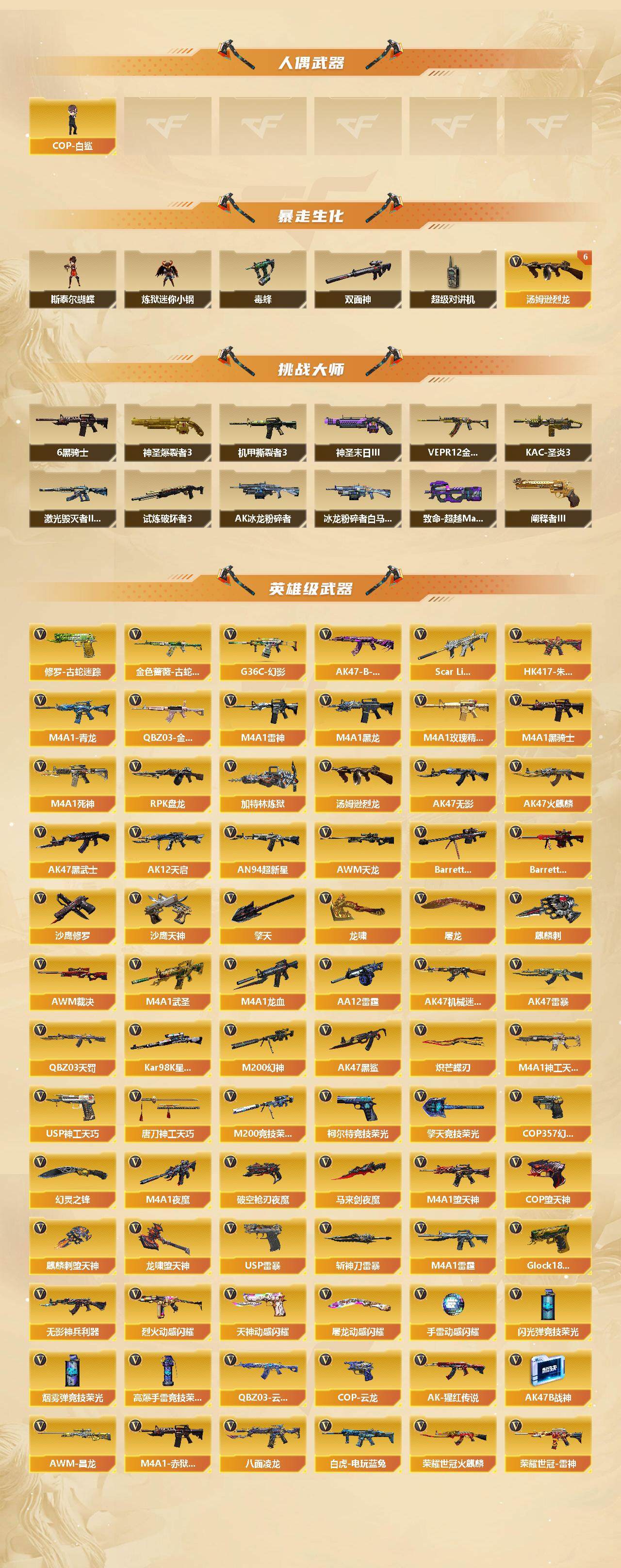 【热门武器】:传说夜影*2,传说辉光,传说幽瞳*2,传说破晓*3,传说幽冥*2,G36C-幻影,QBZ03-金色蔷薇*2,Scar Light-白虎*5,HK417-朱雀,M4A1-青龙,M200-幻神*2,柯尔特-荣耀世冠白鲨2023,金色蔷薇-古蛇迷踪,修罗-古蛇迷踪,M200-竞技荣光,八面凌龙,青龙之魄,荣耀世冠-火麒麟*2,荣耀世冠-雷神,白虎-电玩蓝兔,荣耀世冠-柯尔特,Kar98K-星神,金色小号,Cat-刀锋,炼狱-迷你小钢,毒蜂,M4A1-黑骑士*6,汤姆逊-烈龙*6,RPK-盘龙*3,加特林-炼狱*2,斯泰尔-蝴蝶,羊驼玩偶,降世魔童,雷神-小红,火麒麟-绝迹,COP-白鲨,USP-雷暴*2,COP-堕天神,COP 357-幻灵,沙鹰-修罗*4,Knife-冠军之刃,炽芒蝶刃*3,炽芒蝶刃-破浪逐光 皮肤,炽芒蝶刃-冠军炽芒皮肤,炽芒蝶刃-荣耀世冠白鲨2023 皮肤,荣耀世冠-龙啸,黄金猫猫手套-白鲨,金刚伞