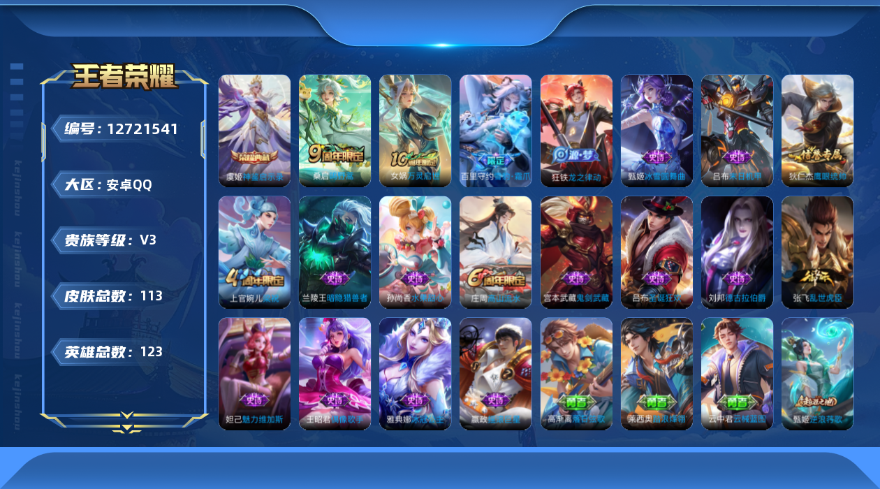 [12721541]安卓Q-V1-最强王者段位-122英雄-110皮肤-1典藏-0珍品无双-0无双-0珍品传说-1传说-15史诗 【荣耀典藏】:虞姬神鉴启示录 【传说皮肤】:桑启鸣野蒿 【限定皮肤】:姜子牙天穹之誓,狄仁杰阴阳师,庄周高山流水,夏侯惇朔风刀,狄仁杰万华元夜,牛魔御旌,弈星混沌棋,明世隐疑决卦,狂铁御狮,米莱狄御霄,盾山御銮,上官婉儿梁祝,鲁班大师探海日志,张良古海寻踪 【赛季限定】:夏侯惇朔风刀,狄仁杰万华元夜,张良古海寻踪,牛魔御旌,弈星混沌棋,明世隐疑决卦,狂铁御狮,米莱狄御霄,盾山御銮,鲁班大师探海日志,姜子牙天穹之誓 【史诗皮肤】:甄姬冰雪圆舞曲,王昭君偶像歌手,宫本武藏鬼剑武藏,孙尚香水果甜心,嬴政摇滚巨星,妲己魅力维加斯,吕布圣诞狂欢,吕布末日机甲,张飞乱世虎臣,刘邦德古拉伯爵,雅典娜冰冠公主,上官婉儿梁祝,庄周高山流水,狂铁龙之律动,百里守约雪豹霜爪 【其他皮肤】:韩信教廷特使,韩信街头霸王,阿轲爱心护理,达摩大发明家,赵云忍炎影,程咬金星际陆战队,白起白色死神,牛魔西部大镖客,扁鹊化身博士,孙膑天使之翼,妲己少女阿狸,典韦黄金武士,亚瑟死亡骑士,达摩拳王,花木兰兔女郎,张飞五福同心,甄姬花好人间,宫本武藏万象初新,狄仁杰阴阳师,刘备纽约教父,刘备汉昭烈帝,关羽龙腾万里,钟无艳海滩丽影,宫本武藏霸王丸,老夫子功夫老勺,孙尚香沉稳之力,诸葛亮掌控之力,李白敏锐之力,鬼谷子幻乐之宴,狂铁御狮,安琪拉如懿,苏烈坚韧之力,米莱狄御霄,明世隐虹云星官,牛魔御旌,小乔丁香结,吕布野性能量,盾山御銮,沈梦溪鲨炮海盗猫,夏侯惇朔风刀,弈星混沌棋,鲁班七号黑桃队长,明世隐疑决卦,盾山圆桌骑士,狄仁杰万华元夜,刘禅秘密基地,米莱狄契约魔法,海月幻泉雾影,猪八戒潮玩探月行,鲁班大师探海日志,张良古海寻踪,亚连破局者,姜子牙天穹之誓,苍苍林狼骑,典韦铁骨偃魂,姜子牙星梦巡礼,戈娅玫蓝誓约,刘备浪漫序章,钟馗虚灵犬护,苏烈春野闲踪,张良灵野札记,阿古朵布丁狗之约,白起死霸装,甄姬逆浪荇歌,云中君云械蓝图,高渐离落日弦歌,莱西奥踏浪烽翎,貂蝉异域舞娘,张良一千零一夜,张良天堂福音,小乔万圣前夜,孙悟空西部大镖客,周瑜海军大将,后羿精灵王,兰陵王隐刃,李元芳特种部队,虞姬加勒比小姐,蔡文姬蔷薇王座,杨戬埃及法老,诸葛亮星航指挥官,干将莫邪第七人偶,铠龙域领主,百里守约绝影神枪,梦奇美