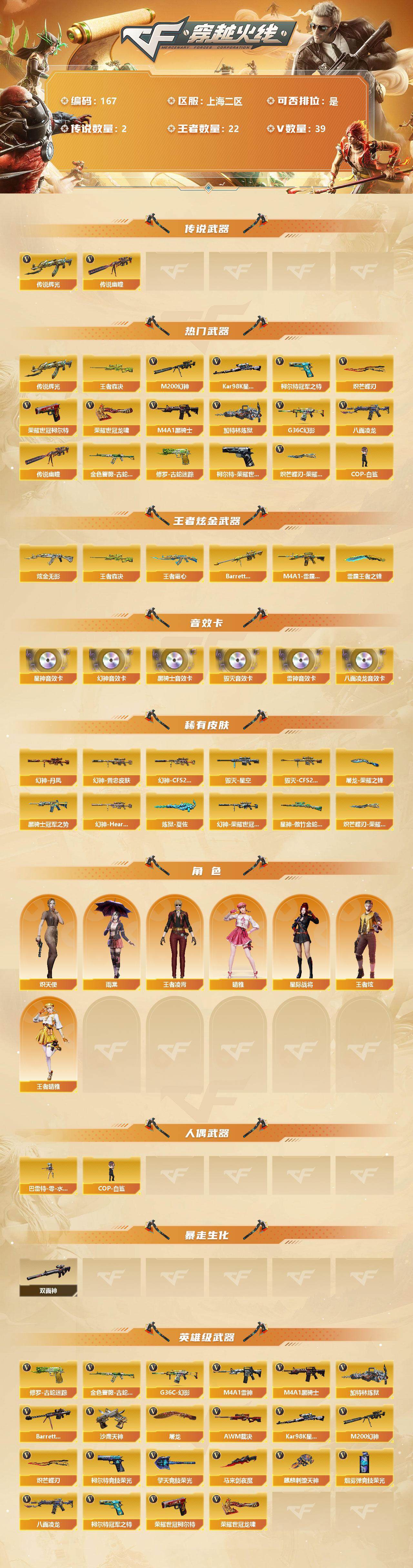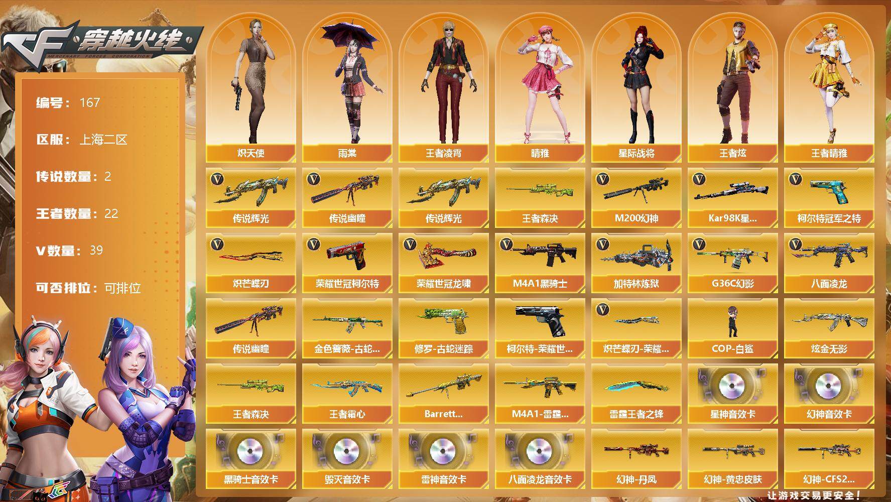[12724219]上海二区-39V-22王者-1炫金 【传说武器】:传说辉光,传说幽瞳 【热门武器】:传说辉光,传说幽瞳,王者森决,G36C-幻影,M200-幻神,柯尔特-荣耀世冠白鲨2023*2,金色蔷薇-古蛇迷踪,修罗-古蛇迷踪,八面凌龙,柯尔特-冠军之特,荣耀世冠-柯尔特,Kar98K-星神,M4A1-黑骑士,加特林-炼狱,COP-白鲨*2,炽芒蝶刃,炽芒蝶刃-荣耀世冠白鲨2023 皮肤,荣耀世冠-龙啸 【王者炫金武器】:炫金无影,Barrett-雷霆王者,M4A1-雷霆王者,王者霜心,王者森决,雷霆王者之锋*2 【音效卡】:M200-幻神音效卡,M4A1-雷神音效卡,M4A1-黑骑士音效卡,Barrett-毁灭音效卡,Kar98K-星神音效卡,八面凌龙音效卡 【稀有皮肤】:M200-幻神-黄忠皮肤,幻神-丹凤,幻神-CFS2022,幻神-Heartshot 皮肤,幻神-荣耀世冠白鲨2023 皮肤,星神-傲竹金蛇 皮肤,黑骑士-冠军之势,毁灭-星空,毁灭-CFS2020,炼狱-夏佐 皮肤,炽芒蝶刃-荣耀世冠白鲨2023 皮肤,屠龙-荣耀之锋 【角色】:王者炫,王者凌霄,王者晴雅,雨棠,晴雅,星际战将,炽天使 【人偶武器】:COP-白鲨*2,巴雷特-零-水下丽影 【暴走生化】:双面神 【英雄级武器】:柯尔特-竞技荣光,擎天-竞技荣光,烟雾弹-竞技荣光,马来剑-夜魔,麒麟刺-堕天神,荣耀世冠-柯尔特,荣耀世冠-龙啸,G36C-幻影,金色蔷薇-古蛇迷踪,八面凌龙,M4A1-雷神,M4A1-黑骑士,加特林-炼狱,Barrett-毁灭,AWM-裁决,Kar98K-星神,M200-幻神,柯尔特-冠军之特,修罗-古蛇迷踪,沙鹰-天神,炽芒蝶刃,屠龙*3 【特殊枪械】:1黑骑士,1炼狱
