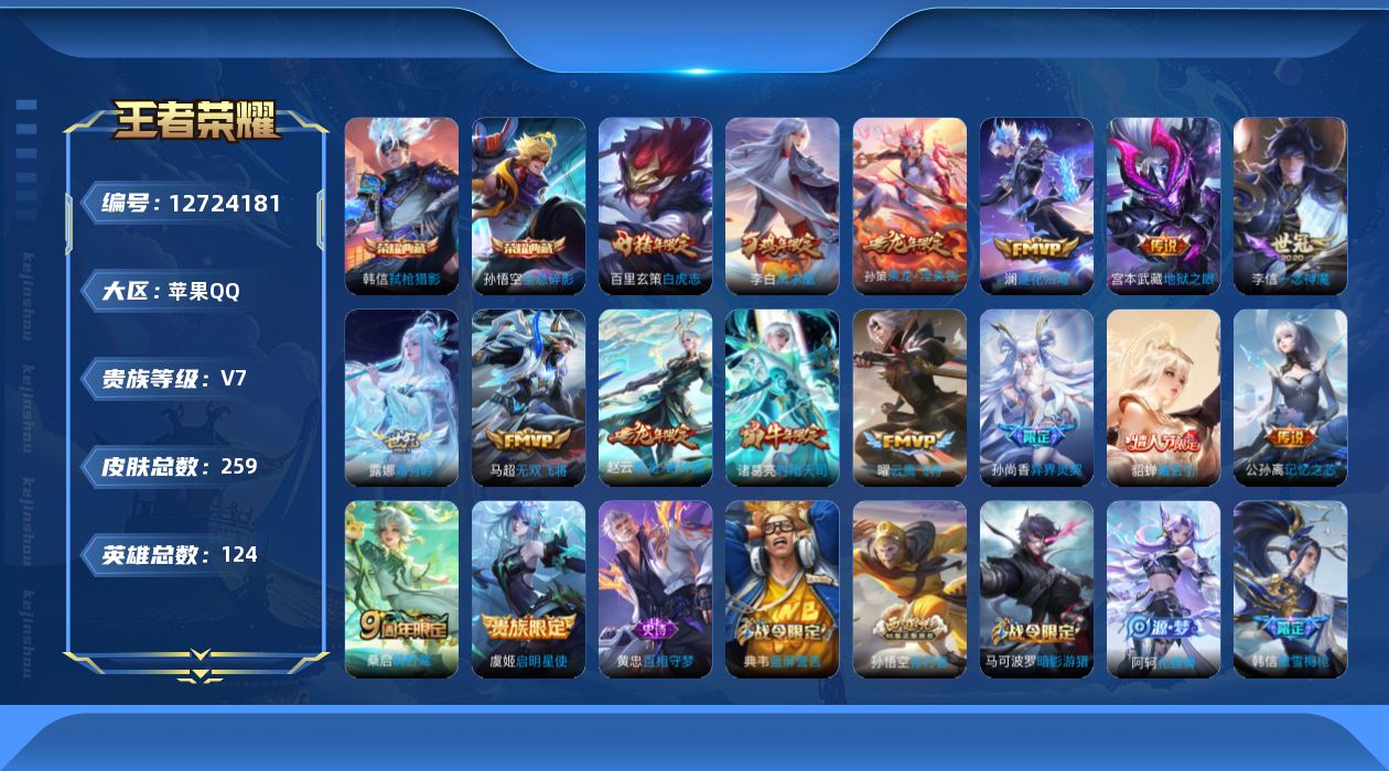 [12724181]苹果Q-V7-最强王者段位-124英雄-259皮肤-2典藏-0珍品无双-0无双-0珍品传说-16传说-68史诗