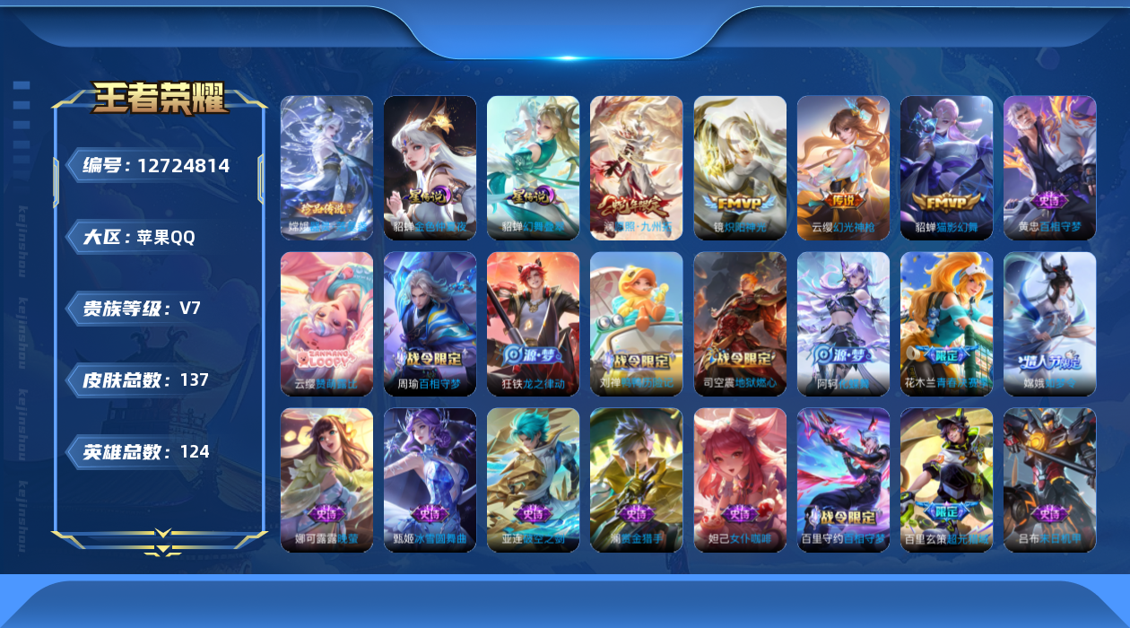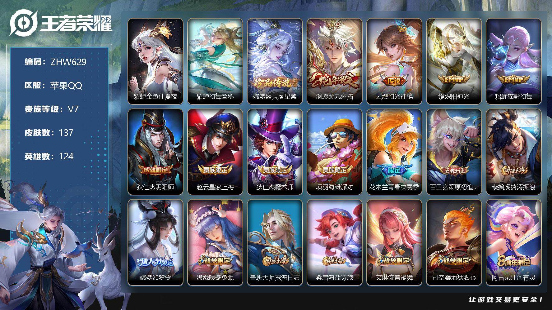 [12724814]【特价急出/详情看图/w战市标嫦娥】:苹果Q-V7-最强王者段位-124英雄-137皮肤-1珍品传说-2星元-4传说-46史诗