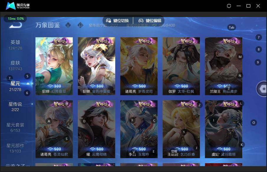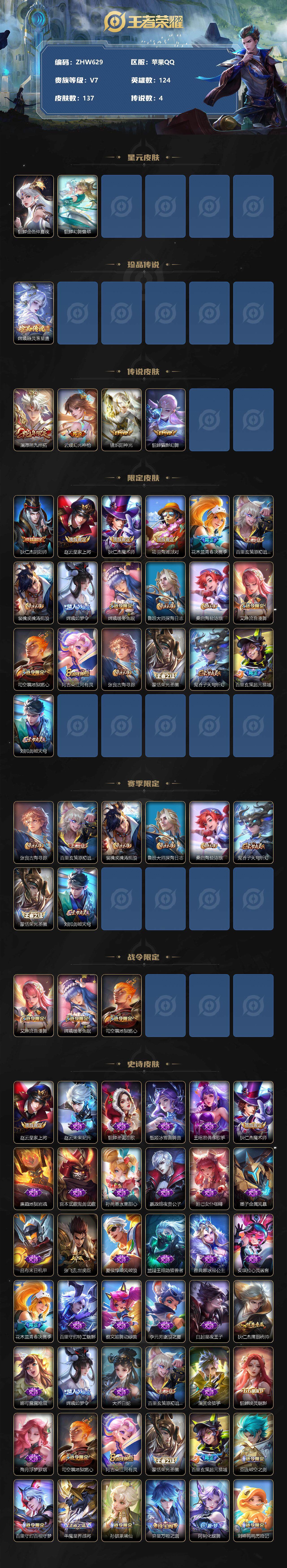 - [11608517]V7 1典藏 10传说 124英雄 235皮肤 可修改实名 优质装备:全息碎影(猴子典藏),冠军飞将,末日机甲-孙尚香(绿蚂蚱),地狱火,仲夏夜之梦(大飞蛾),超时空战士-狄仁杰 珍宝阁皮:优雅恋人 限定皮:白虎志(电光耗子),凤求凰(白切鸡),太华(伽罗年限),梅西,武陵仙君(小桃花),神威(电光马子),遇见飞天,游园惊梦,梁祝,御风骁将(吕布年限),龙胆,逐梦之翼,李小龙,逐梦之影,朱雀志(守约年限),永曜之星,辉光之辰,如梦令-嫦娥,如梦令-后羿,一生所爱,大圣娶亲,寅虎·心曲(虎婆) 史诗皮:化蝶舞,龙之律动,藏狐·褐绒,茶境仙,紫霞仙子,苍穹之光,电玩小子(小书包),黄金分割率,特工魅影,千年之狐,江河有灵,蒙恬荣光圣徽,无限星赏官,电玩·爆裂旋风,乱世虎臣,摇滚巨星,水果甜心,星夜王子,德古拉伯爵,暗隐猎兽者,鬼剑武藏,乐园奇幻夜,舞动绿茵,地狱岩魂,纤云弄巧,繁星吟游(呼啦呼啦),拒霜思,乘风破浪,逐浪之夏,水晶猎龙者,曙光守护者,金属风暴,原初追逐者,圣诞狂欢,圣诞恋歌,鹰眼统帅,暗夜贵公子,魅力维加斯,黎明之约,无心,未来纪元-赵云