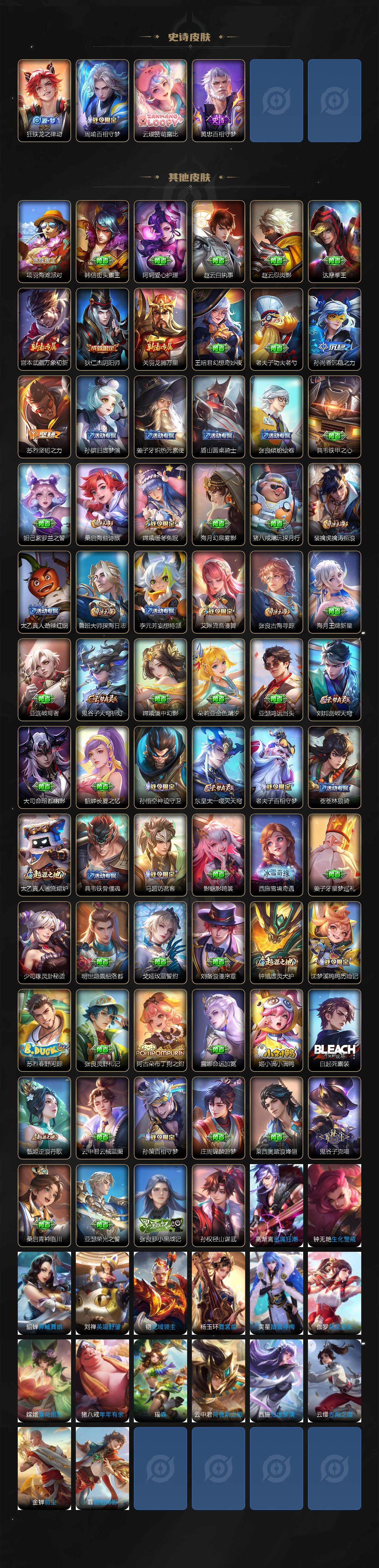 【史诗皮肤】:赵云皇家上将,赵云未来纪元,貂蝉圣诞恋歌,甄姬冰雪圆舞曲,王昭君偶像歌手,狄仁杰魔术师,廉颇地狱岩魂,宫本武藏鬼剑武藏,孙尚香水果甜心,嬴政暗夜贵公子,妲己女仆咖啡,墨子金属风暴,吕布末日机甲,张飞乱世虎臣,夏侯惇乘风破浪,兰陵王暗隐猎兽者,雅典娜冰冠公主,安琪拉心灵骇客,花木兰青春决赛季,百里守约特工魅影,蔡文姬舞动绿茵,李元芳逐浪之夏,白起星夜王子,狄仁杰鹰眼统帅,娜可露露晚萤,嫦娥如梦令,大乔白蛇,百里玄策原初追逐者,澜赏金猎手,貂蝉唤灵魅影,海月浮梦罗烟,司空震地狱燃心,阿古朵江河有灵,蒙恬荣光圣徽,百里玄策超元猎域,亚连破空之剑,百里守约百相守梦,牛魔星界战将,孙膑茶境仙,弈星万物之道,阿轲化蝶舞,刘禅鸭鸭历险记,狂铁龙之律动,周瑜百相守梦,云缨赞萌露比,黄忠百相守梦