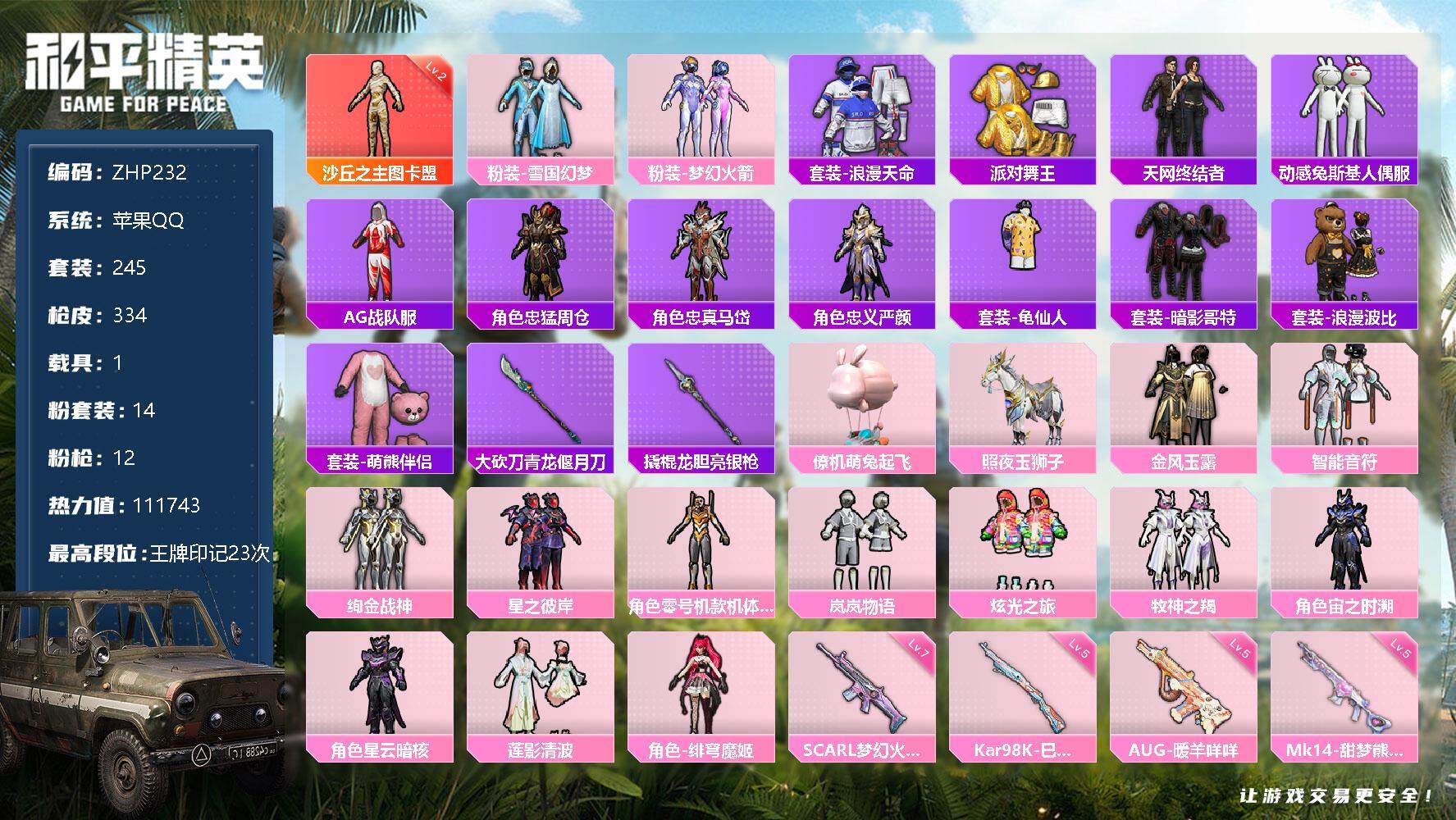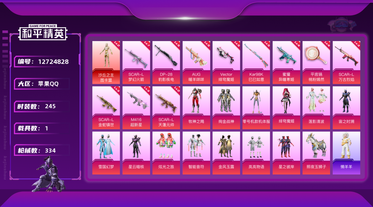 [12724828]2级图卡盟雪国!苹果 手Q-1神装-14粉装-12特效枪-1载具+1僚机-6粉色飞行器-111743热力值-23王牌印记-245套装-334枪皮