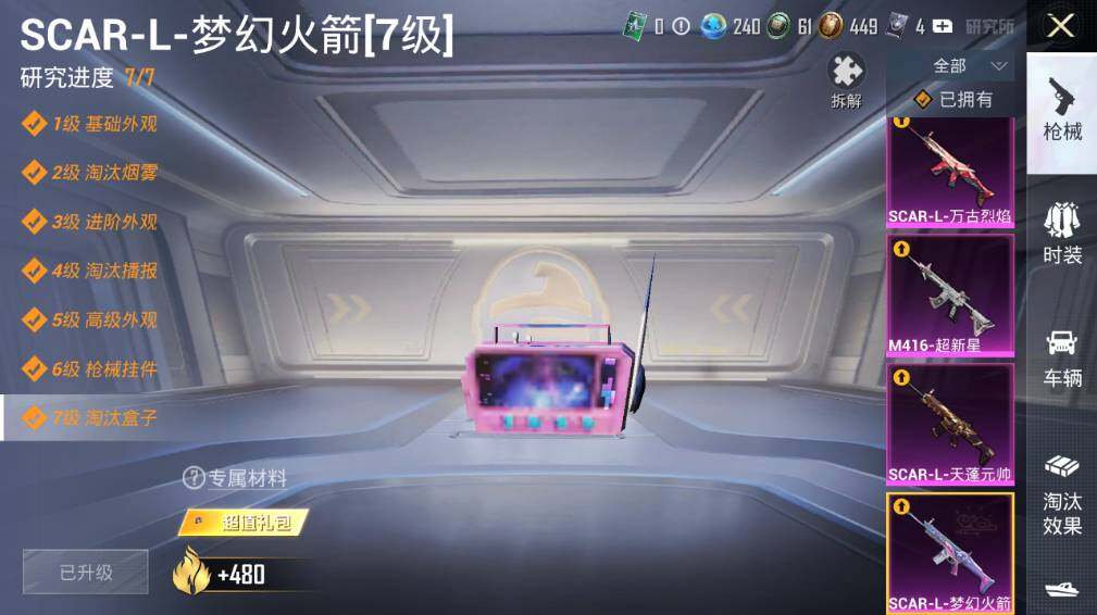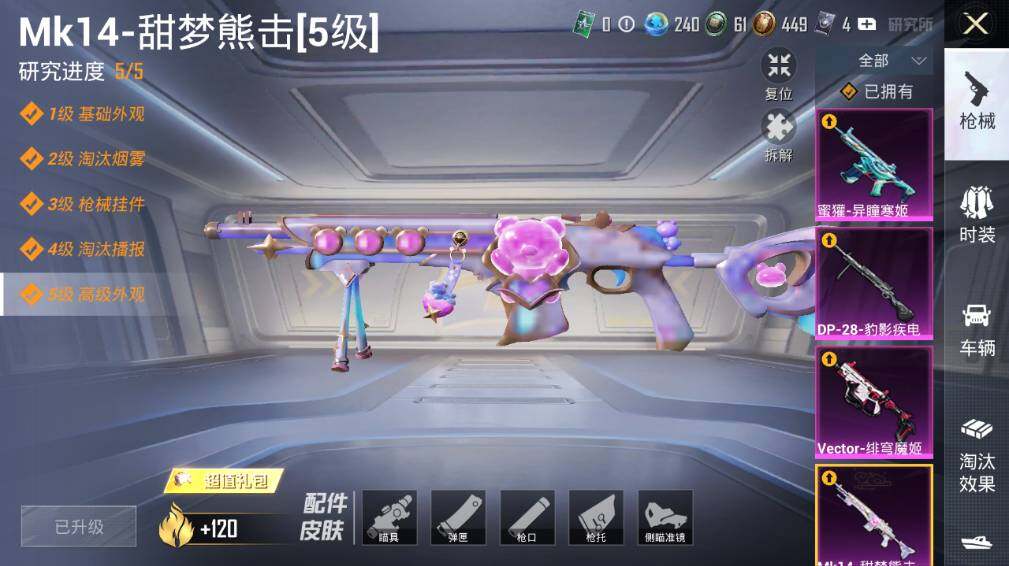 【粉色枪皮等级】:SCAR-L-梦幻火箭(七级),SCAR-L-天蓬元帅(二级),SCAR-L-万古烈焰(三级),SCAR-L-金蛇镇世(三级),M416-超新星(三级),AUG-暖羊咩咩(五级),蜜獾-异瞳寒姬(四级),Vector-绯穹魔姬(五级),Kar98K-巳巳如意(五级),Mk14-甜梦熊击(五级),DP-28-豹影疾电(五级),平底锅-桃粉嫣然(四级)
