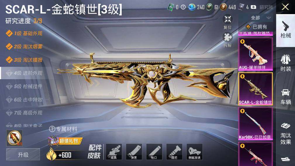 SCAR-L-梦幻火箭,SCAR-L-天蓬元帅,SCAR-L-金蛇镇世,M416-超新星,AUG-暖羊咩咩,Kar98K-巳巳如意,平底锅-桃粉嫣然