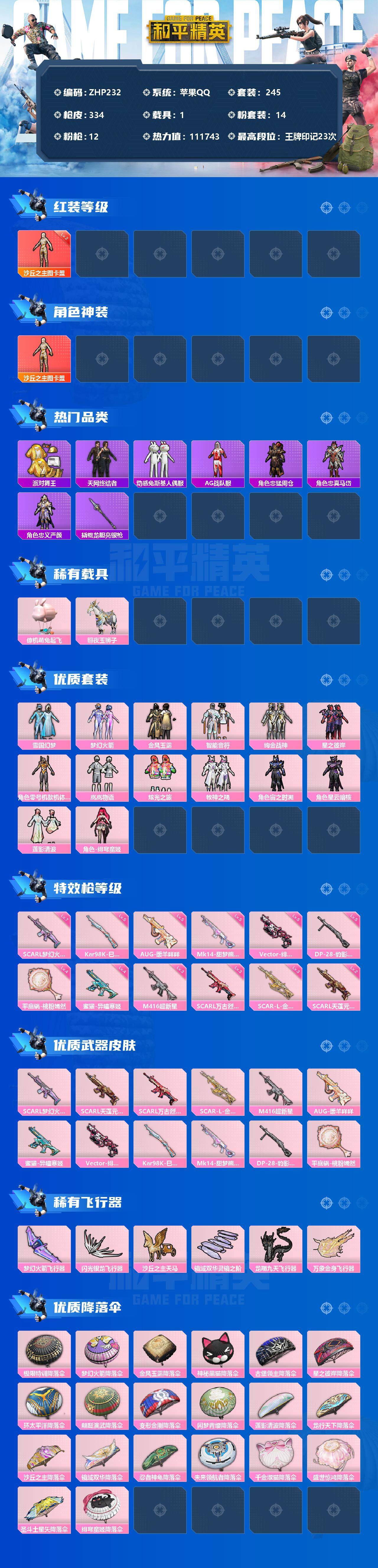 - [12583217]苹果 手Q-13粉装-5特效枪-1载具-3粉色飞行器-65291热力值-11王牌印记-157套装-180枪皮 【热门品类】:套装-浪漫天命,套装-都市猎人,套装-派对舞王,套装-深海小丑鱼,套装-小丑鱼,套装-龟仙人,套装-暗影哥特,熔岩游骑兵面罩,熔岩游骑兵连帽夹克 【粉色载具】:兰博基尼Estoque(银翼灰) 【粉色套装】:粉装-宝贝奶油派,粉装-天使彩虹糖,粉装-星之彼岸,粉装-蓝莓炮弹,粉装-精灵娃娃,粉装-暗星紫秘,粉装-焦糖拿铁,粉装-寒光使者,粉装-第五大道,粉装-黄族统领,角色-阿尔茜,粉装-室女星神,角色-樱桃泡泡 【粉色枪皮等级】:M416-风花雪月(七级),AUG-星之彼岸(六级),Kar98K-巳巳如意(五级),Mk14-樱桃泡泡(七级),M249-蓝莓炮弹(三级) 【粉色枪皮】:M416-风花雪月,AUG-星之彼岸,Kar98K-巳巳如意,Mk14-樱桃泡泡,M249-蓝莓炮弹 【粉色飞行器】:甜心娃娃飞行器,天之羽翼飞行器,黄族统领飞行器 【粉色降落伞】:百万伏特降落伞,甜心宝贝降落伞,神秘黑猫降落伞,星之彼岸降落伞,蓝莓炮弹降落伞,甜心娃娃降落伞,暗星紫秘降落伞,焦糖拿铁降落伞,恐龙拽拽降落伞,圣光天使降落伞,垂柳戏鸭降落伞,音爆索尼克降落伞,第五大道降落伞,白勺歌姬降落伞,圣堂之誓降落伞 【稀有套装】:套装-龟仙人,套装-巳巳如意,套装-雏菊兔兔,套装-萝兰蝴蝶,套装-小熊娃娃,角色-都市丽猫,套装-燕燕于飞,套装-鱼渊荷华,套装-朱霞炽焰,套装-凌霄紫焰 【稀有枪皮】:AKM-奇异狩猎者,AKM-彩虹符号,AKM-影袭,AKM-星之信仰,AKM-星之彼岸,AKM-破晓战魂,AKM-缤纷海域,AKM-虎虎生威,M16A4-幻世战舞者,M16A4-红色方程式,SCAR-L-玉兔迎春,SCAR-L-红色方程式,SCAR-L-龙宫之主,M416-暗星紫秘,M416-神秘黑猫,M416-糯团青竹,M416-红色方程式,M416-蓝色火焰,M416-诡夜天鹅,GROZA-异彩先驱,GROZA-影袭,GROZA-懵萌河马,GROZA-春暖花开,GROZA-蓝莓炮弹,AUG-圣光天使,AUG-天降萌叽,AUG-甜蜜菠萝,AUG-耀粉歌者,QBZ-神秘黑猫,QBZ-飞驰魅影,M762-天降萌叽,M762-瑞龙福将,M762-幻影飞狐,Mk47-百