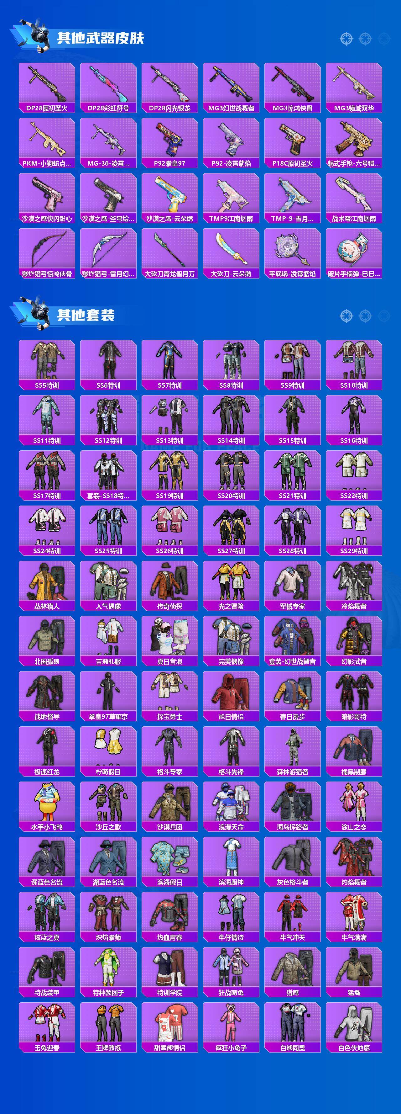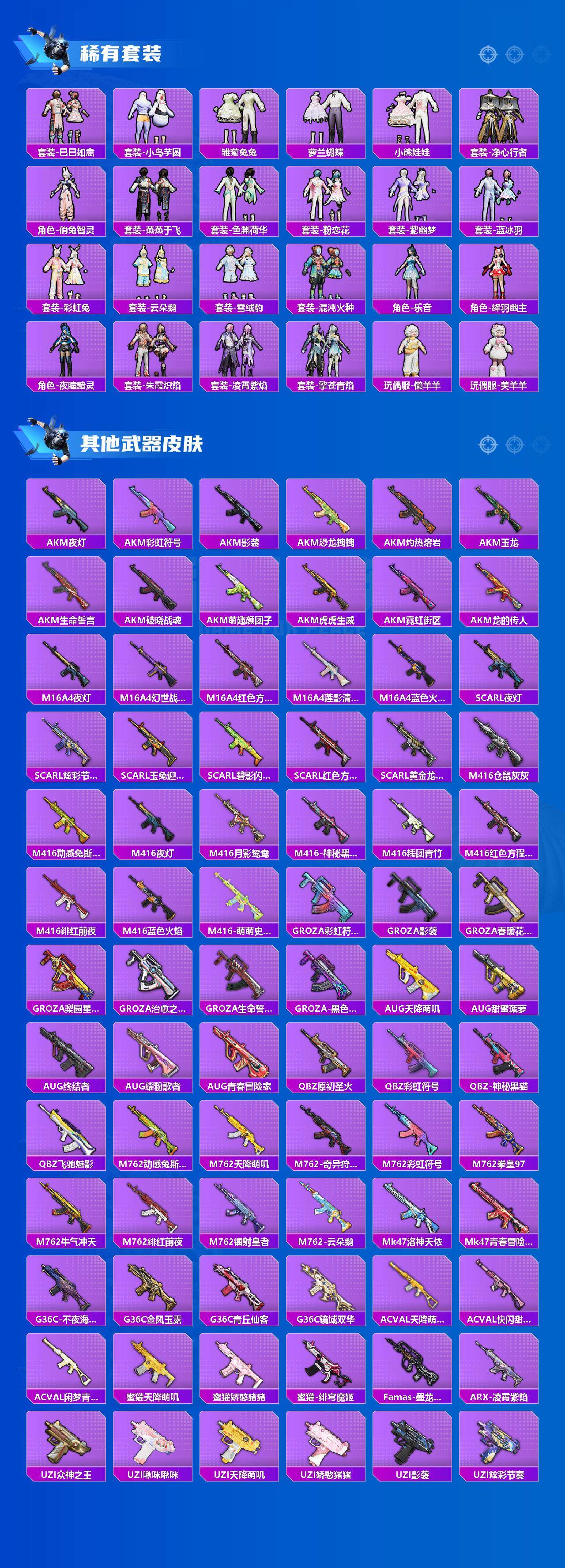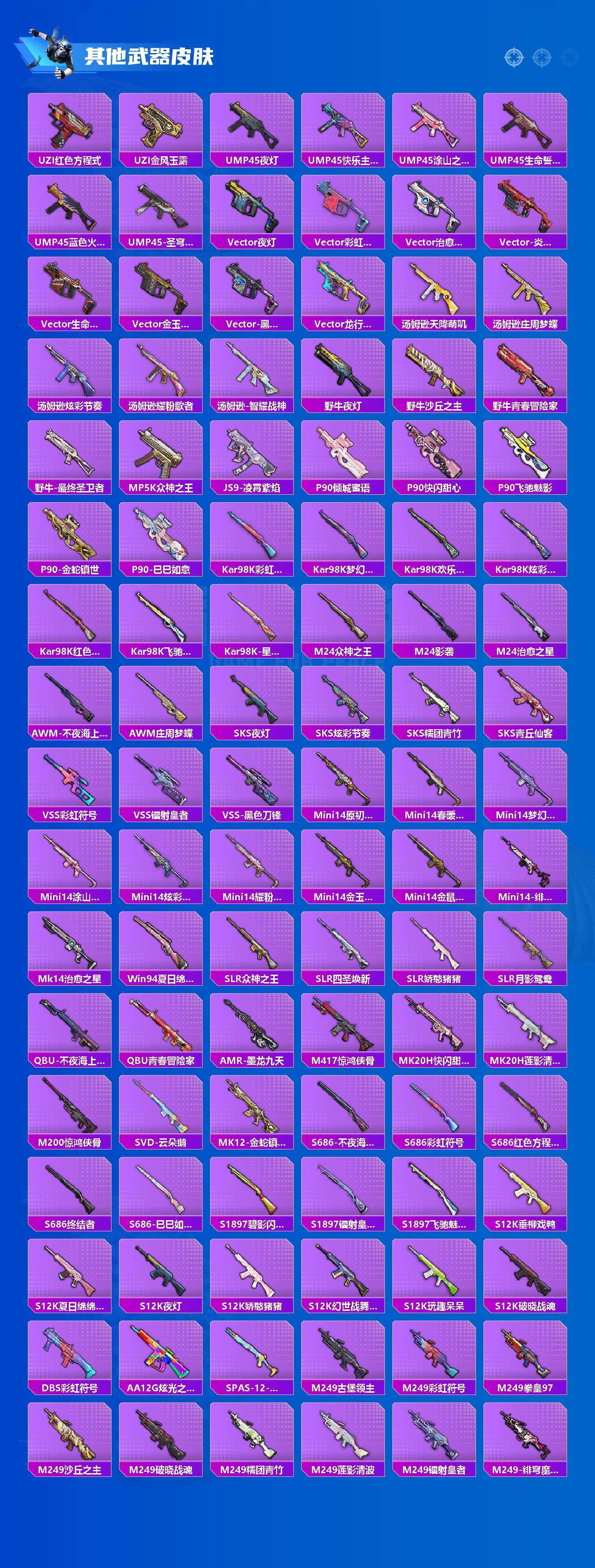 【粉色枪皮】:SCAR-L-梦幻火箭,SCAR-L-天蓬元帅,SCAR-L-万古烈焰,SCAR-L-金蛇镇世,M416-超新星,AUG-暖羊咩咩,蜜獾-异瞳寒姬,Vector-绯穹魔姬,Kar98K-巳巳如意,Mk14-甜梦熊击,DP-28-豹影疾电,平底锅-桃粉嫣然