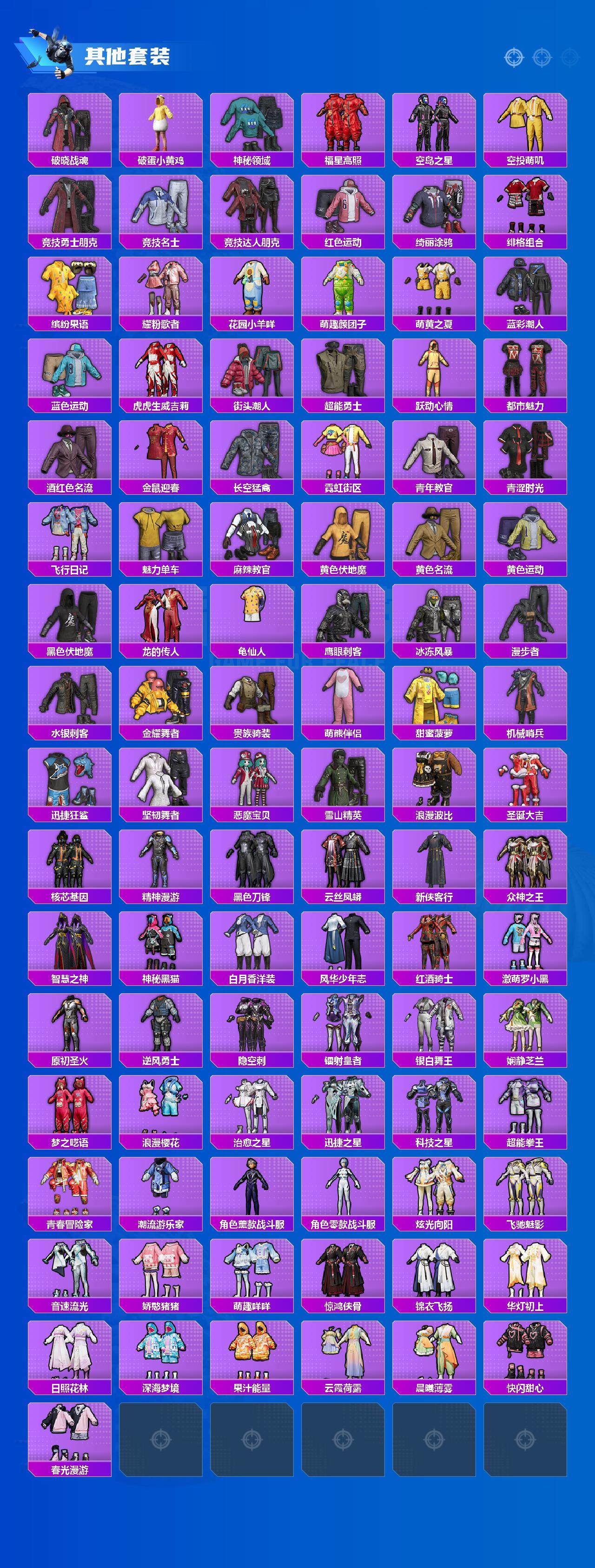 【粉色套装】:粉装-雪国幻梦,粉装-梦幻火箭,粉装-金风玉露,粉装-智能音符,粉装-绚金战神,粉装-星之彼岸,角色-零号机款机体服,粉装-岚岚物语,粉装-炫光之旅,粉装-牧神之羯,角色-宙之时溯,角色-星云暗核,粉装-莲影清波,角色-绯穹魔姬