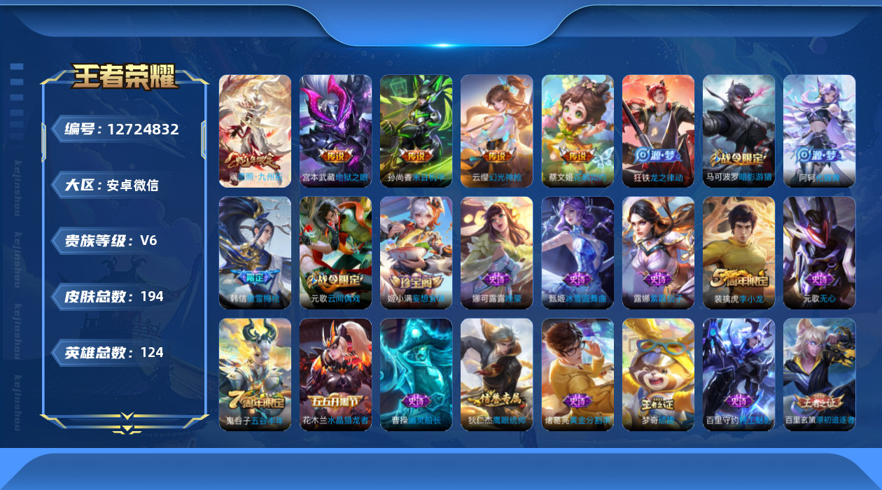 [12724832]安卓WX-V6-永恒钻石III段位-124英雄-194皮肤-0典藏-0珍品无双-0无双-0珍品传说-5传说-37史诗