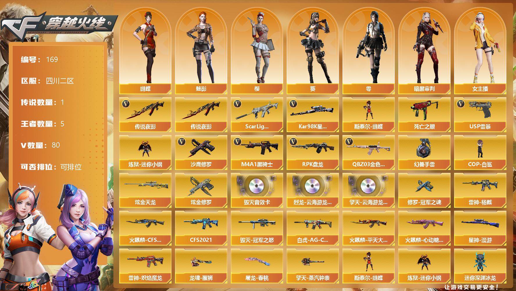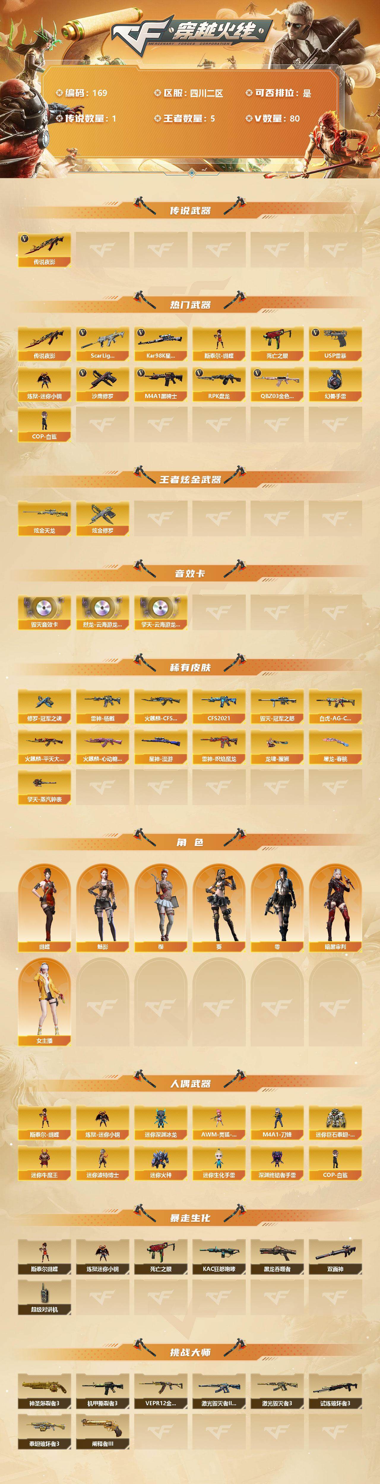 [12725240]四川二区-80V-5王者-2炫金 【传说武器】:传说夜影 【热门武器】:传说夜影,QBZ03-金色蔷薇,Scar Light-白虎,死亡之眼,Kar98K-星神,炼狱-迷你小钢,M4A1-黑骑士*4,RPK-盘龙,斯泰尔-蝴蝶,COP-白鲨*2,USP-雷暴,沙鹰-修罗*3,高爆手雷-幻兽*5 【王者炫金武器】:炫金天龙,炫金修罗 【音效卡】:烈龙-云海游龙音效卡,擎天-云海游龙音效卡,Barrett-毁灭音效卡 【稀有皮肤】:星神-漫游,白虎-AG-CFPLS20冠军,雷神-杨戬,雷神-炽焰魔龙,火麒麟-CFS2018,火麒麟-平天大圣,火麒麟-心动糖果,黑骑士-CFS2021,毁灭-冠军之怒,修罗-冠军之魂,屠龙-春桃 皮肤,擎天-蒸汽钟表 皮肤,龙啸-醒狮 皮肤 【角色】:零,葵,樱,蝴蝶,魅影,女主播,暗黑审判 【人偶武器】:COP-白鲨*2,斯泰尔-蝴蝶,AWM-灵狐-15周年嘉年华,M4A1-刀锋,炼狱-迷你小钢,迷你深渊冰龙,迷你巨石泰坦-魔花研究所,迷你牛魔王,迷你波特博士,迷你火种,迷你生化手雷,深渊终结者手雷*2 【暴走生化】:斯泰尔-蝴蝶,炼狱-迷你小钢,死亡之眼,KAC-狂怒咆哮,黑龙吞噬者,双面神,超级对讲机 【挑战大师】:神圣爆裂者III,机甲撕裂者III,阐释者III*2,试炼破坏者III,激光毁灭者III,AK47-泰坦破坏者III,VEPR-12-金魔,激光毁灭者III-白马银枪 【英雄级武器】:唐刀-神工天巧,USP-雷暴,QBZ95-幻兽,沙鹰-幻兽*5,女皇利刃-幻兽,QBZ03-金色蔷薇,Scar Light-白虎,无影-神兵利器,M4A1-雷神,M4A1-黑骑士*4,RPK-盘龙,AK47-麒麟,AK47-火麒麟,AK47-黑武士,AWM-天龙,Barrett-毁灭,AWM-裁决,QBZ03-天罚,Kar98K-星神,M4A1-猎神,M4A1-千变,黑武士-锦绣游龙,沙鹰-天神,沙鹰-修罗*3,麒麟刺,擎天,龙啸,屠龙*6,擎天-云海游龙,高爆手雷-幻兽*5 【特殊枪械】:蝴蝶斯泰尔+0烈龙,1白虎,4黑骑士,1盘龙,1蝴蝶斯泰尔