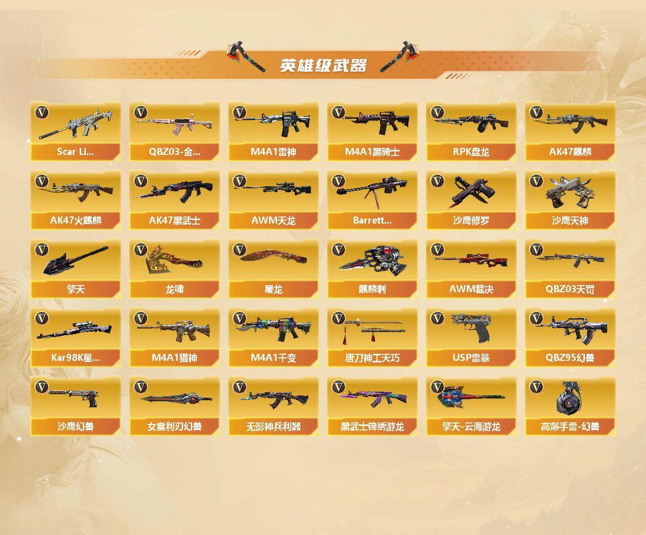 【英雄级武器】:唐刀-神工天巧,USP-雷暴,QBZ95-幻兽,沙鹰-幻兽*5,女皇利刃-幻兽,QBZ03-金色蔷薇,Scar Light-白虎,无影-神兵利器,M4A1-雷神,M4A1-黑骑士*4,RPK-盘龙,AK47-麒麟,AK47-火麒麟,AK47-黑武士,AWM-天龙,Barrett-毁灭,AWM-裁决,QBZ03-天罚,Kar98K-星神,M4A1-猎神,M4A1-千变,黑武士-锦绣游龙,沙鹰-天神,沙鹰-修罗*3,麒麟刺,擎天,龙啸,屠龙*6,擎天-云海游龙,高爆手雷-幻兽*5