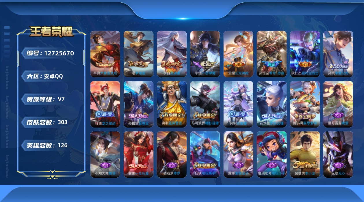 [12725670]安卓Q-V4-永恒钻石III段位-126英雄-303皮肤-1典藏-0珍品无双-0无双-0珍品传说-7传说-82史诗