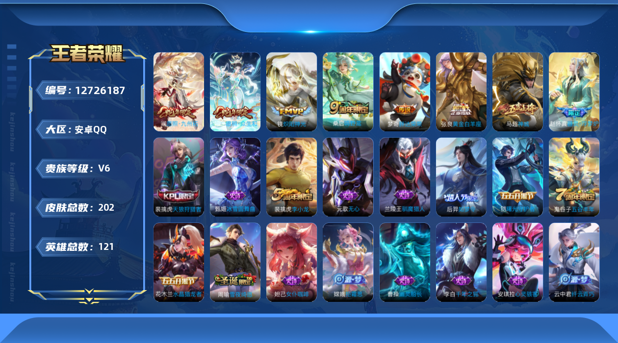 [12726187]安卓Q-V6-至尊星耀II段位-121英雄-202皮肤-0典藏-0珍品无双-0无双-0珍品传说-6传说-57史诗