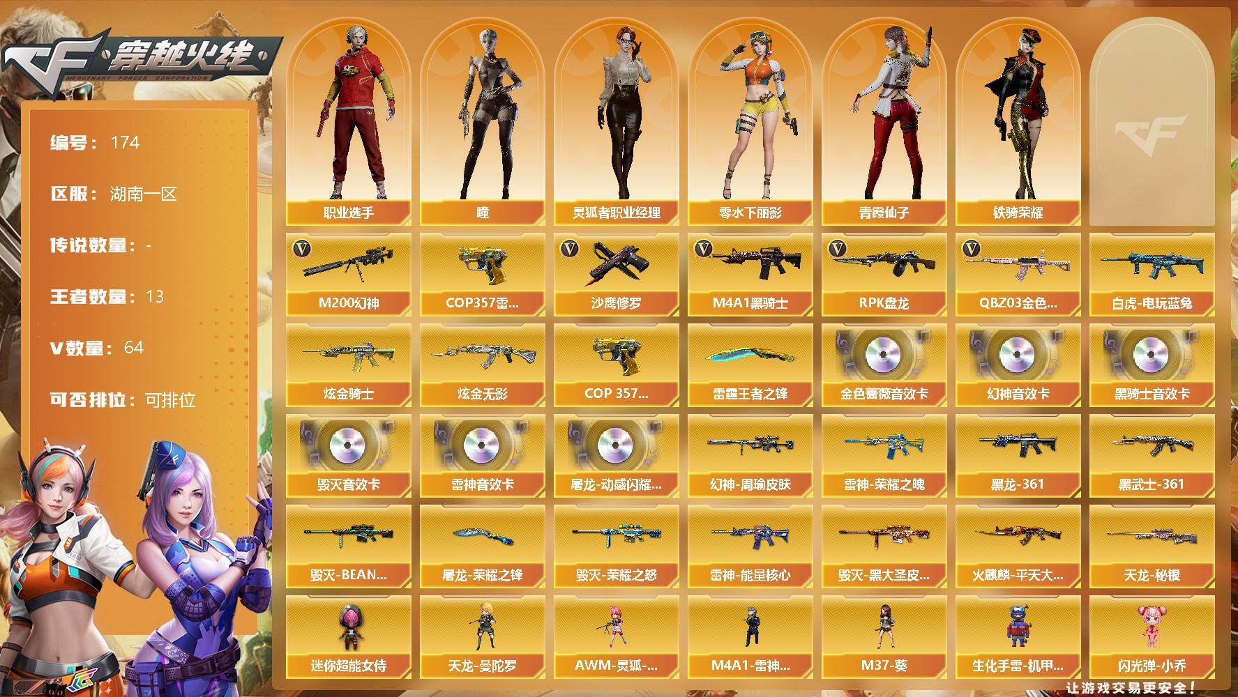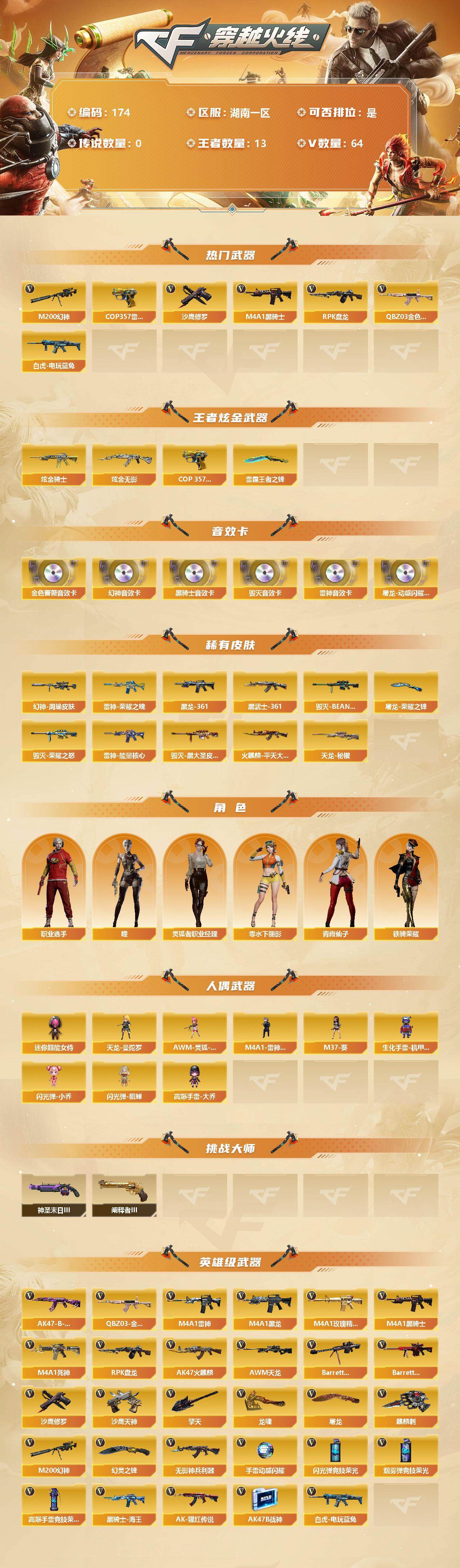 [12737153]湖南一区-64V-13王者-2炫金 【热门武器】:QBZ03-金色蔷薇,M200-幻神,白虎-电玩蓝兔,M4A1-黑骑士*2,RPK-盘龙,COP 357-雷霆王者,沙鹰-修罗*5 【王者炫金武器】:炫金骑士,炫金无影,COP 357-雷霆王者,雷霆王者之锋 【音效卡】:屠龙-动感闪耀 音效卡,M200-幻神音效卡,M4A1-雷神音效卡,M4A1-黑骑士音效卡,Barrett-毁灭音效卡,QBZ03-金色蔷薇音效卡 【稀有皮肤】:幻神-周瑜皮肤,雷神-能量核心,雷神-荣耀之魄,火麒麟-平天大圣,M4A1-黑龙-361,毁灭-荣耀之怒,毁灭-BEAN-2020MVP,毁灭-黑大圣皮肤,天龙-秘银,AK47-黑武士-361,屠龙-荣耀之锋 【角色】:灵狐者-职业经理,零-水下丽影,瞳,铁骑荣耀,职业选手,青霞仙子 【人偶武器】:天龙-曼陀罗,AWM-灵狐-15周年嘉年华,M4A1-雷神-精英刀锋,M37-葵,迷你超能女侍,生化手雷-机甲核心,闪光弹-小乔,闪光弹-貂蝉,高爆手雷-大乔 【挑战大师】:神圣爆裂者-末日III*3,阐释者III 【英雄级武器】:高爆手雷-竞技荣光,烟雾弹-竞技荣光,闪光弹-竞技荣光,幻灵之锋*3,手雷-动感闪耀,QBZ03-金色蔷薇,白虎-电玩蓝兔,无影-神兵利器,M4A1-雷神,M4A1-黑龙,M4A1-玫瑰精灵,M4A1-黑骑士*2,M4A1-死神*2,RPK-盘龙,AK47-火麒麟*2,AWM-天龙,Barrett-毁灭,Barrett-极光*3,M200-幻神,黑骑士-海王,AK-47-猩红传说*5,AK47-B-战神,AK47-B-常胜将军,沙鹰-天神*2,沙鹰-修罗*5,麒麟刺,擎天*2,龙啸,屠龙*4 【特殊枪械】:2黑骑士,1盘龙