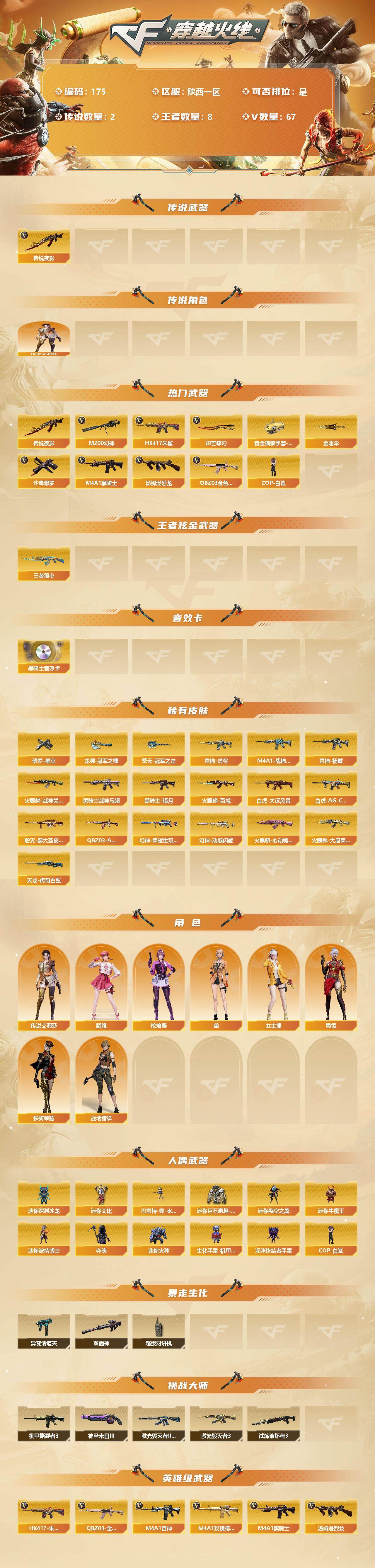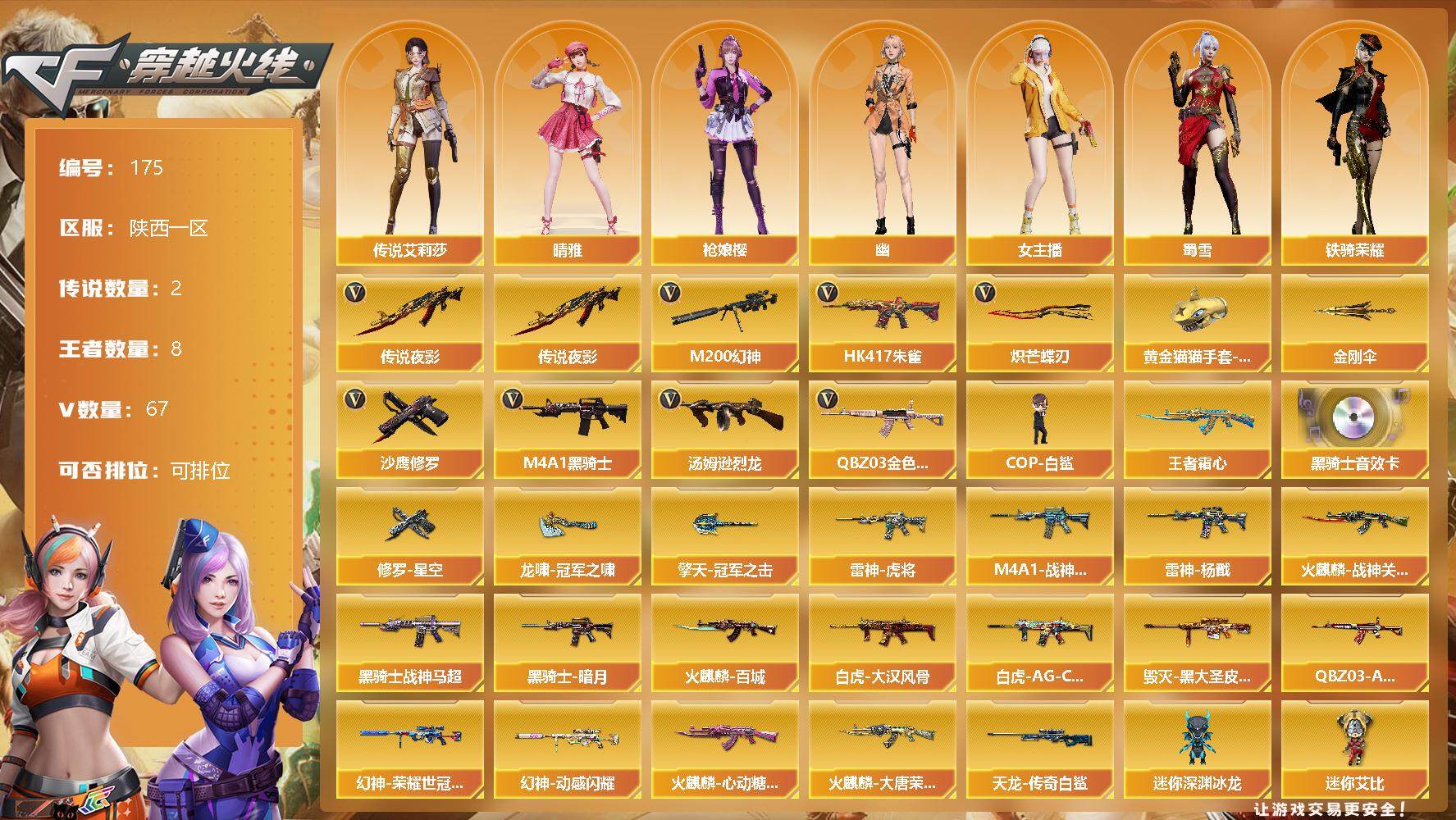 [12737201]陕西一区-67V-8王者-0炫金 【传说武器】:传说夜影 【传说角色】:传说艾莉莎 【热门武器】:传说夜影,QBZ03-金色蔷薇,HK417-朱雀,M200-幻神*2,M4A1-黑骑士,汤姆逊-烈龙*2,COP-白鲨,沙鹰-修罗*5,炽芒蝶刃,黄金猫猫手套-白鲨,金刚伞 【王者炫金武器】:王者霜心 【音效卡】:M4A1-黑骑士音效卡 【稀有皮肤】:M200-幻神-荣耀世冠白鲨,幻神-动感闪耀 皮肤,白虎-大汉风骨,白虎-AG-CFPLS20冠军,QBZ03-AG-CFPLS19冠军,雷神-虎将,M4A1-战神赵云,雷神-杨戬,火麒麟-战神关羽,火麒麟-百城,火麒麟-大唐荣光,火麒麟-心动糖果,黑骑士-暗月,黑骑士-战神马超,毁灭-黑大圣皮肤,AWM-天龙-传奇白鲨,修罗-星空,擎天-冠军之击,龙啸-冠军之啸 【角色】:传说艾莉莎,幽,枪娘樱,晴雅,战地猎狐,蜀雪,女主播,铁骑荣耀 【人偶武器】:COP-白鲨,巴雷特-零-水下丽影,迷你深渊冰龙*3,迷你艾比,迷你巨石泰坦-魔花研究所,迷你裂空之翼*2,迷你牛魔王,迷你波特博士*14,夺魂*2,迷你火种*2,生化手雷-机甲核心*2,深渊终结者手雷*2 【暴走生化】:异变清道夫,双面神,超级对讲机 【挑战大师】:机甲撕裂者III,神圣爆裂者-末日III*2,试炼破坏者III,激光毁灭者III,激光毁灭者III-白马银枪 【英雄级武器】:USP-神工天巧*2,唐刀-神工天巧,M4A1-武圣,烈火-动感闪耀,天神-动感闪耀,屠龙-动感闪耀,手雷-动感闪耀,QBZ03-金色蔷薇,HK417-朱雀,无影-神兵利器,M4A1-雷神,M4A1-玫瑰精灵,M4A1-黑骑士,汤姆逊-烈龙*2,AK47-麒麟,AK47-火麒麟*2,AN94-超新星,AWM-天龙,Barrett-毁灭,AK47-机械迷城,QBZ03-天罚,M200-幻神*2,黑骑士-海王*2,死神-雪域霜狐,AK-47-猩红传说,M4A1-赤狱骑士,沙鹰-修罗*5,炽芒蝶刃,麒麟刺,擎天,龙啸,屠龙 【特殊枪械】:1黑骑士,2烈龙
