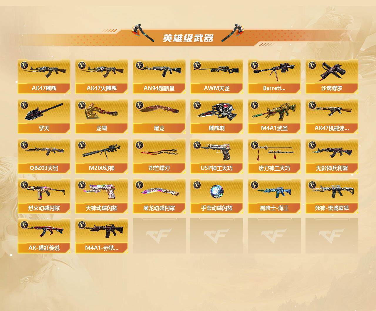 【英雄级武器】:USP-神工天巧*2,唐刀-神工天巧,M4A1-武圣,烈火-动感闪耀,天神-动感闪耀,屠龙-动感闪耀,手雷-动感闪耀,QBZ03-金色蔷薇,HK417-朱雀,无影-神兵利器,M4A1-雷神,M4A1-玫瑰精灵,M4A1-黑骑士,汤姆逊-烈龙*2,AK47-麒麟,AK47-火麒麟*2,AN94-超新星,AWM-天龙,Barrett-毁灭,AK47-机械迷城,QBZ03-天罚,M200-幻神*2,黑骑士-海王*2,死神-雪域霜狐,AK-47-猩红传说,M4A1-赤狱骑士,沙鹰-修罗*5,炽芒蝶刃,麒麟刺,擎天,龙啸,屠龙