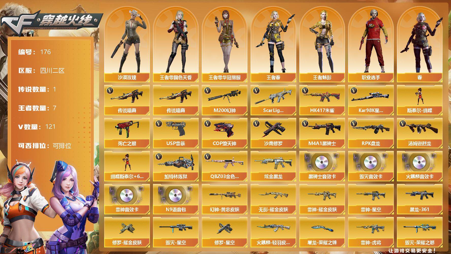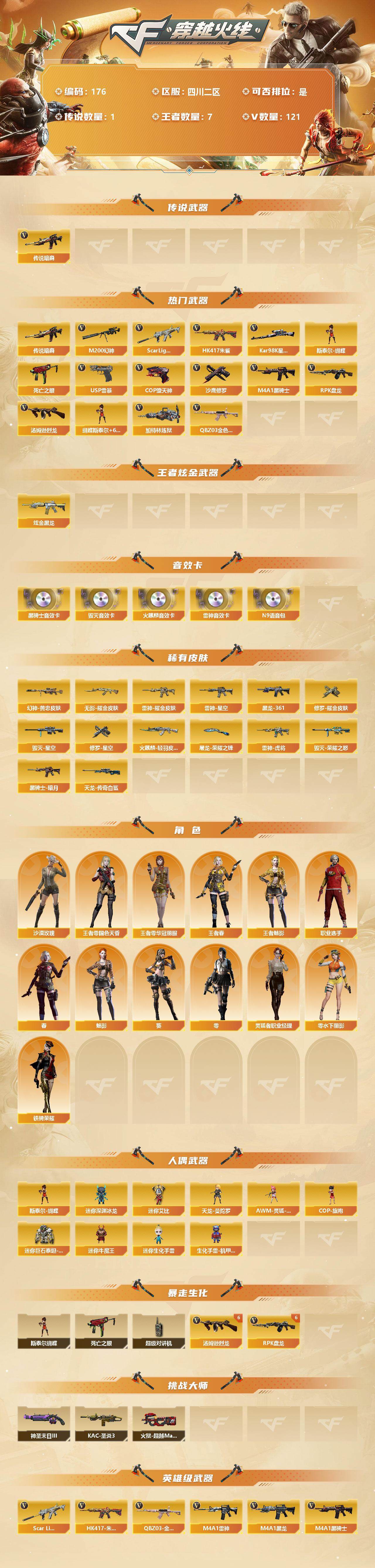 [12737266]四川二区-121V-7王者-2炫金 【传说武器】:传说暗裔 【热门武器】:传说暗裔,QBZ03-金色蔷薇,Scar Light-白虎,HK417-朱雀,M200-幻神,死亡之眼,Kar98K-星神,M4A1-黑骑士,汤姆逊-烈龙*7,RPK-盘龙*6,加特林-炼狱*2,斯泰尔-蝴蝶,USP-雷暴*2,COP-堕天神,沙鹰-修罗*3 【王者炫金武器】:炫金黑龙*2 【音效卡】:AK47-火麒麟音效卡,M4A1-雷神音效卡,M4A1-黑骑士音效卡,Barrett-毁灭音效卡,N9语音包 【稀有皮肤】:M200-幻神-黄忠皮肤,雷神-星空,雷神-虎将,雷神-耀金皮肤,火麒麟-轻羽皮肤,黑骑士-暗月,M4A1-黑龙-361,毁灭-荣耀之怒,毁灭-星空,AWM-天龙-传奇白鲨,无影耀金皮肤,修罗耀金皮肤,修罗-星空,屠龙-荣耀之锋 【角色】:王者零-华冠丽服,王者-零-国色天香,王者春,王者-魅影,灵狐者-职业经理,零-水下丽影,零,葵,魅影,春,沙漠玫瑰,铁骑荣耀,职业选手 【人偶武器】:斯泰尔-蝴蝶,天龙-曼陀罗,AWM-灵狐-15周年嘉年华,COP-旗袍,迷你深渊冰龙,迷你艾比,迷你巨石泰坦-魔花研究所,迷你牛魔王,迷你生化手雷,生化手雷-机甲核心 【暴走生化】:斯泰尔-蝴蝶,死亡之眼,超级对讲机 【挑战大师】:神圣爆裂者-末日III,KAC-圣炎切割者III,火狱乱世-超越Max 【英雄级武器】:Barrett-电竞装甲,柯尔特-电竞装甲*2,尼泊尔-电竞装甲,破空枪刃-夜魔,COP-堕天神,AK47-雷暴,USP-雷暴*2,斩神刀-雷暴,M4A1-武圣,Glock18-武圣,QBZ03-金色蔷薇,Scar Light-白虎,HK417-朱雀,M4A1-雷神,M4A1-黑龙,M4A1-黑骑士,RPK-盘龙*6,加特林-炼狱*2,汤姆逊-烈龙*7,AK47-无影,AK47-火麒麟,AK12-天启,AN94-超新星,AWM-天龙*2,Barrett-毁灭,Barrett-极光,M4A1-龙血,AA-12-雷霆,Kar98K-星神,Barrett-朱雀*2,M200-幻神,M4A1-千变,黑骑士-海王,沙鹰-天神*5,沙鹰-修罗*3,麒麟刺,擎天*2,龙啸*5,屠龙*3 【特殊枪械】:蝴蝶斯泰尔+6烈龙,1白虎,1黑骑士,6烈龙,6盘龙,2炼狱,1蝴蝶斯泰尔