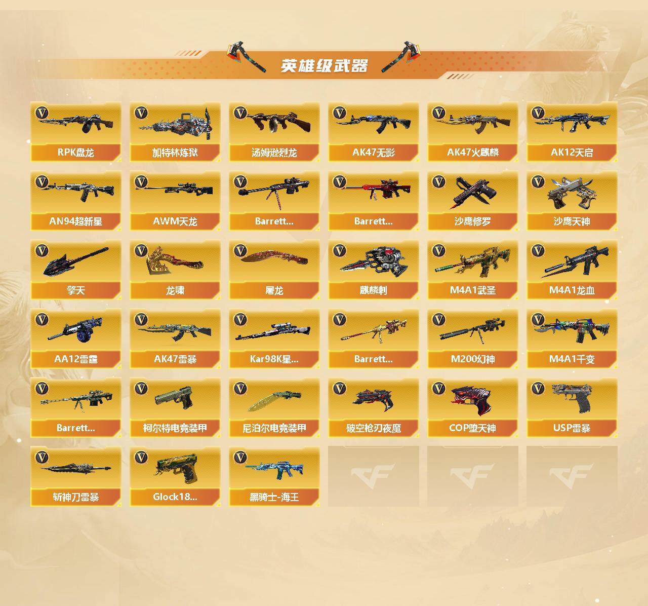 【英雄级武器】:Barrett-电竞装甲,柯尔特-电竞装甲*2,尼泊尔-电竞装甲,破空枪刃-夜魔,COP-堕天神,AK47-雷暴,USP-雷暴*2,斩神刀-雷暴,M4A1-武圣,Glock18-武圣,QBZ03-金色蔷薇,Scar Light-白虎,HK417-朱雀,M4A1-雷神,M4A1-黑龙,M4A1-黑骑士,RPK-盘龙*6,加特林-炼狱*2,汤姆逊-烈龙*7,AK47-无影,AK47-火麒麟,AK12-天启,AN94-超新星,AWM-天龙*2,Barrett-毁灭,Barrett-极光,M4A1-龙血,AA-12-雷霆,Kar98K-星神,Barrett-朱雀*2,M200-幻神,M4A1-千变,黑骑士-海王,沙鹰-天神*5,沙鹰-修罗*3,麒麟刺,擎天*2,龙啸*5,屠龙*3