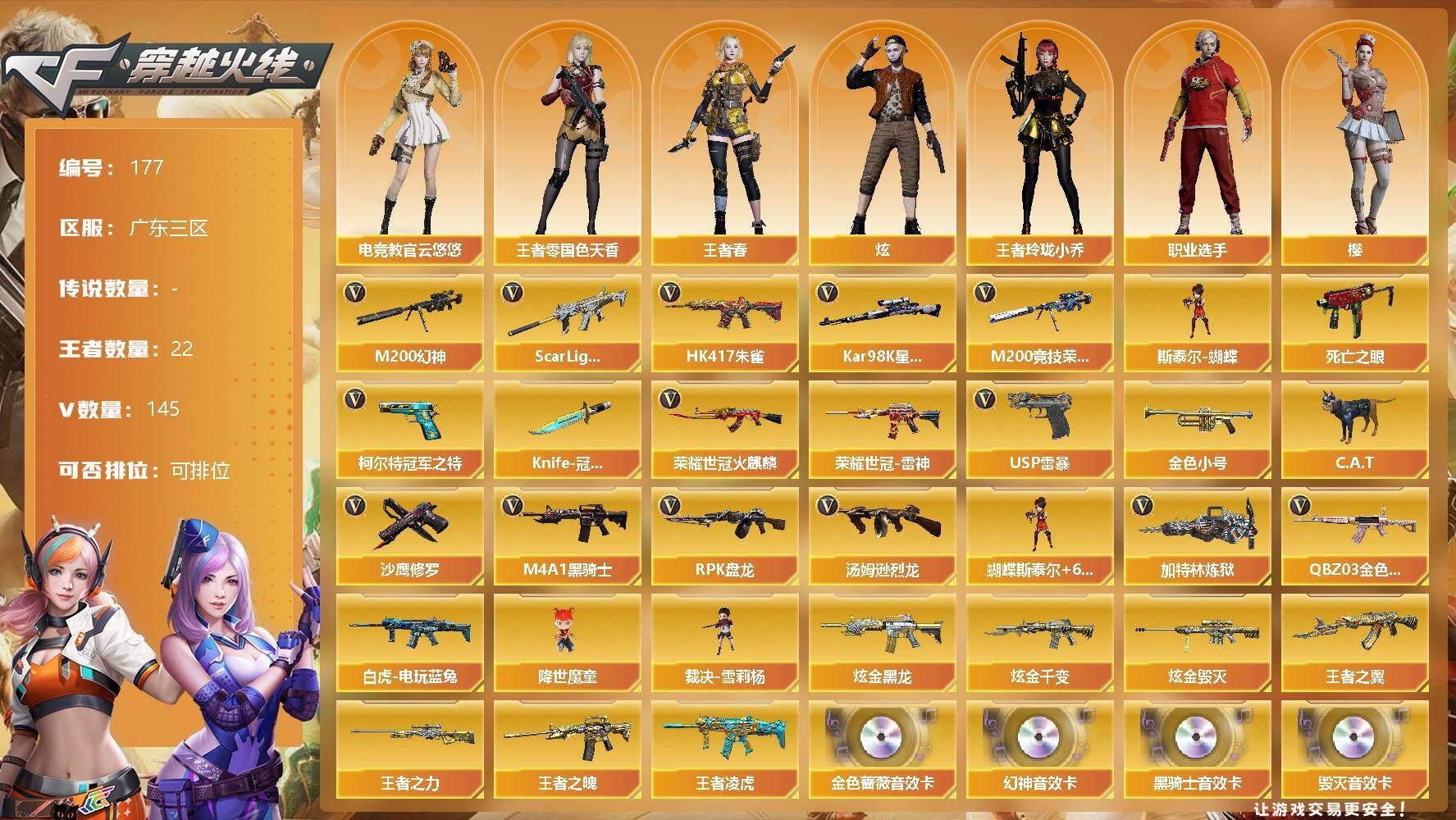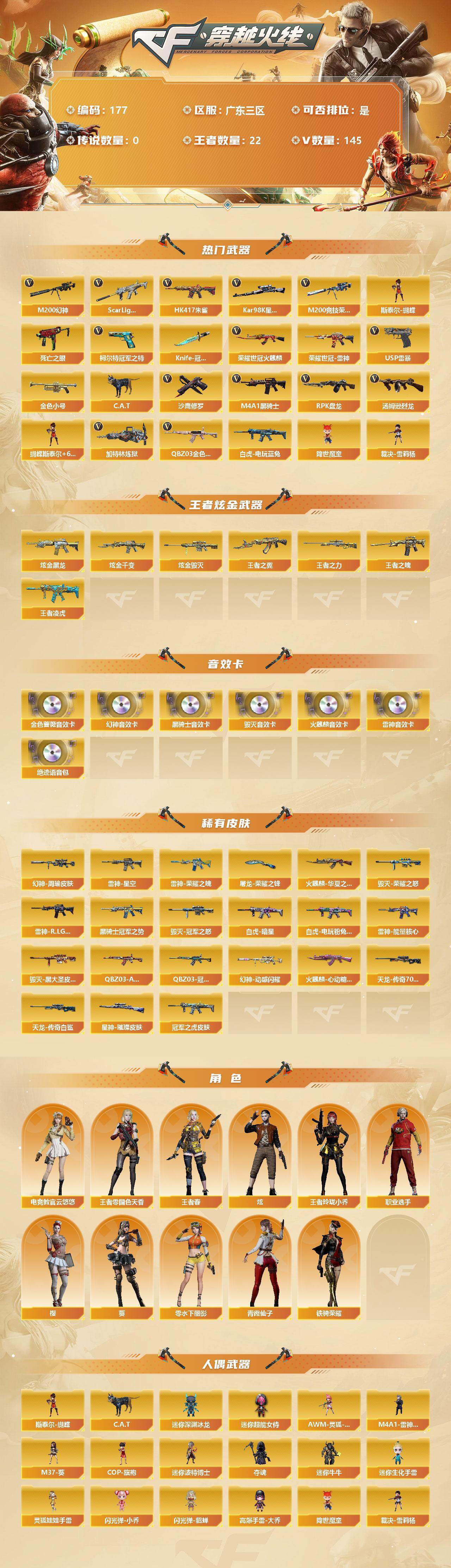 [12737313]广东三区-145V-22王者-3炫金 【热门武器】:QBZ03-金色蔷薇,Scar Light-白虎,HK417-朱雀,M200-幻神,M200-竞技荣光,死亡之眼,荣耀世冠-火麒麟,荣耀世冠-雷神,白虎-电玩蓝兔,柯尔特-冠军之特,Kar98K-星神,金色小号,C.A.T,M4A1-黑骑士*3,汤姆逊-烈龙*6,RPK-盘龙,加特林-炼狱,斯泰尔-蝴蝶,降世魔童,裁决-雪莉杨,USP-雷暴,沙鹰-修罗*5,Knife-冠军之刃 【王者炫金武器】:炫金黑龙,炫金千变,炫金毁灭,王者之翼,王者之力,王者之魄*2,王者凌虎 【音效卡】:M200-幻神音效卡,AK47-火麒麟音效卡,M4A1-雷神音效卡,M4A1-黑骑士音效卡,Barrett-毁灭音效卡,QBZ03-金色蔷薇音效卡,绝迹语音包 【稀有皮肤】:幻神-周瑜皮肤,幻神-动感闪耀 皮肤,星神-璀璨皮肤,Scar Light-白虎-暗星,白虎-电玩粉兔皮肤,ScarLight-白虎-冠军之虎皮肤,QBZ03-冠军之薇,QBZ03-AG-CFPLS19冠军,雷神-能量核心,雷神-荣耀之魄,雷神-星空,雷神-R.LGD-CFPLS18冠军,火麒麟-华夏之心,火麒麟-心动糖果,黑骑士-冠军之势,毁灭-荣耀之怒,毁灭-冠军之怒,毁灭-黑大圣皮肤,AWM-天龙-传奇70KG,AWM-天龙-传奇白鲨,屠龙-荣耀之锋 【角色】:王者-零-国色天香,王者春,王者玲珑-小乔,零-水下丽影,葵,樱,炫,电竞教官-云悠悠,铁骑荣耀,职业选手,青霞仙子 【人偶武器】:降世魔童,裁决-雪莉杨,斯泰尔-蝴蝶,AWM-灵狐-15周年嘉年华,M4A1-雷神-精英刀锋,M37-葵,COP-旗袍,C.A.T,迷你深渊冰龙*2,迷你超能女侍,迷你波特博士,夺魂,迷你牛牛,迷你生化手雷,灵狐娃娃手雷,闪光弹-小乔,闪光弹-貂蝉,高爆手雷-大乔 【暴走生化】:斯泰尔-蝴蝶,死亡之眼,超级对讲机 【挑战大师】:神圣爆裂者III,神圣爆裂者-末日III*2,阐释者III,试炼破坏者III,激光毁灭者III,冰龙粉碎者-白马银枪*2,致命乱世-超越Max 【英雄级武器】:M200-竞技荣光,柯尔特-竞技荣光,擎天-竞技荣光*3,高爆手雷-竞技荣光*9,烟雾弹-竞技荣光*8,闪光弹-竞技荣光*9,马来剑-夜魔,USP-雷暴,斩神刀-雷暴,荣耀世冠-火麒麟,荣耀世