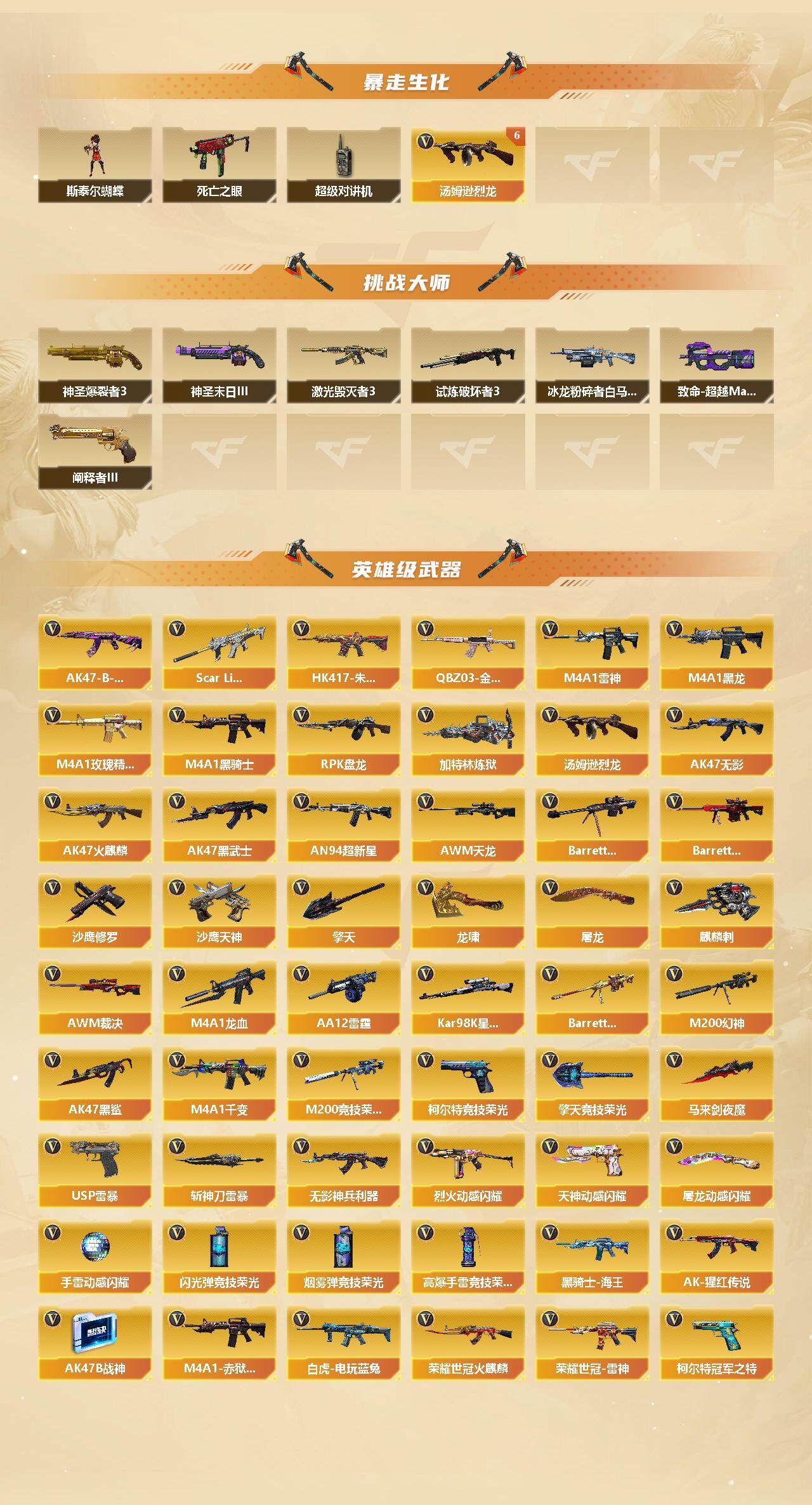 【热门武器】:QBZ03-金色蔷薇,Scar Light-白虎,HK417-朱雀,M200-幻神,M200-竞技荣光,死亡之眼,荣耀世冠-火麒麟,荣耀世冠-雷神,白虎-电玩蓝兔,柯尔特-冠军之特,Kar98K-星神,金色小号,C.A.T,M4A1-黑骑士*3,汤姆逊-烈龙*6,RPK-盘龙,加特林-炼狱,斯泰尔-蝴蝶,降世魔童,裁决-雪莉杨,USP-雷暴,沙鹰-修罗*5,Knife-冠军之刃