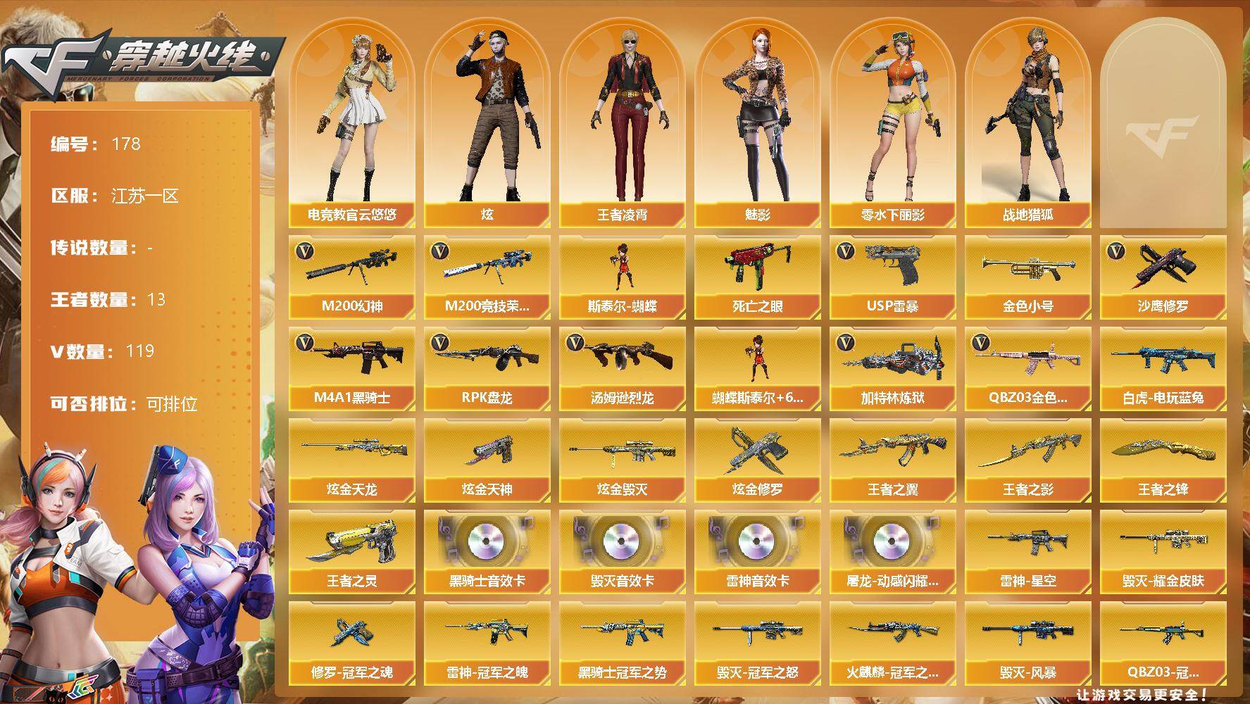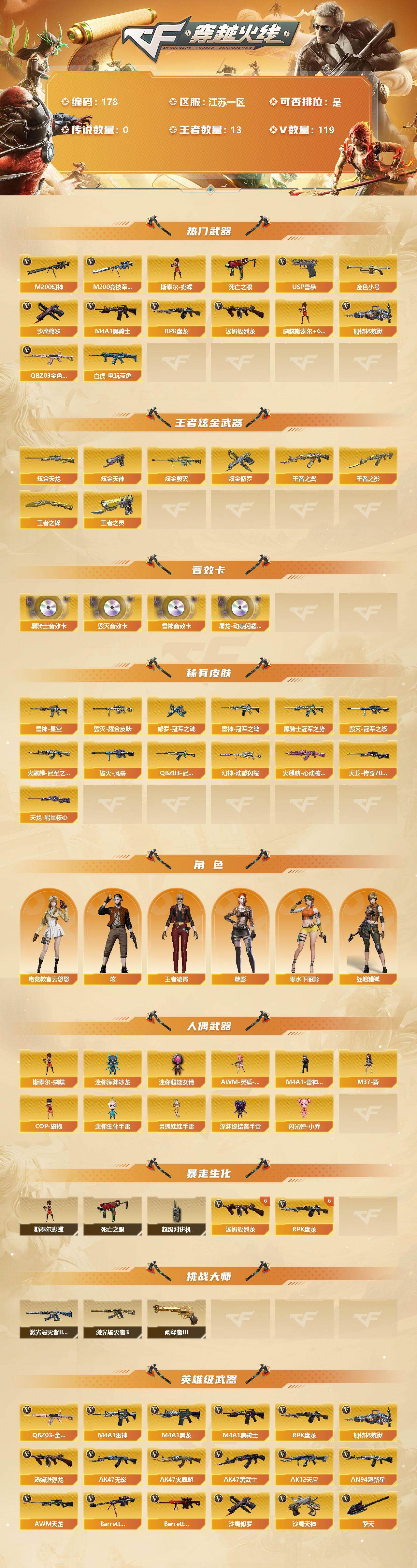 [12737385]江苏一区-119V-13王者-7炫金 【热门武器】:QBZ03-金色蔷薇,M200-幻神,M200-竞技荣光,死亡之眼*3,白虎-电玩蓝兔,金色小号,M4A1-黑骑士*3,汤姆逊-烈龙*10,RPK-盘龙*6,加特林-炼狱,斯泰尔-蝴蝶,USP-雷暴,沙鹰-修罗*4 【王者炫金武器】:炫金天龙,炫金天神*3,炫金毁灭,炫金修罗*2,王者之翼,王者之影,王者之灵,王者之锋 【音效卡】:屠龙-动感闪耀 音效卡,M4A1-雷神音效卡,M4A1-黑骑士音效卡,Barrett-毁灭音效卡 【稀有皮肤】:幻神-动感闪耀 皮肤,QBZ03-冠军之薇,雷神-星空,雷神-冠军之魄,火麒麟-冠军之心,火麒麟-心动糖果,黑骑士-冠军之势,毁灭耀金皮肤,毁灭-冠军之怒,毁灭-风暴,天龙-能量核心,AWM-天龙-传奇70KG,修罗-冠军之魂 【角色】:王者凌霄,零-水下丽影,魅影,炫,电竞教官-云悠悠,战地猎狐 【人偶武器】:斯泰尔-蝴蝶,AWM-灵狐-15周年嘉年华,M4A1-雷神-精英刀锋,M37-葵,COP-旗袍,迷你深渊冰龙,迷你超能女侍,迷你生化手雷,灵狐娃娃手雷,深渊终结者手雷,闪光弹-小乔 【暴走生化】:斯泰尔-蝴蝶,死亡之眼*3,超级对讲机 【挑战大师】:阐释者III,激光毁灭者III,激光毁灭者III-白马银枪*2 【英雄级武器】:M200-竞技荣光,柯尔特-竞技荣光,擎天-竞技荣光,高爆手雷-竞技荣光*2,烟雾弹-竞技荣光*3,闪光弹-竞技荣光*2,柯尔特-电竞装甲,麒麟刺-堕天神,USP-雷暴,M4A1-雷霆,M4A1-武圣,烈火-动感闪耀,天神-动感闪耀,屠龙-动感闪耀,手雷-动感闪耀,QBZ03-金色蔷薇,白虎-电玩蓝兔,无影-神兵利器,M4A1-雷神*3,M4A1-黑龙*3,M4A1-黑骑士*3,RPK-盘龙*6,加特林-炼狱,汤姆逊-烈龙*10,AK47-无影*2,AK47-火麒麟*2,AK47-黑武士*2,AK12-天启*2,AN94-超新星*2,AWM-天龙,Barrett-毁灭*2,Barrett-极光,AA-12-雷霆,Barrett-朱雀,M200-幻神,AK47-黑鲨,M4A1-猎神,M4A1-千变,AK47-B-战神,AWM-昌龙,M4A1-赤狱骑士,沙鹰-天神*2,沙鹰-修罗*4,麒麟刺*3,擎天*2,龙啸*4,屠龙*5 【特殊枪械】:蝴蝶斯泰