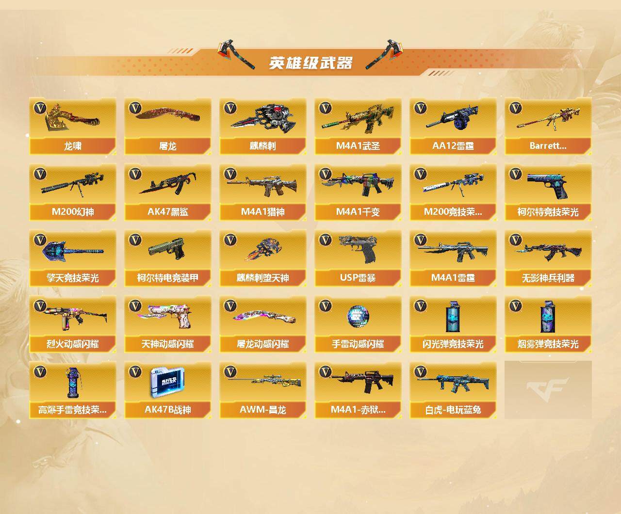 【英雄级武器】:M200-竞技荣光,柯尔特-竞技荣光,擎天-竞技荣光,高爆手雷-竞技荣光*2,烟雾弹-竞技荣光*3,闪光弹-竞技荣光*2,柯尔特-电竞装甲,麒麟刺-堕天神,USP-雷暴,M4A1-雷霆,M4A1-武圣,烈火-动感闪耀,天神-动感闪耀,屠龙-动感闪耀,手雷-动感闪耀,QBZ03-金色蔷薇,白虎-电玩蓝兔,无影-神兵利器,M4A1-雷神*3,M4A1-黑龙*3,M4A1-黑骑士*3,RPK-盘龙*6,加特林-炼狱,汤姆逊-烈龙*10,AK47-无影*2,AK47-火麒麟*2,AK47-黑武士*2,AK12-天启*2,AN94-超新星*2,AWM-天龙,Barrett-毁灭*2,Barrett-极光,AA-12-雷霆,Barrett-朱雀,M200-幻神,AK47-黑鲨,M4A1-猎神,M4A1-千变,AK47-B-战神,AWM-昌龙,M4A1-赤狱骑士,沙鹰-天神*2,沙鹰-修罗*4,麒麟刺*3,擎天*2,龙啸*4,屠龙*5