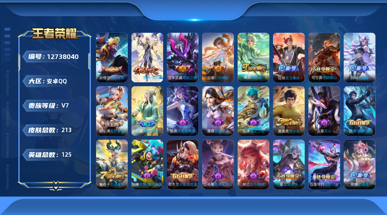 [12738040]安卓Q-V5-永恒钻石I段位-125英雄-213皮肤-1典藏-0珍品无双-0无双-0珍品传说-4传说-60史诗