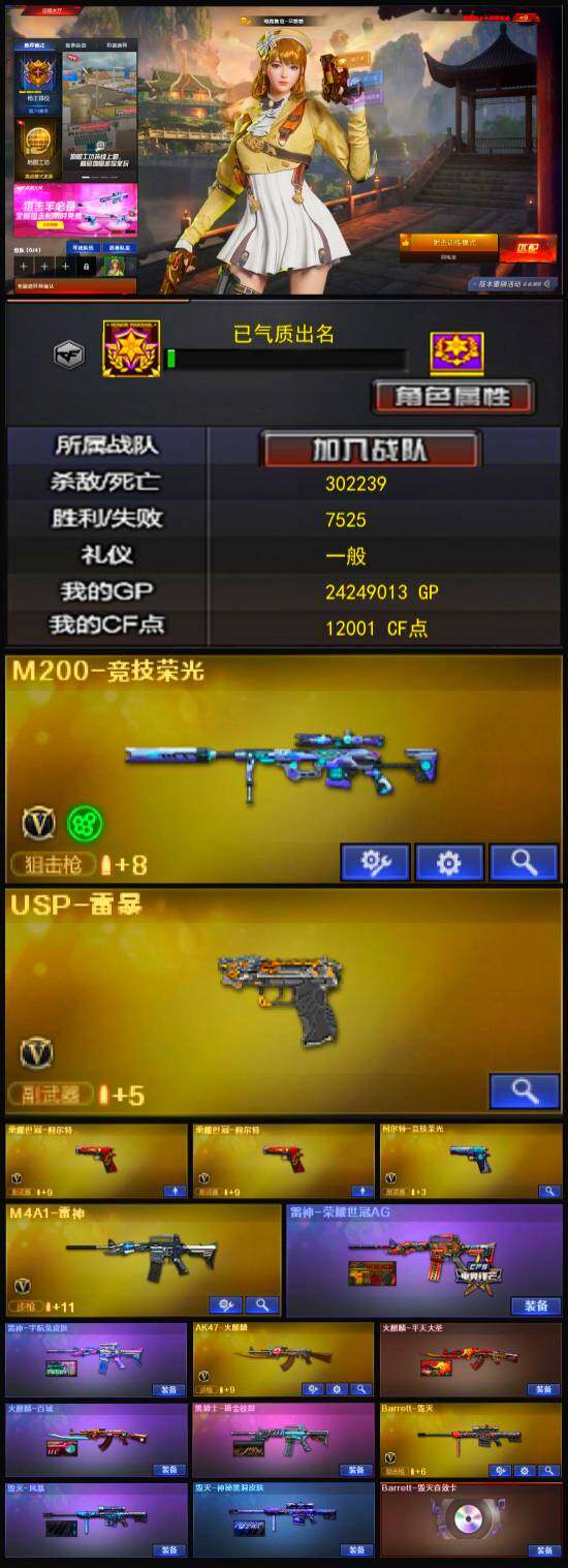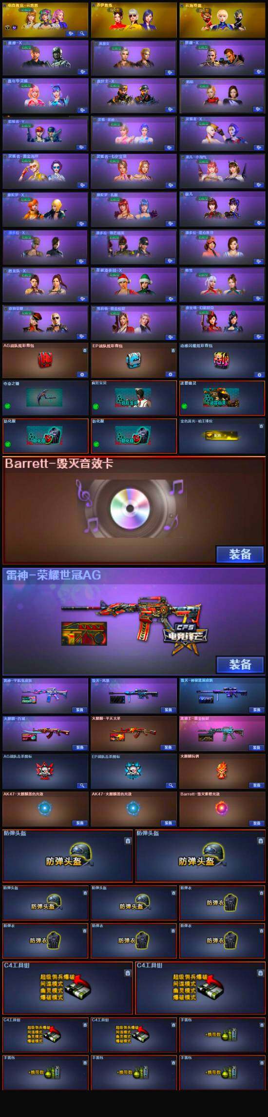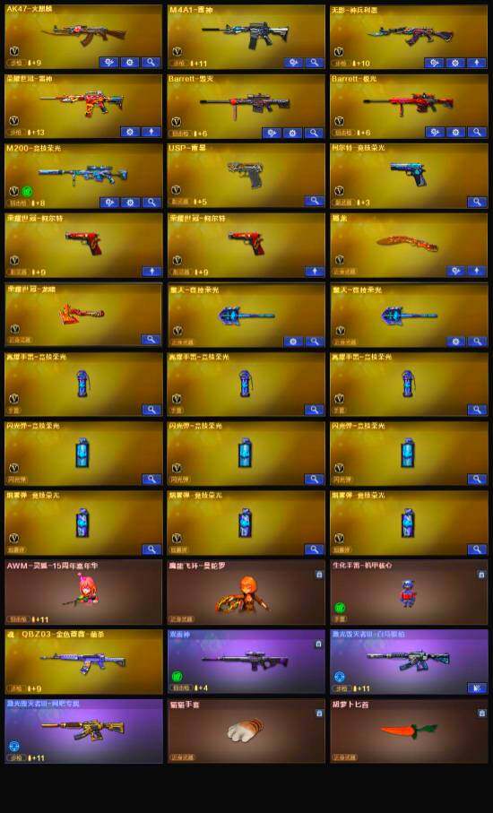 【英雄级武器】:M200-竞技荣光,柯尔特-竞技荣光,擎天-竞技荣光*2,高爆手雷-竞技荣光*3,烟雾弹-竞技荣光*3,闪光弹-竞技荣光*3,USP-雷暴,荣耀世冠-雷神,荣耀世冠-柯尔特*2,荣耀世冠-龙啸,无影-神兵利器,M4A1-雷神,AK47-火麒麟,Barrett-毁灭,Barrett-极光,屠龙