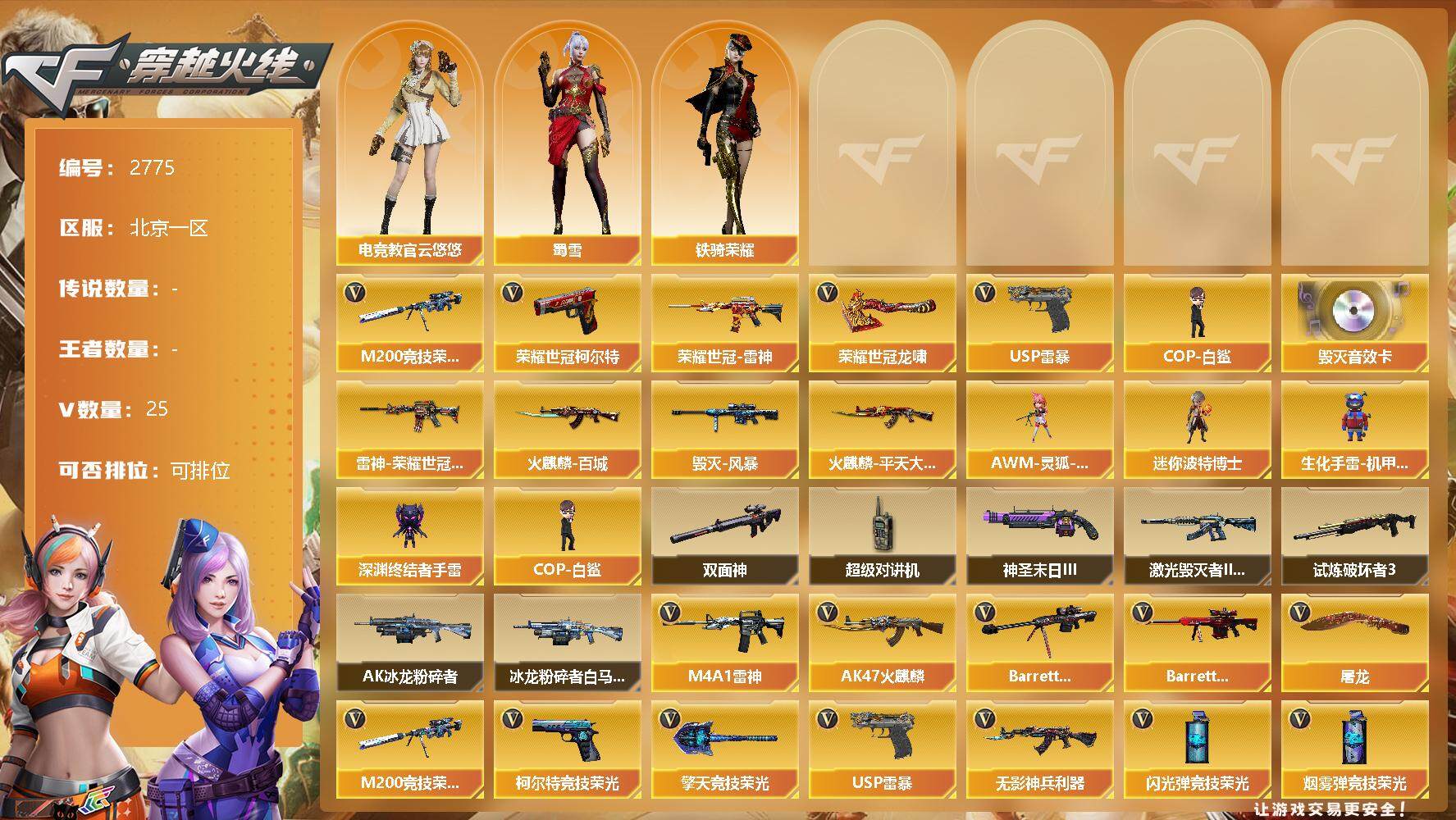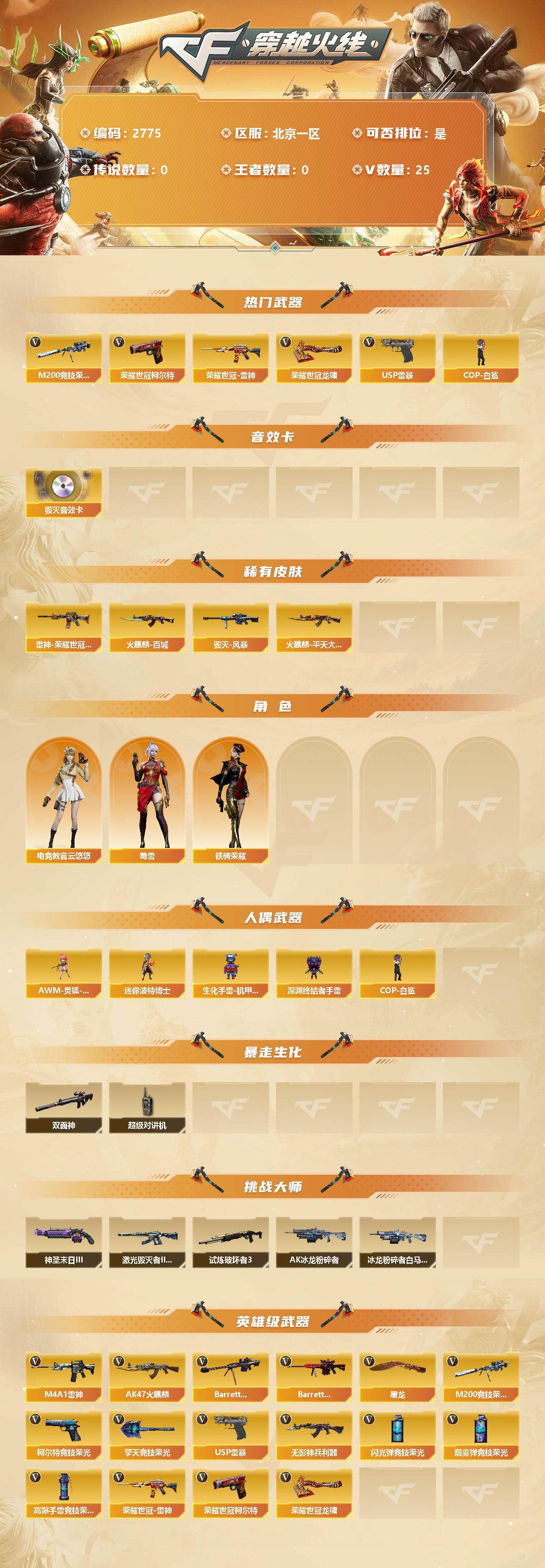 [12740058]北京一区-25V-0王者-0炫金 【热门武器】:M200-竞技荣光,荣耀世冠-雷神,荣耀世冠-柯尔特*2,COP-白鲨,USP-雷暴,荣耀世冠-龙啸 【音效卡】:Barrett-毁灭音效卡 【稀有皮肤】:雷神-荣耀世冠AG,火麒麟-平天大圣*2,火麒麟-百城,毁灭-风暴 【角色】:电竞教官-云悠悠,蜀雪,铁骑荣耀 【人偶武器】:COP-白鲨,AWM-灵狐-15周年嘉年华,迷你波特博士,生化手雷-机甲核心,深渊终结者手雷 【暴走生化】:双面神,超级对讲机 【挑战大师】:神圣爆裂者-末日III,试炼破坏者III,激光毁灭者III-白马银枪,AK47-冰龙粉碎者,冰龙粉碎者-白马银枪 【英雄级武器】:M200-竞技荣光,柯尔特-竞技荣光,擎天-竞技荣光*2,高爆手雷-竞技荣光*3,烟雾弹-竞技荣光*3,闪光弹-竞技荣光*3,USP-雷暴,荣耀世冠-雷神,荣耀世冠-柯尔特*2,荣耀世冠-龙啸,无影-神兵利器,M4A1-雷神,AK47-火麒麟,Barrett-毁灭,Barrett-极光,屠龙 【特殊枪械】: