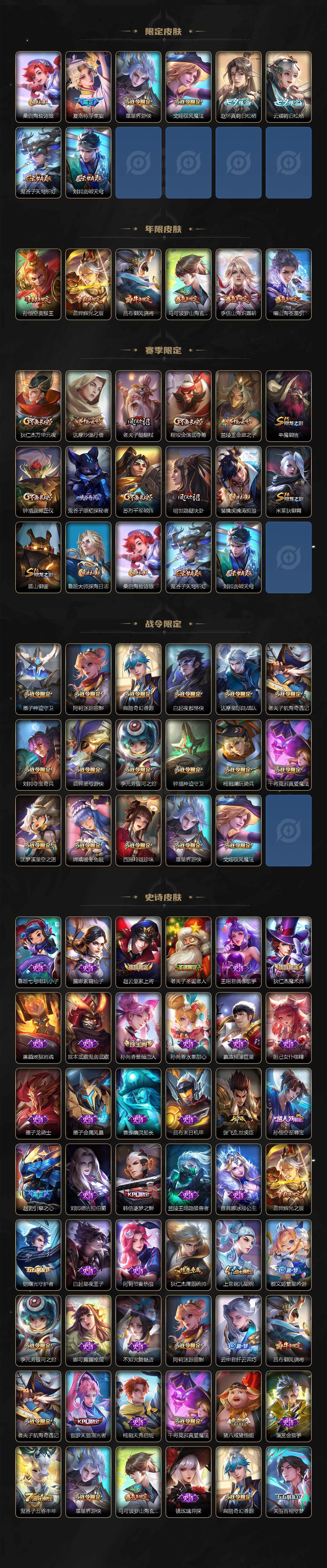 【赛季限定】:狄仁杰万华元夜,达摩沙漠行僧,老夫子醍醐杖,程咬金演武夺筹,兰陵王金庭之子,牛魔御旌,钟馗驱傩正仪,鬼谷子原初探秘者,苏烈千军破阵,弈星混沌棋,明世隐疑决卦,裴擒虎擒涛扼浪,米莱狄御霄,盾山御銮,鲁班大师探海日志,桑启海盐诗旅,鬼谷子天穹祈灯,刘邦剑破天穹