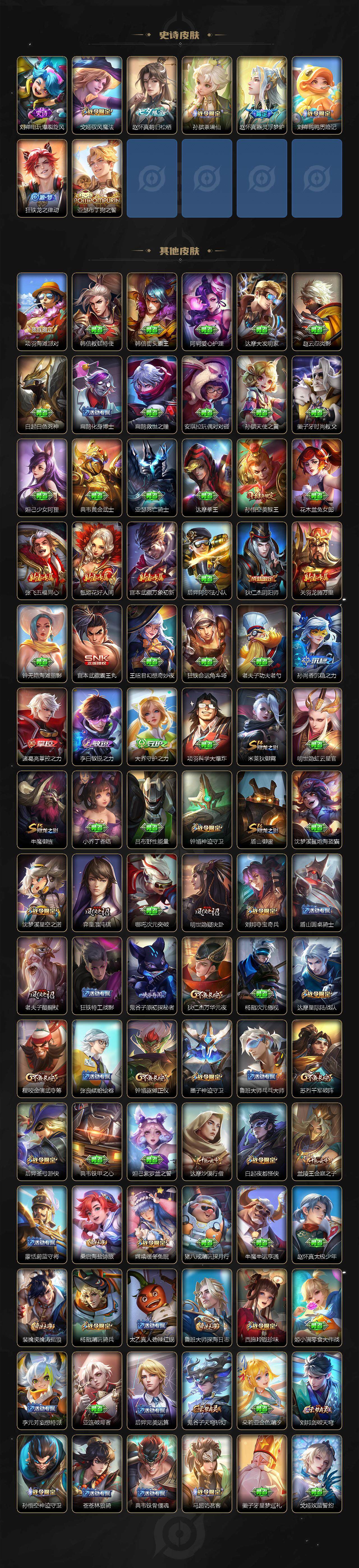 - [11516919]V10 3典藏 5无双 8珍品传说 65传说 125英雄 448皮肤 可修改实名 优质装备:星域神启(倪克斯贼亮),九霄神辉(木兰典藏),青丘·九尾(妲己无双),小乔时之魔女(小乔无双),雪境奇遇-甄姬,器灵·螭龙剑,最初的交响(伽罗典藏),天机白泽,江户川柯南,怪盗基德,器灵·落星盏,酷洛米之心,大耳狗之梦,黑崎一护,黄金狮子座,黄金射手座,云鹰飞将(小将军),绛天战甲(鸡嘴战神),黄金白羊座,猫影幻舞,久胜战神,炽阳神光,一念神魔,云霓雀翎,仲夏夜之梦(大飞蛾),零号·赤焰,地狱之眼,音你心动-周瑜,胖达荣荣,乞巧织情,时之恋人-刘备(电焊工),游龙清影(小青龙),淬星耀世,超时空战士-狄仁杰,末日机甲-孙策,花朝如约(花篮子),音你闪耀(rap皮),天秀幻梦,山海·炽霜斩(李信年限),炽翼辉光(娃娃菜牛角包),画中仙,浮生妄,记忆之芯(机甲兔),青丘·九尾,百相守梦(张飞),电玩·雷克斯,鹤羽星尊,灼幽烈阳,妄想奇谈,惊梅引,小动物乐团,霜月吟,澜逐花归海,艾琳觅芳踪,牧神诗旅,玄雷天君,千劫归真 珍品传说:时之奇旅-孙策,兔狲·蓬尾 传说皮:典韦战鼓燎原,死亡执政官,九山相柳,云诺千山,续相思,星之鸣奏,祥瑞亨通,幻光神枪 珍宝阁皮:万物之道,蔷薇恋人 限定皮:愿照·九州拓(澜年限),愿照·福禄聚(蔡文姬年限),愿照·岁时盈(虞姬年限),愿照·山河定(司空震年限),愿照·众生和(妲己年限),愿照·千秋盛(女娲年限),逐霄战戟,鸣野蒿,至尊宝,凤求凰(白切鸡),凤凰于飞,异界灵契(白毛香),傲雪梅枪,寅虎·展翼(孙膑年限),时雨天司(水龙头),神威(电光马子),飞衡(韩信年限),遇见飞天,高山流水,怒海麟威,降魔,五谷丰年,青龙志(铠年限),冰锋战神,梁祝,烈魂,祈雪灵祝(雪兔子),李小龙,玄武志(苏烈年限),朱雀志(守约年限),大圣娶亲,青春决赛季,女儿国国王,寅虎·御盾(廉颇年限),寅虎·瑞焰(虎皮蛋子),寅虎·心曲(虎婆),寅虎·赤拳(老虎年限),时之祈愿-瑶(瑶传限),山海·玄木吟(马可年限),冰霜神祇 史诗皮:鸭鸭历险记-刘禅,飞车小橘子,苍鳞隐世,器灵·浮梦炉,糖绘人间,狼魂孤将,化蝶舞,灵蛊蚀心,龙之律动,雪豹·霜爪,藏狐·褐绒,布丁狗之誓,石田雨龙,茶境仙,幻珠鲛人,怒海争锋,夜落电台,奇遇星旅,百相守梦-百里守约,守夜人,百相守梦-黄忠,