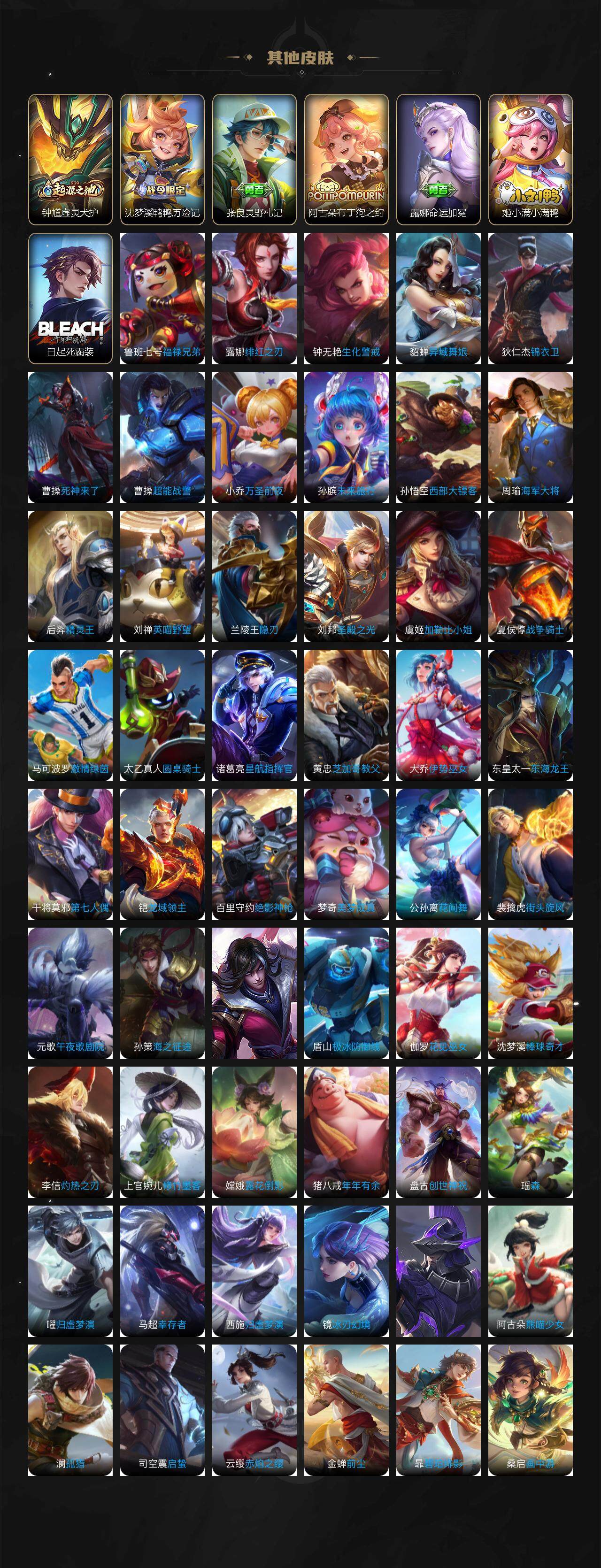 【限定皮肤】:狄仁杰阴阳师,赵云皇家上将,赵云引擎之心,墨子神迹守卫,孙尚香蔷薇恋人,阿轲迷踪丽影,扁鹊奇幻香踪,白起夜都怪侠,吕布御风骁将,马可波罗山海玄木吟,马可波罗妄想实况,狄仁杰魔术师,狄仁杰万华元夜,达摩星际陆战队,达摩沙漠行僧,项羽海滩派对,项羽无限倾心,老夫子圣诞老人,老夫子醍醐杖,老夫子航海奇遇记,关羽百相守梦,程咬金演武夺筹,刘邦夺宝奇兵,韩信逐梦之影,兰陵王金庭之子,花木兰燃星之曲,孙悟空美猴王,孙悟空至尊宝,牛魔御旌,后羿辉光之辰,后羿圣弓游侠,李元芳银河之约,虞姬启明星使,虞姬无限倾心,钟馗神迹守卫,钟馗驱傩正仪,杨戬潮玩骑兵,干将莫邪真爱魔法,蔡文姬繁星吟游,鬼谷子原初探秘者,鬼谷子五谷丰年,大乔挚爱花嫁,苏烈千军破阵,弈星混沌棋,沈梦溪星空之诺,明世隐疑决卦,裴擒虎擒涛扼浪,米莱狄御霄,云中君纤云弄巧,李信山海炽霜斩,伽罗天狼溯光者,盾山御銮,孙策挚爱之约,猪八戒猪悟能,上官婉儿梁祝,上官婉儿妄想奇谈,嫦娥暖冬兔眠,曜山海苍雷引,西施玲珑珍味,鲁班大师探海日志,桑启海盐诗旅,夏洛特浮生妄,暃星界游侠,戈娅驭风魔法,赵怀真鹤归松栖,云缨鹤归松栖,鬼谷子天穹祈灯,刘邦剑破天穹