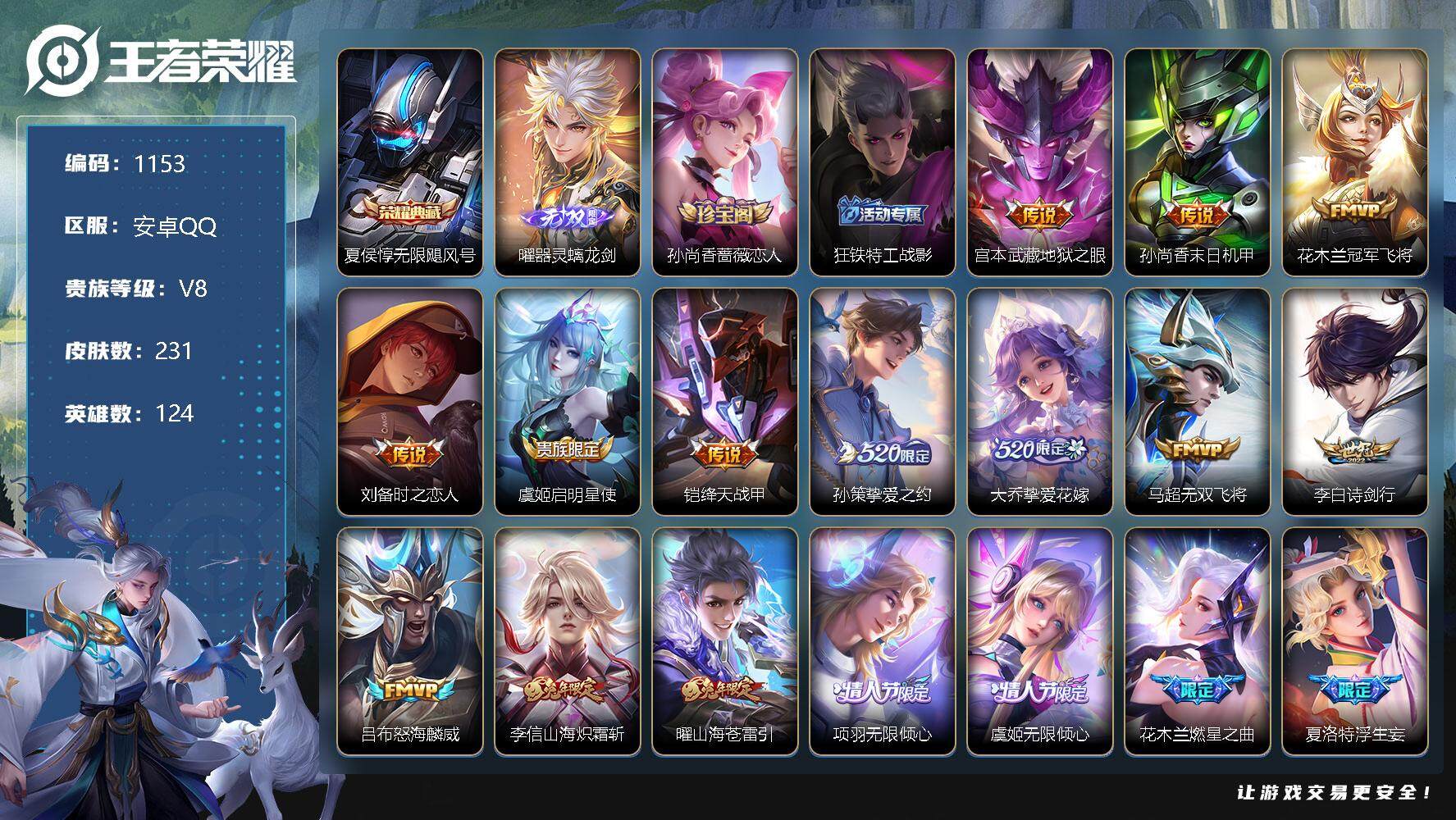 [12740550]安卓Q-V8-永恒钻石IV段位-124英雄-231皮肤-1典藏-0珍品无双-1无双-0珍品传说-23传说-56史诗