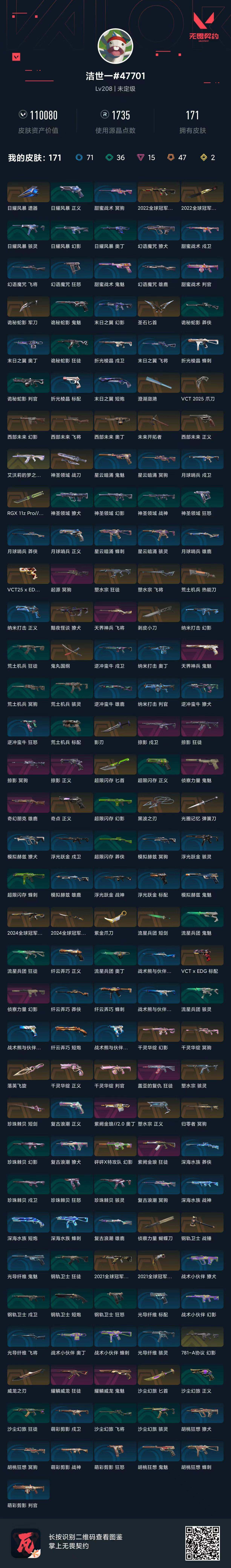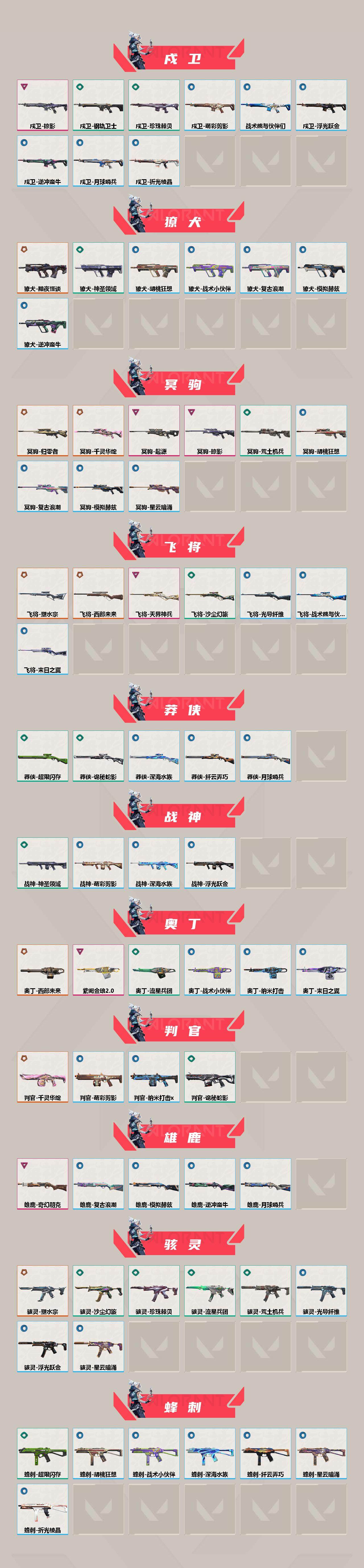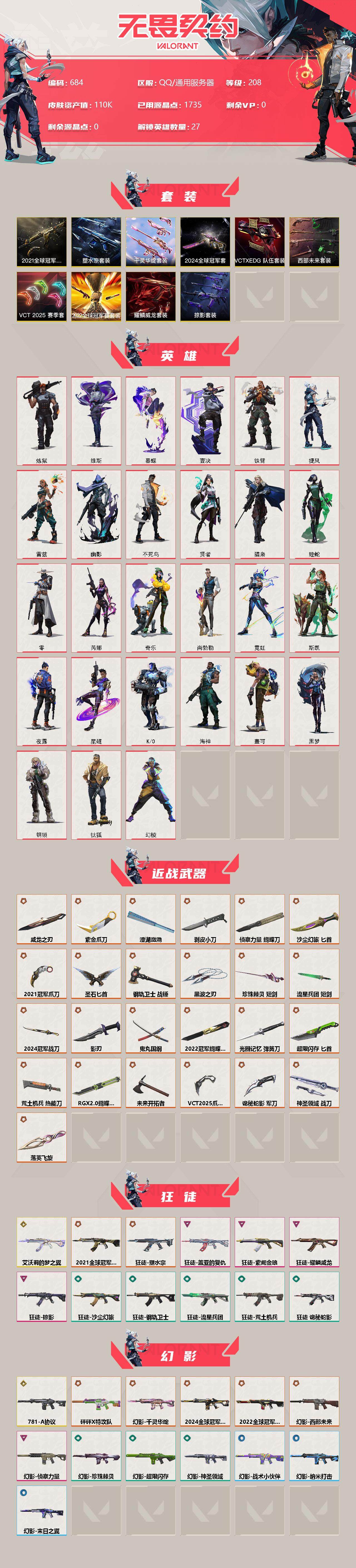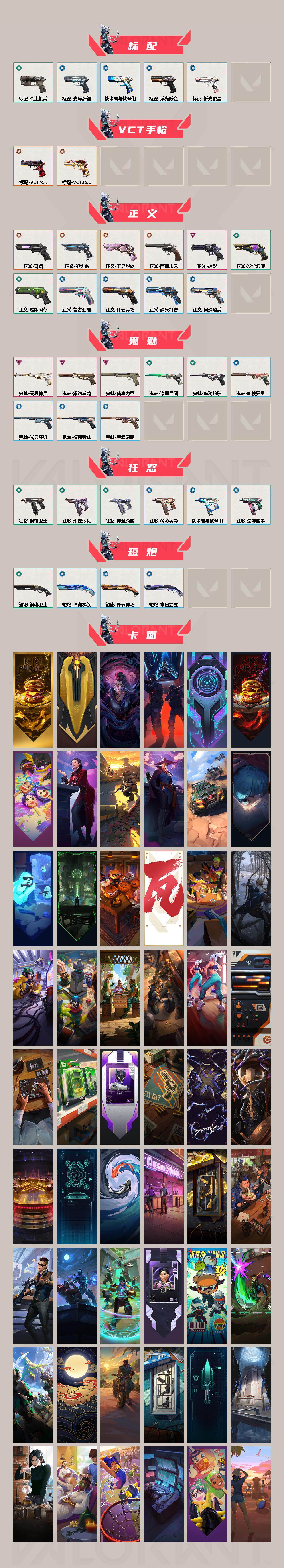 [12741476]【套装】:2024全球冠军赛套装,2022全球冠军赛套装,2021全球冠军赛套装,VCT 2025 赛季套装,西部未来套装,塑水宗套装,千灵华绽套装,VCTxEDG 队伍套装,掠影套装,耀鳞威龙套装 【英雄】:幻棱,炼狱,维斯,暮蝶,钛狐,壹决,铁臂,捷风,雷兹,幽影,不死鸟,贤者,猎枭,蝰蛇,零,芮娜,奇乐,尚勃勒,霓虹,斯凯,夜露,星礈,K/O,海神,盖可,黑梦,钢锁 【近战 武器】:近战武器-2024全球冠军赛 战刀,近战武器-2022全球冠军赛 蝴蝶刀,近战武器-2021全球冠军赛 爪刀,近战武器-RGX 11z Pro//2.0 蝴蝶刀,近战武器-侦察力量 蝴蝶刀,近战武器-剥皮小刀,近战武器-VCT 2025 爪刀,近战武器-紫金爪刀,近战武器-黑波之刃,近战武器-落英飞旋,近战武器-威龙之刃,近战武器-澄湖潋滟,近战武器-鬼丸国纲,近战武器-未来开拓者,近战武器-珍珠棘贝 短剑,近战武器-流星兵团 短剑,近战武器-超限闪存 匕首,近战武器-钢轨卫士 战锤,近战武器-光圈记忆 弹簧刀,近战武器-荒土机兵 热能刀,近战武器-沙尘幻旅 匕首,近战武器-圣石匕首,近战武器-影刃,近战武器-诡秘蛇影 军刀,近战武器-神圣领域 战刀 【狂徒】:狂徒-艾沃莉的梦之翼,狂徒-2021全球冠军赛,狂徒-塑水宗,狂徒-掠影,狂徒-盖亚的复仇,狂徒-耀鳞威龙,狂徒-紫阙金琅,狂徒-钢轨卫士,狂徒-荒土机兵,狂徒-流星兵团,狂徒-沙尘幻旅,狂徒-诡秘蛇影 【幻影】:幻影-781-A协议,幻影-2022全球冠军赛,幻影-2024全球冠军赛,幻影-砰砰X特攻队,幻影-千灵华绽,幻影-西部未来,幻影-侦察力量,幻影-超限闪存,幻影-珍珠棘贝,幻影-神圣领域,幻影-纳米打击,幻影-战术小伙伴,幻影-末日之翼,幻影-西部未来 【戍卫】:戍卫-掠影,戍卫-钢轨卫士,戍卫-珍珠棘贝,戍卫-浮光跃金,戍卫-萌彩剪影,戍卫-逆冲蛮牛,戍卫-战术熊与伙伴们,戍卫-月球哨兵,戍卫-折光棱晶 【獠犬】:獠犬-黯夜怪谈,獠犬-神圣领域,獠犬-复古浪潮,獠犬-胡桃狂想,獠犬-模拟赫兹,獠犬-逆冲蛮牛,獠犬-战术小伙伴 【冥驹】:冥驹-归零者,冥驹-千灵华绽,冥驹-掠影,冥驹-起源,冥驹-荒土机兵,冥驹-复古浪潮,冥驹-胡桃狂想,冥驹-模拟赫兹,冥驹-星云暗涌 【飞将】:飞将-塑水宗,飞将-西部未来,飞
