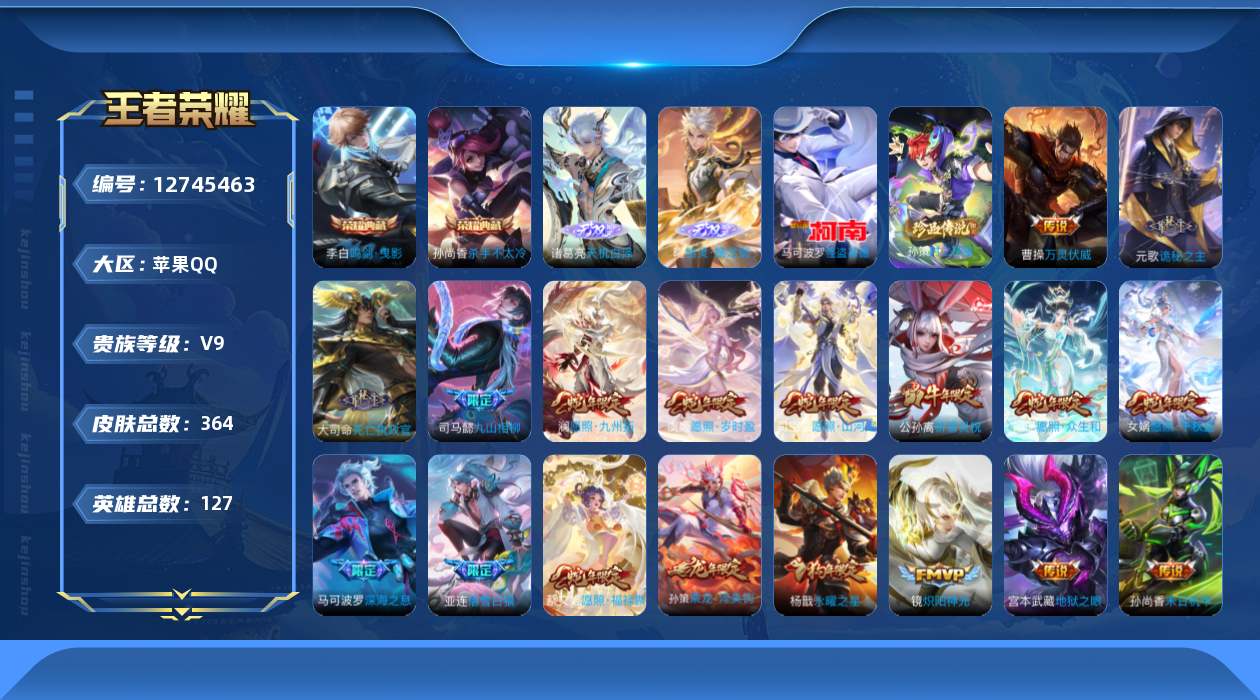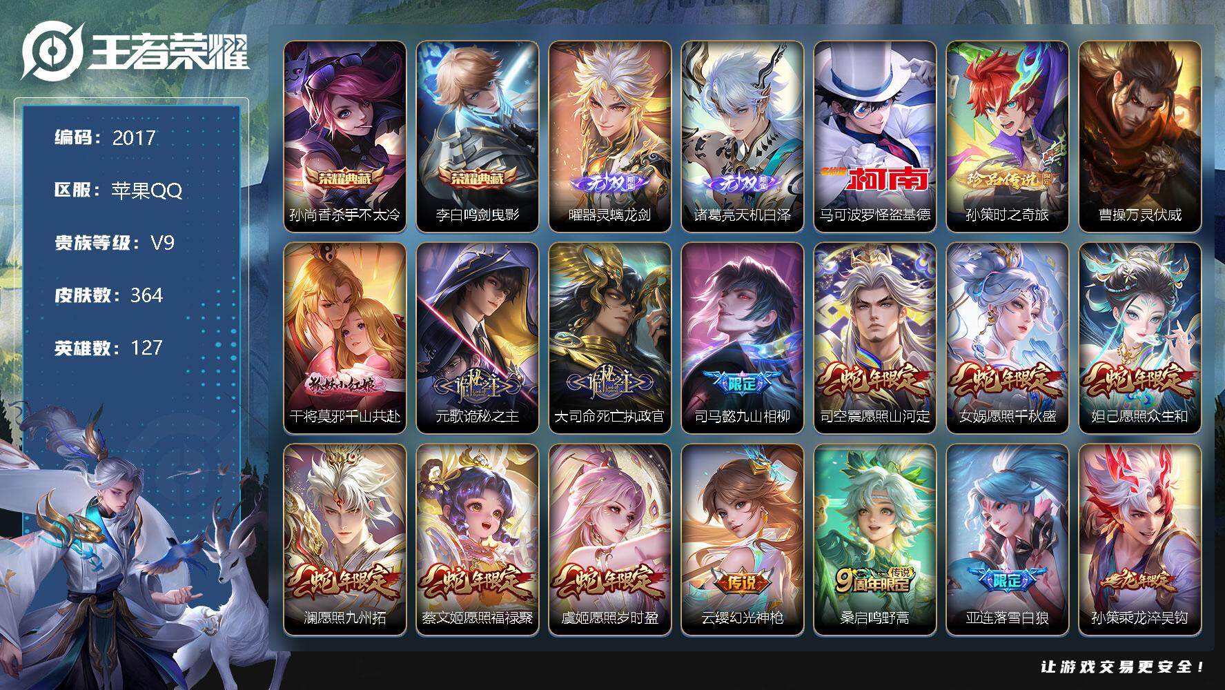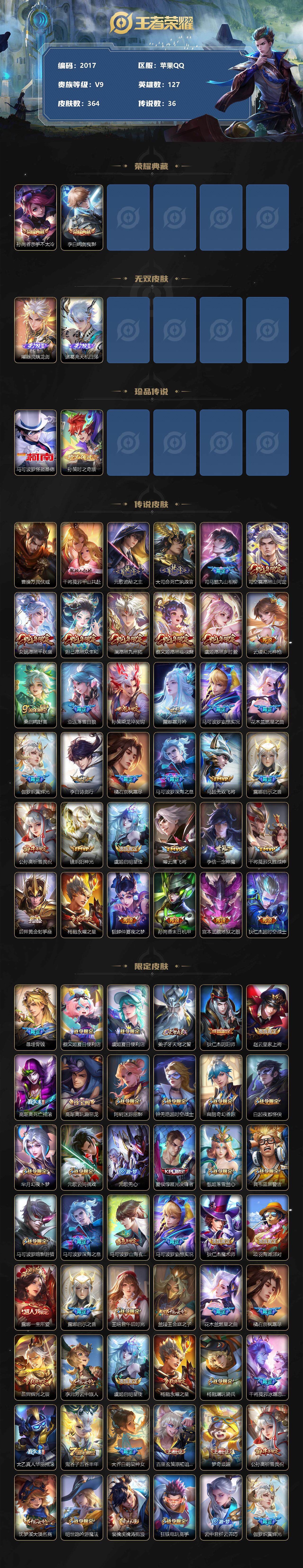 [12745463]苹果Q-V9-最强王者段位-127英雄-364皮肤-2典藏-0珍品无双-2无双-2珍品传说-36传说-113史诗