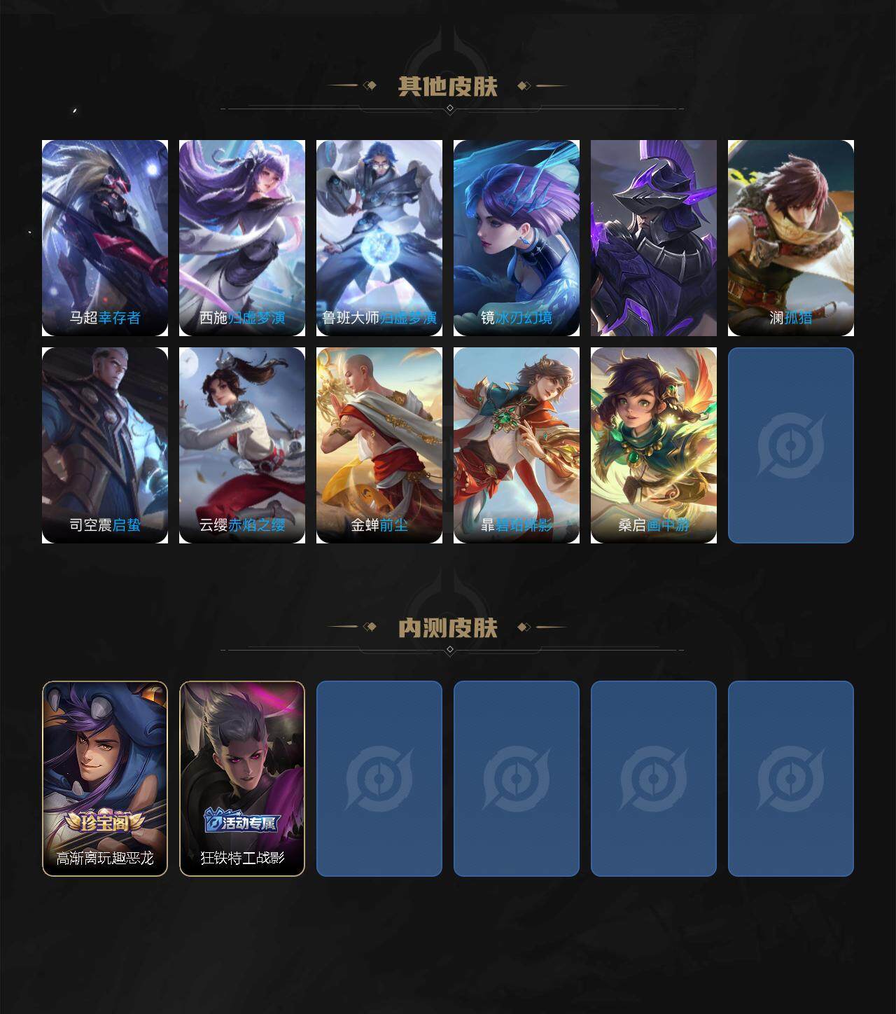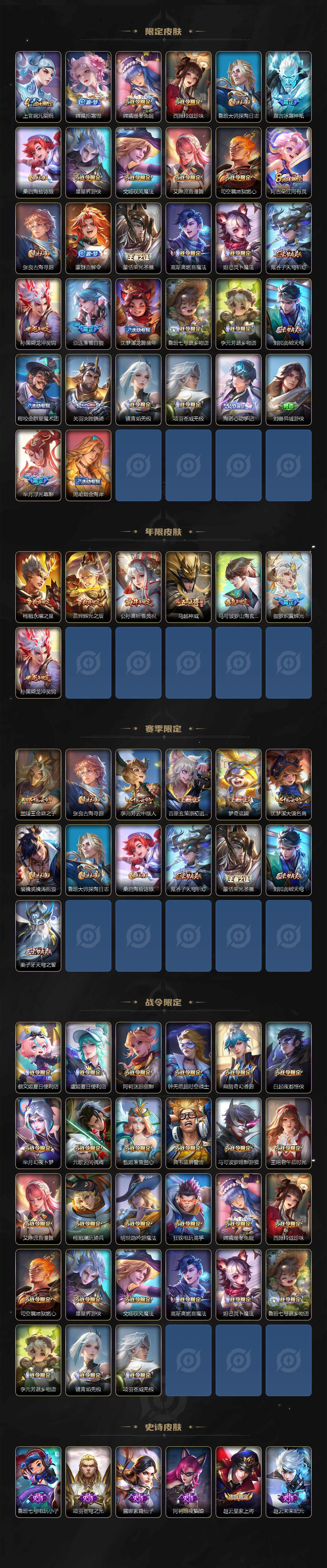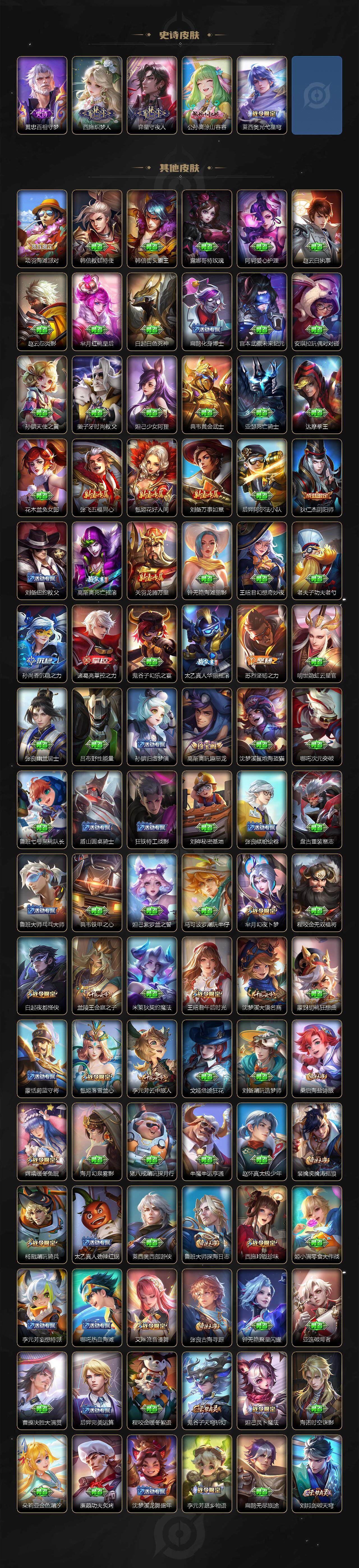 【限定皮肤】:暃埋骨钱,蔡文姬夏日便利店,虞姬夏日便利店,姜子牙天穹之誓,狄仁杰阴阳师,赵云皇家上将,高渐离死亡摇滚,高渐离玩趣恶龙,阿轲迷踪丽影,钟无艳超时空战士,扁鹊奇幻香踪,白起夜都怪侠,芈月幻夜卜梦,元歌云间偶戏,元歌无心,夏侯惇匿光决锋者,甄姬落雪兰心,典韦蓝屏警告,马可波罗暗影游猎,马可波罗深海之息,马可波罗山海玄木吟,马可波罗妄想实况,狄仁杰魔术师,项羽海滩派对,露娜一生所爱,露娜启示之音,王昭君午后时光,兰陵王金庭之子,花木兰燃星之曲,橘右京枫霜尽,后羿辉光之辰,李元芳云中旅人,虞姬启明星使,杨戬永曜之星,杨戬潮玩骑兵,干将莫邪冰霜恋舞曲,太乙真人华丽摇滚,鬼谷子五谷丰年,大乔白鹤梁神女,百里玄策原初追逐者,梦奇顽趣,公孙离祈雪灵祝,沈梦溪大漠名商,明世隐吟游魔法,裴擒虎擒涛扼浪,狂铁电玩高手,云中君纤云弄巧,伽罗炽翼辉光,上官婉儿梁祝,嫦娥拒霜思,嫦娥暖冬兔眠,西施玲珑珍味,鲁班大师探海日志,盘古冰霜神祇,桑启海盐诗旅,暃星界游侠,戈娅驭风魔法,艾琳流音漫舞,司空震地狱燃心,阿古朵江河有灵,张良古海寻踪,蒙犽百解令,蒙恬荣光圣徽,高渐离燃音魔法,妲己灵卜魔法,鬼谷子天穹祈灯,孙策乘龙淬吴钩,亚连落雪白狼,沈梦溪龙舞盛年,鲁班七号蔬乡物语,李元