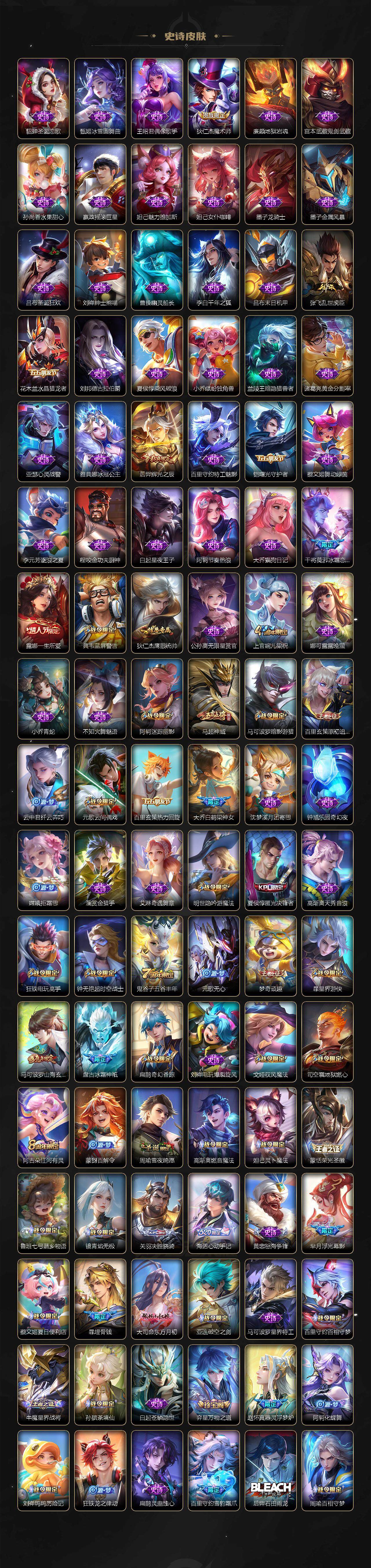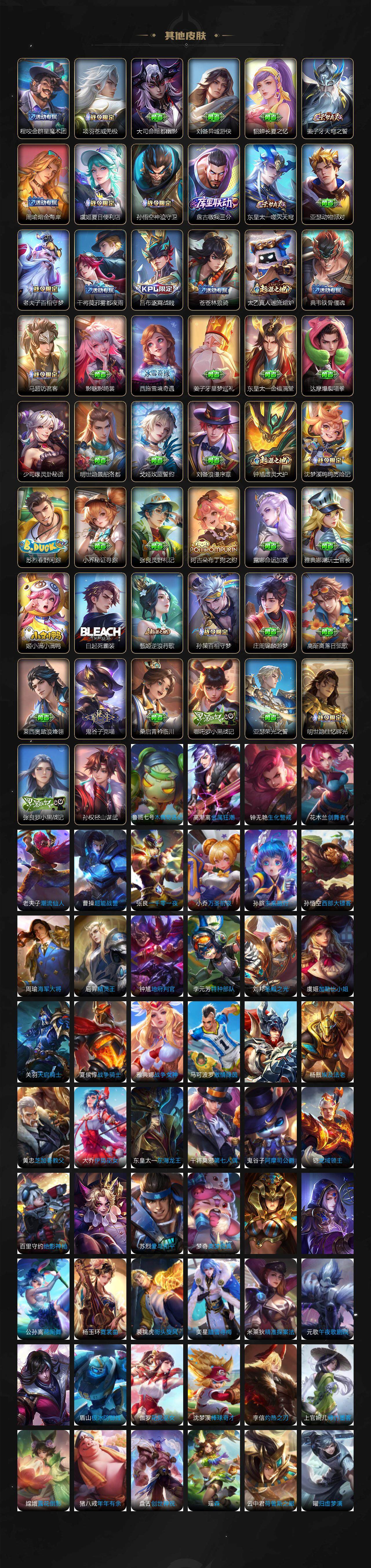 小乔青蛇,娜可露露晚萤,李元芳逐浪之夏,不知火舞魅语,公孙离无限星赏官,大乔猫狗日记,阿轲节奏热浪,露娜紫霞仙子,诸葛亮黄金分割率,王昭君偶像歌手,项羽苍穹之光,阿轲暗夜猫娘,雅典娜冰冠公主,吕布末日机甲,鲁班七号电玩小子,墨子龙骑士,嬴政摇滚巨星,刘禅绅士熊喵,白起星夜王子,程咬金功夫厨神,刘邦德古拉伯爵,兰陵王暗隐猎兽者,曹操幽灵船长,宫本武藏鬼剑武藏,亚瑟心灵战警,钟馗乐园奇幻夜,蔡文姬舞动绿茵,廉颇地狱岩魂,小乔缤纷独角兽,夏侯惇乘风破浪,花木兰水晶猎龙者,铠曙光守护者,百里玄策热力回旋,墨子金属风暴,百里玄策原初追逐者,吕布圣诞狂欢,貂蝉圣诞恋歌,百里守约特工魅影,嫦娥拒霜思,李白千年之狐,澜赏金猎手,艾琳奇遇舞章,高渐离天秀·音浪,刘禅电玩·爆裂旋风,蒙犽百解令,周瑜雪夜绮愿,高渐离燃音魔法,关羽决胜骁骑,海诺心动手记,白起苍鳞隐世,赵怀真器灵·浮梦炉
