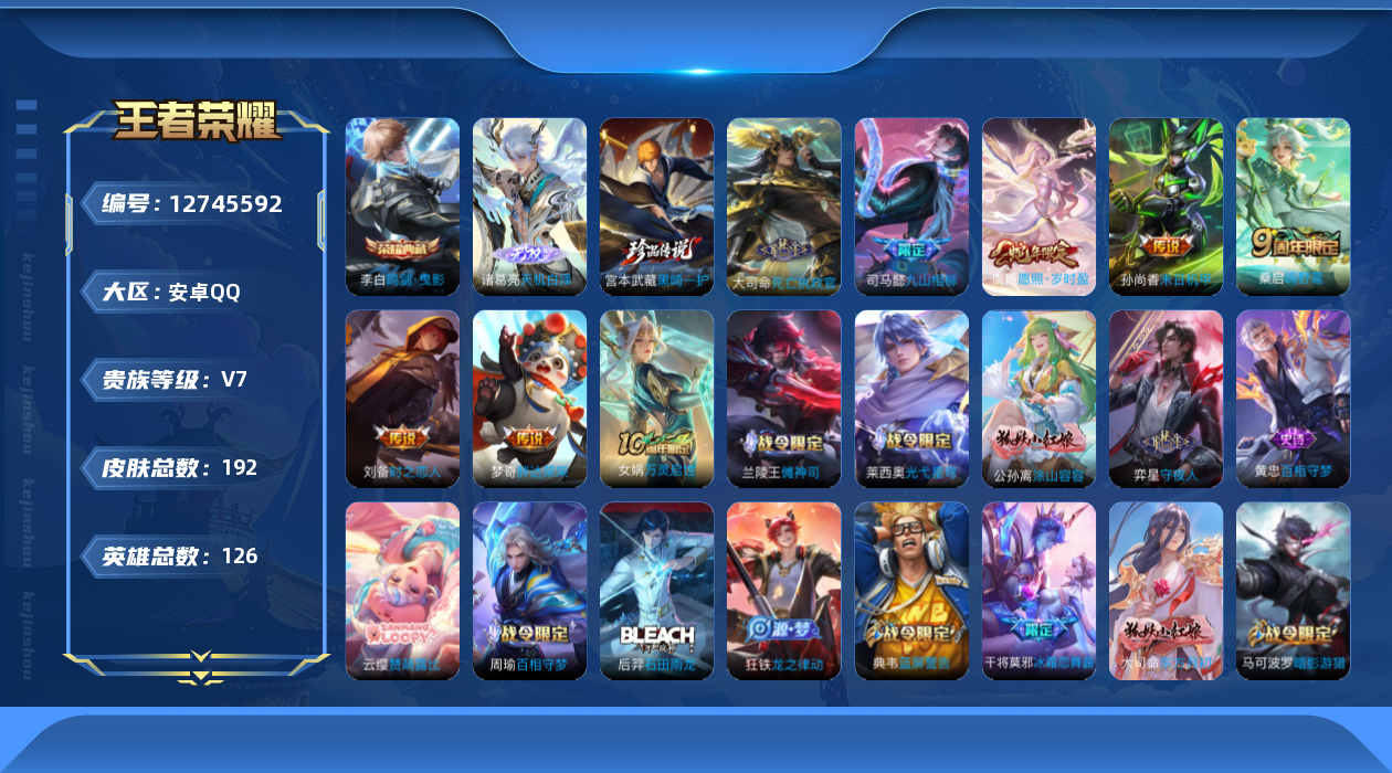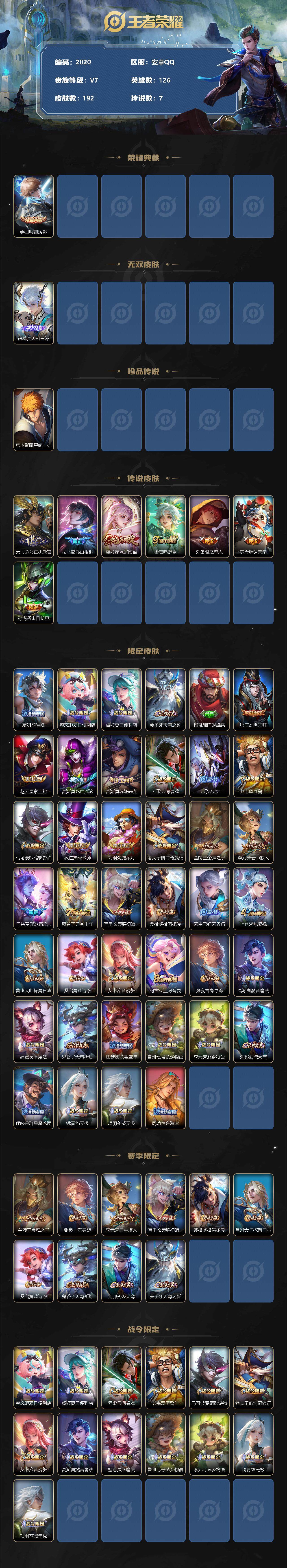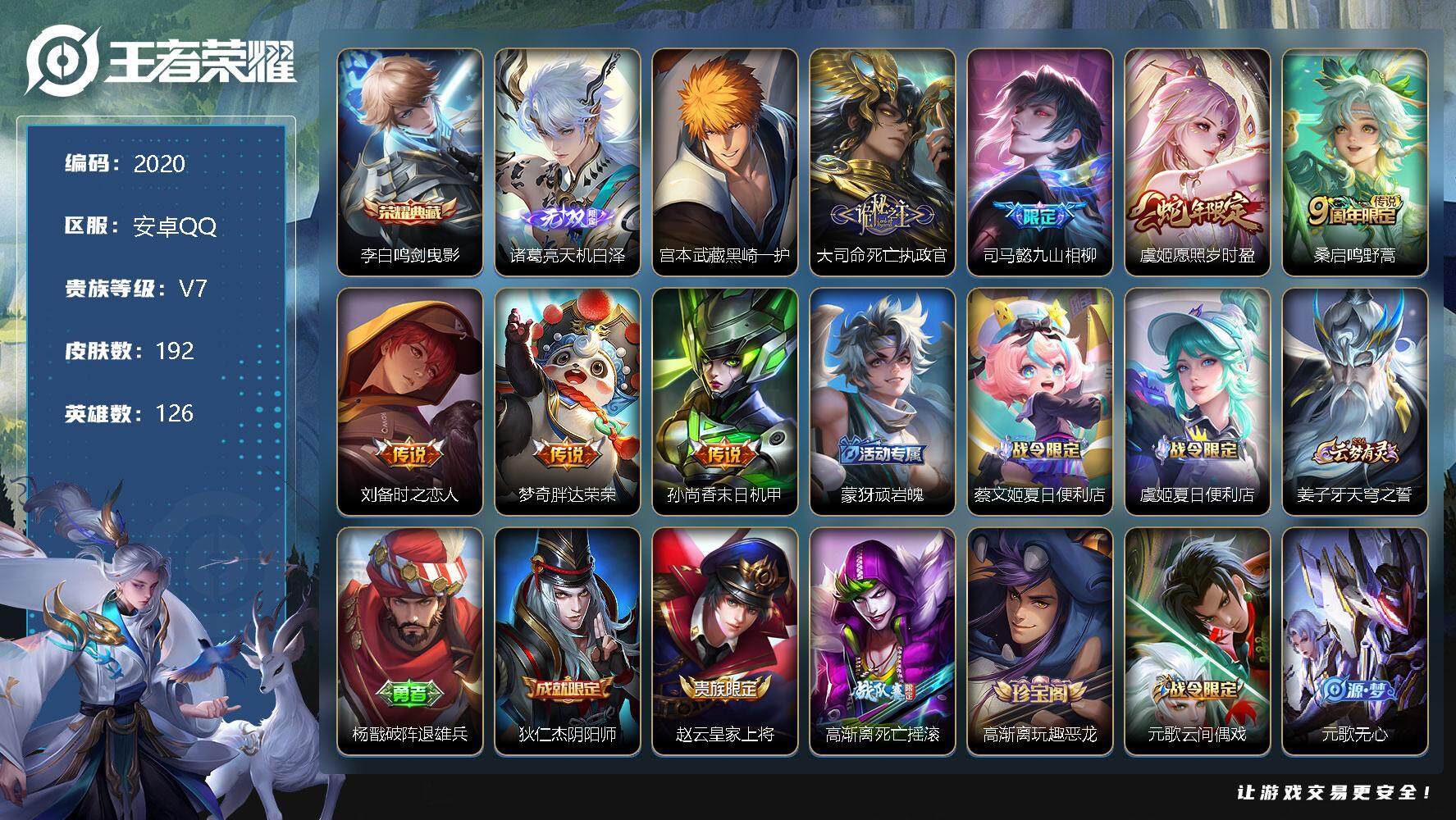 [12745592]安卓Q-V7-最强王者段位-126英雄-192皮肤-1典藏-0珍品无双-1无双-1珍品传说-7传说-66史诗