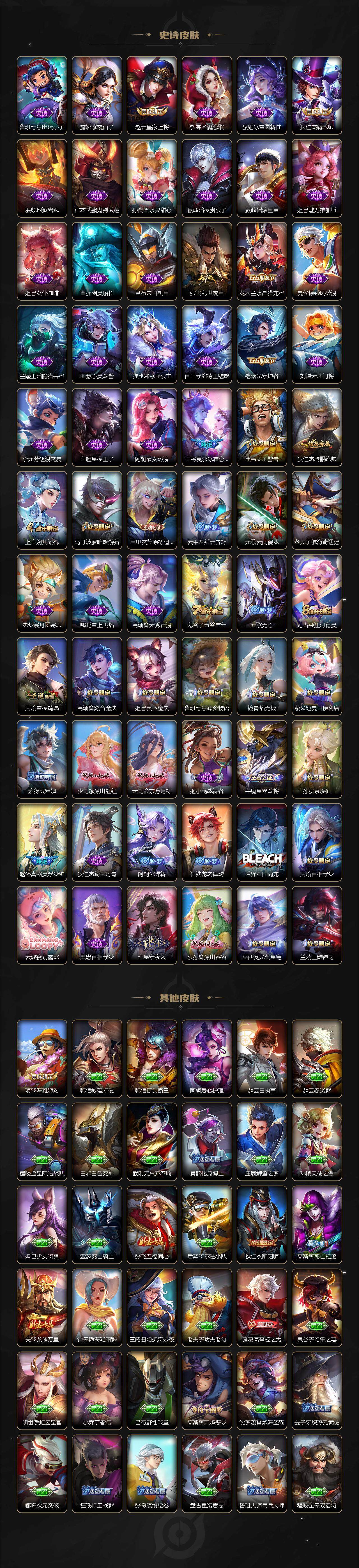 【史诗皮肤】:鲁班七号电玩小子,露娜紫霞仙子,赵云皇家上将,貂蝉圣诞恋歌,甄姬冰雪圆舞曲,狄仁杰魔术师,廉颇地狱岩魂,宫本武藏鬼剑武藏,孙尚香水果甜心,嬴政暗夜贵公子,嬴政摇滚巨星,妲己魅力维加斯,妲己女仆咖啡,曹操幽灵船长,吕布末日机甲,张飞乱世虎臣,花木兰水晶猎龙者,夏侯惇乘风破浪,兰陵王暗隐猎兽者,亚瑟心灵战警,雅典娜冰冠公主,百里守约特工魅影,铠曙光守护者,刘禅天才门将,李元芳逐浪之夏,白起星夜王子,阿轲节奏热浪,干将莫邪冰霜恋舞曲,典韦蓝屏警告,狄仁杰鹰眼统帅,上官婉儿梁祝,马可波罗暗影游猎,百里玄策原初追逐者,云中君纤云弄巧,元歌云间偶戏,老夫子航海奇遇记,沈梦溪月团寄思,哪吒雪上飞焰,高