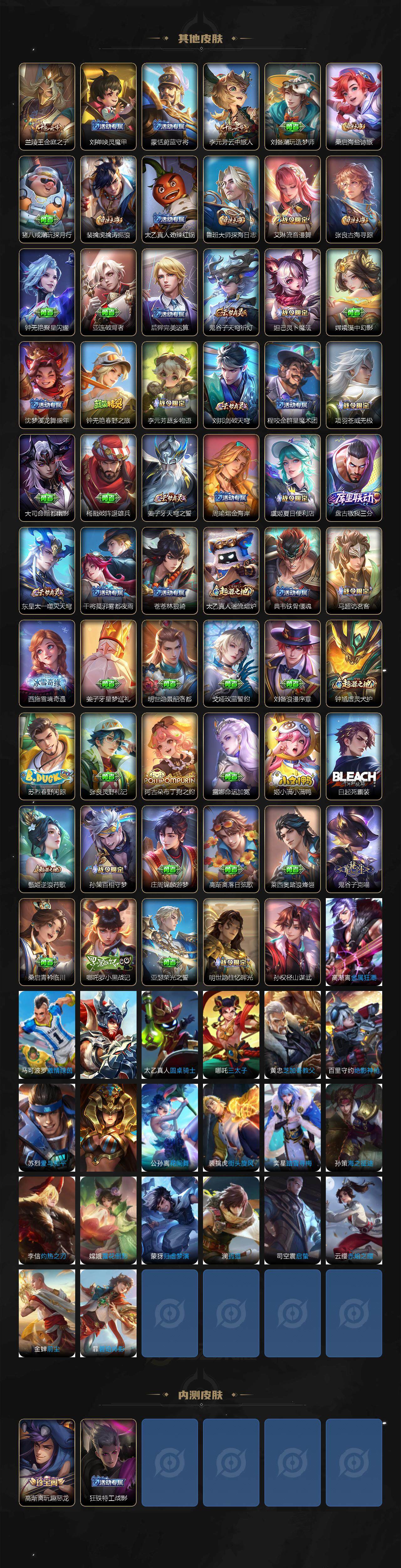 【限定皮肤】:蒙犽顽岩魄,蔡文姬夏日便利店,虞姬夏日便利店,姜子牙天穹之誓,杨戬破阵退雄兵,狄仁杰阴阳师,赵云皇家上将,高渐离死亡摇滚,高渐离玩趣恶龙,元歌云间偶戏,元歌无心,典韦蓝屏警告,马可波罗暗影游猎,狄仁杰魔术师,项羽海滩派对,老夫子航海奇遇记,兰陵王金庭之子,李元芳云中旅人,干将莫邪冰霜恋舞曲,鬼谷子五谷丰年,百里玄策原初追逐者,裴擒虎擒涛扼浪,云中君纤云弄巧,上官婉儿梁祝,鲁班大师探海日志,桑启海盐诗旅,艾琳流音漫舞,阿古朵江河有灵,张良古海寻踪,高渐离燃音魔法,妲己灵卜魔法,鬼谷子天穹祈灯,沈梦溪龙舞盛年,鲁班七号蔬乡物语,李元芳蔬乡物语,刘邦剑破天穹,程咬金群星魔术团,镜青焰无极,项羽苍威无极,周瑜熔金海岸