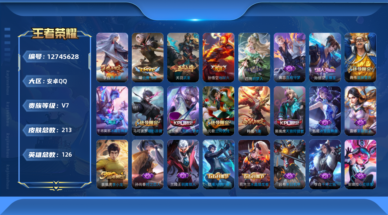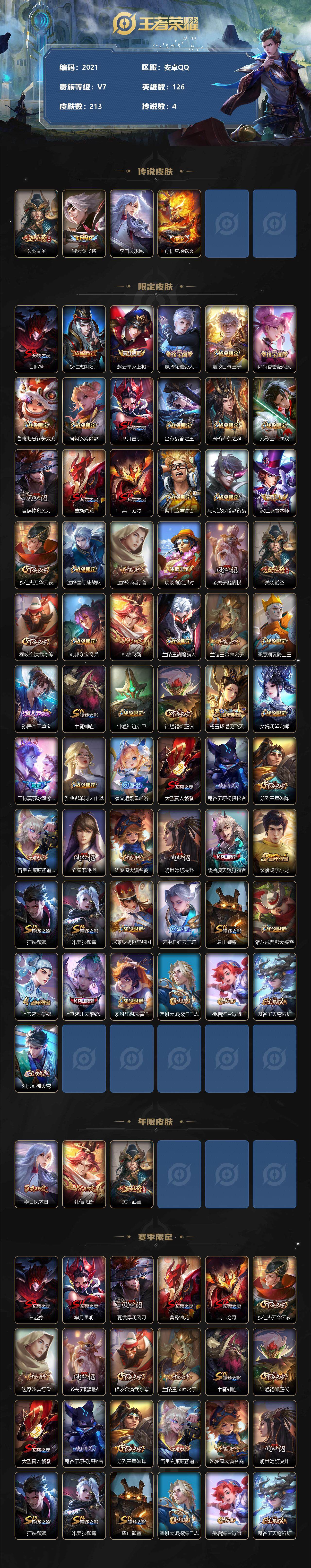 [12745628]安卓Q-V7-至尊星耀V段位-126英雄-213皮肤-0典藏-0珍品无双-0无双-0珍品传说-4传说-57史诗