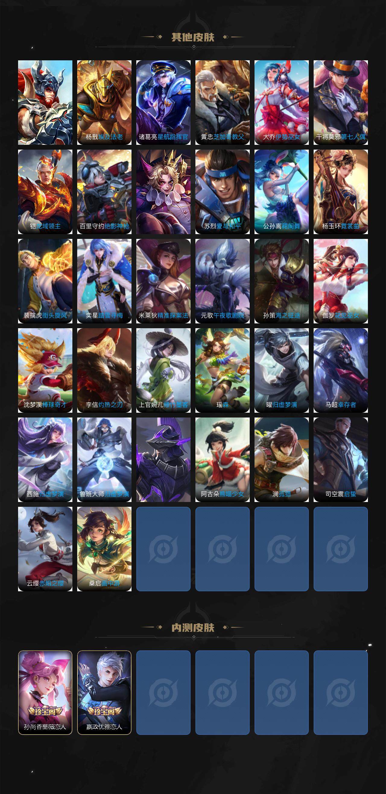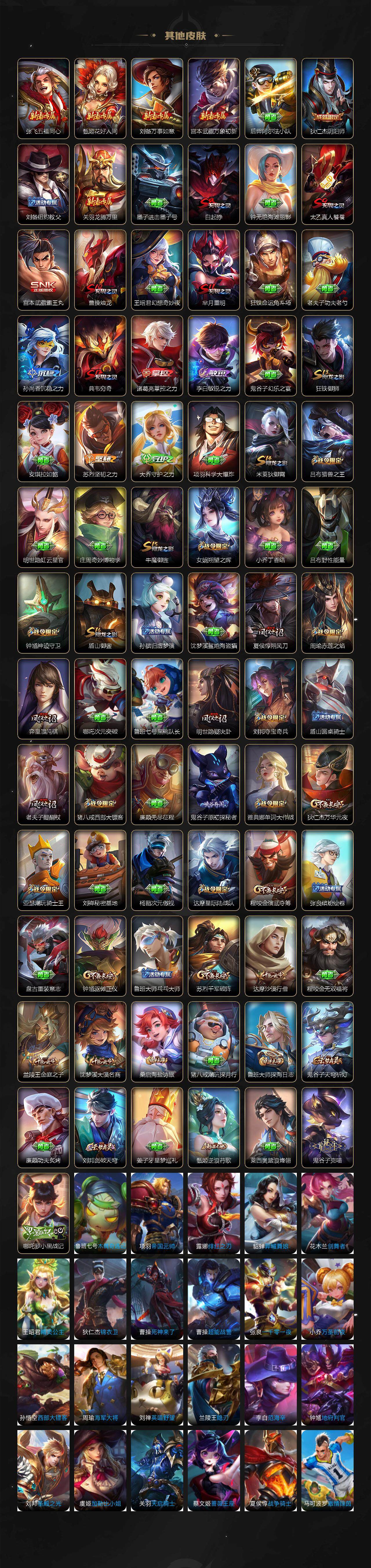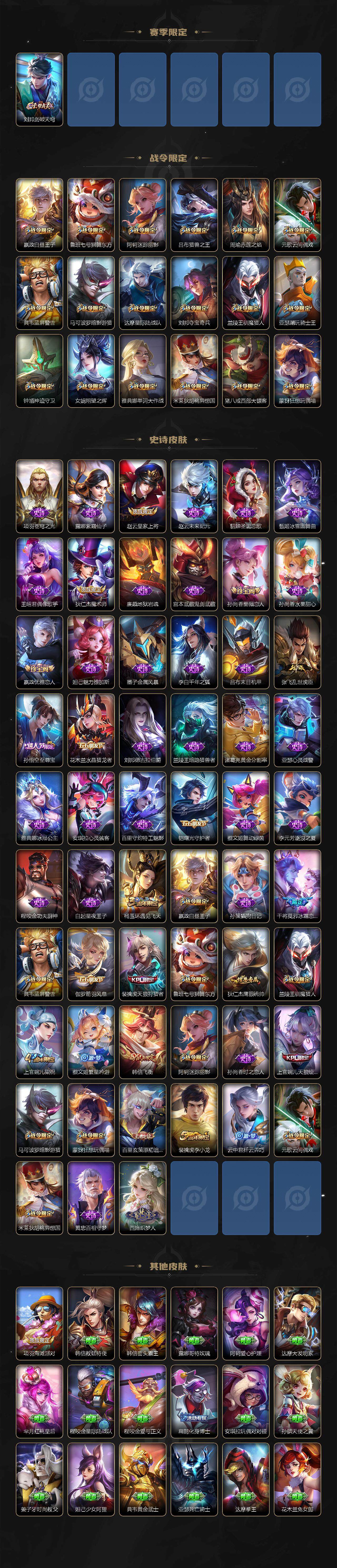 【限定皮肤】:白起狰,狄仁杰阴阳师,赵云皇家上将,嬴政优雅恋人,嬴政白昼王子,孙尚香蔷薇恋人,鲁班七号狮舞东方,阿轲迷踪丽影,芈月重明,吕布猎兽之王,周瑜赤莲之焰,元歌云间偶戏,夏侯惇朔风刀,曹操烛龙,典韦穷奇,典韦蓝屏警告,马可波罗暗影游猎,狄仁杰魔术师,狄仁杰万华元夜,达摩星际陆战队,达摩沙漠行僧,项羽海滩派对,老夫子醍醐杖,关羽武圣,程咬金演武夺筹,刘邦夺宝奇兵,韩信飞衡,兰陵王驯魔猎人,兰陵王金庭之子,亚瑟潮玩骑士王,孙悟空至尊宝,牛魔御旌,钟馗神迹守卫,钟馗驱傩正仪,杨玉环遇见飞天,女娲朔望之晖,干将莫邪冰霜恋舞曲,雅典娜单词大作战,蔡文姬繁星吟游,太乙真人饕餮,鬼谷子原初探秘者,苏烈千军破阵,百里玄策原初追逐者,弈星混沌棋,沈梦溪大漠名商,明世隐疑决卦,裴擒虎天狼狩猎者,裴擒虎李小龙,狂铁御狮,米莱狄御霄,米莱狄胡桃异想国,云中君纤云弄巧,盾山御銮,猪八戒西部大镖客,上官婉儿梁祝,上官婉儿天狼绘梦者,蒙犽狂想玩偶喵,鲁班大师探海日志,桑启海盐诗旅,鬼谷子天穹祈灯,刘邦剑破天穹