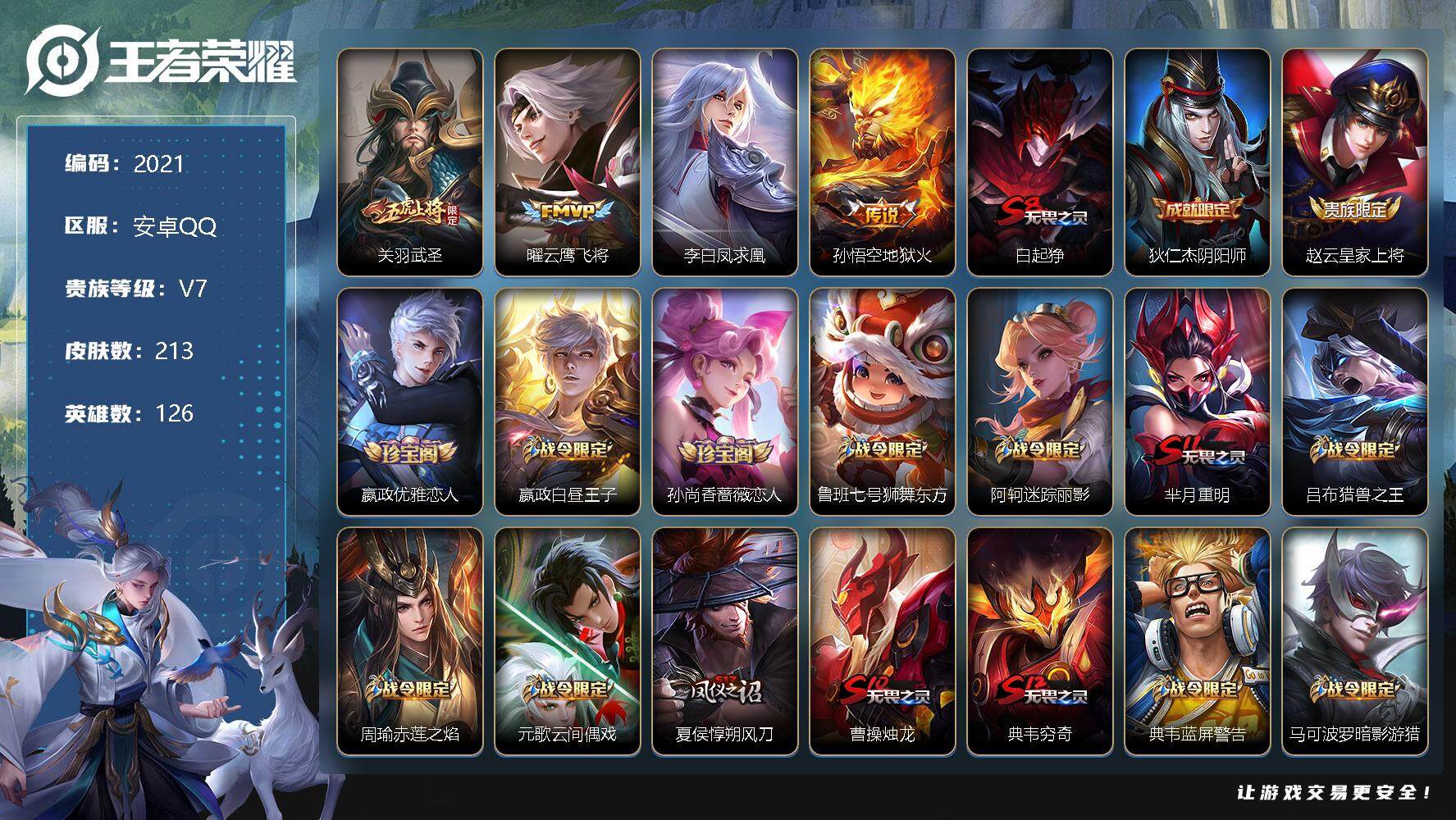 [12745628]安卓Q-V7-至尊星耀V段位-126英雄-213皮肤-0典藏-0珍品无双-0无双-0珍品传说-4传说-57史诗 【传说皮肤】:关羽武圣,曜云鹰飞将,李白凤求凰,孙悟空地狱火 【限定皮肤】:白起狰,狄仁杰阴阳师,赵云皇家上将,嬴政优雅恋人,嬴政白昼王子,孙尚香蔷薇恋人,鲁班七号狮舞东方,阿轲迷踪丽影,芈月重明,吕布猎兽之王,周瑜赤莲之焰,元歌云间偶戏,夏侯惇朔风刀,曹操烛龙,典韦穷奇,典韦蓝屏警告,马可波罗暗影游猎,狄仁杰魔术师,狄仁杰万华元夜,达摩星际陆战队,达摩沙漠行僧,项羽海滩派对,老夫子醍醐杖,关羽武圣,程咬金演武夺筹,刘邦夺宝奇兵,韩信飞衡,兰陵王驯魔猎人,兰陵王金庭之子,亚瑟潮玩骑士王,孙悟空至尊宝,牛魔御旌,钟馗神迹守卫,钟馗驱傩正仪,杨玉环遇见飞天,女娲朔望之晖,干将莫邪冰霜恋舞曲,雅典娜单词大作战,蔡文姬繁星吟游,太乙真人饕餮,鬼谷子原初探秘者,苏烈千军破阵,百里玄策原初追逐者,弈星混沌棋,沈梦溪大漠名商,明世隐疑决卦,裴擒虎天狼狩猎者,裴擒虎李小龙,狂铁御狮,米莱狄御霄,米莱狄胡桃异想国,云中君纤云弄巧,盾山御銮,猪八戒西部大镖客,上官婉儿梁祝,上官婉儿天狼绘梦者,蒙犽狂想玩偶喵,鲁班大师探海日志,桑启海盐诗旅,鬼谷子天穹祈灯,刘邦剑破天穹 【年限皮肤】:李白凤求凰,韩信飞衡,关羽武圣 【赛季限定】:白起狰,芈月重明,夏侯惇朔风刀,曹操烛龙,典韦穷奇,狄仁杰万华元夜,达摩沙漠行僧,老夫子醍醐杖,程咬金演武夺筹,兰陵王金庭之子,牛魔御旌,钟馗驱傩正仪,太乙真人饕餮,鬼谷子原初探秘者,苏烈千军破阵,百里玄策原初追逐者,弈星混沌棋,沈梦溪大漠名商,明世隐疑决卦,狂铁御狮,米莱狄御霄,盾山御銮,鲁班大师探海日志,桑启海盐诗旅,鬼谷子天穹祈灯,刘邦剑破天穹 【战令限定】:嬴政白昼王子,鲁班七号狮舞东方,阿轲迷踪丽影,吕布猎兽之王,周瑜赤莲之焰,元歌云间偶戏,典韦蓝屏警告,马可波罗暗影游猎,达摩星际陆战队,刘邦夺宝奇兵,兰陵王驯魔猎人,亚瑟潮玩骑士王,钟馗神迹守卫,女娲朔望之晖,雅典娜单词大作战,米莱狄胡桃异想国,猪八戒西部大镖客,蒙犽狂想玩偶喵 【史诗皮肤】:项羽苍穹之光,露娜紫霞仙子,赵云皇家上将,赵云未来纪元,貂蝉圣诞恋歌,甄姬冰雪圆舞曲,王昭君偶像歌手,狄仁杰魔术师,廉颇地狱岩魂,宫本武藏鬼剑武藏,孙尚香蔷薇恋人,孙尚香水果甜心,嬴政优雅恋人,妲己魅
