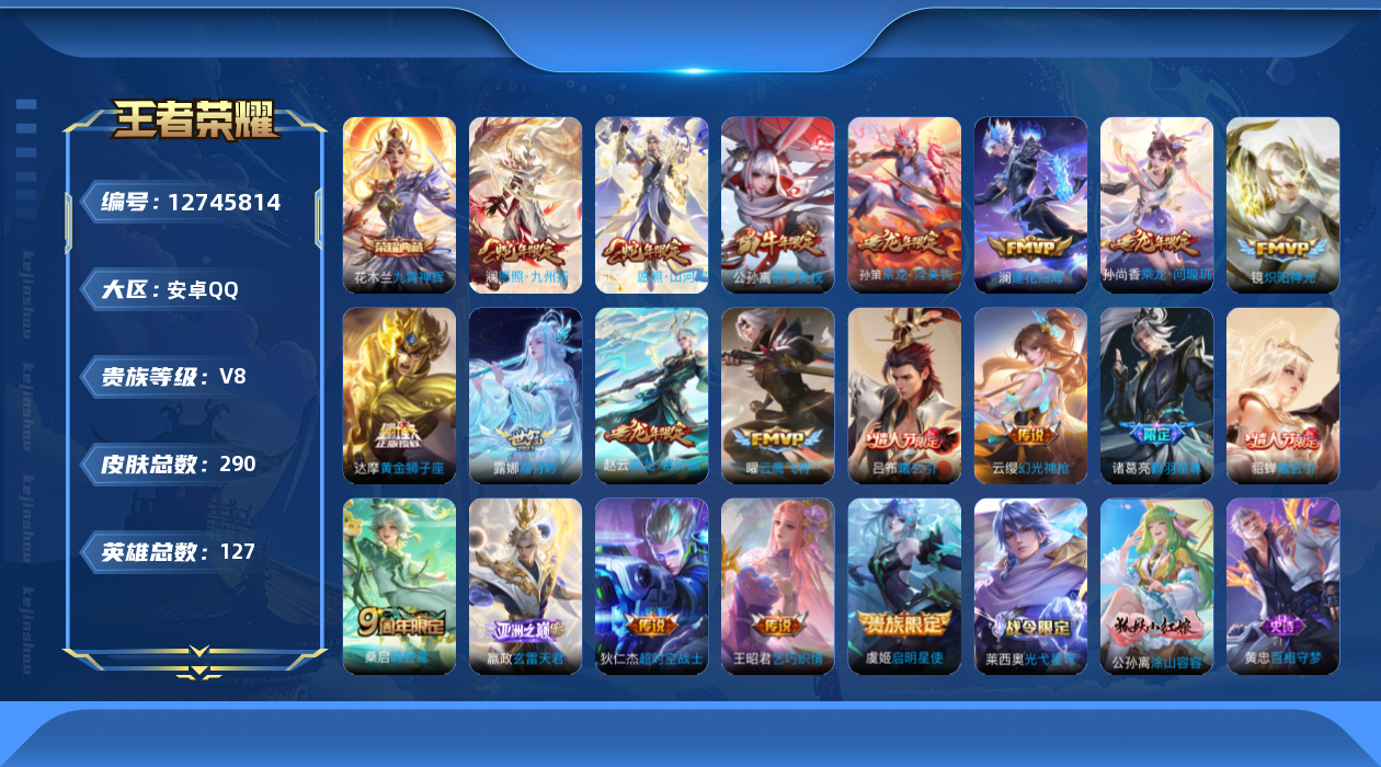 [12745814]安卓Q-V8-至尊星耀IV段位-127英雄-290皮肤-1典藏-0珍品无双-0无双-0珍品传说-20传说-89史诗
