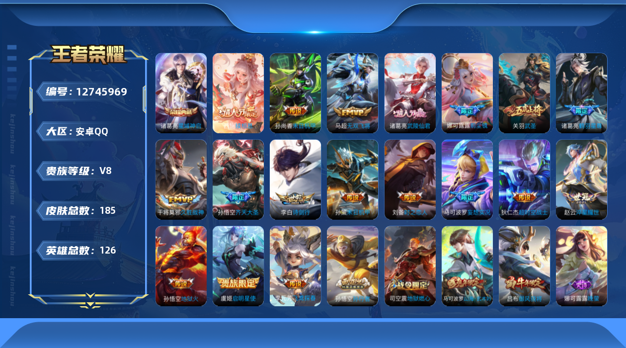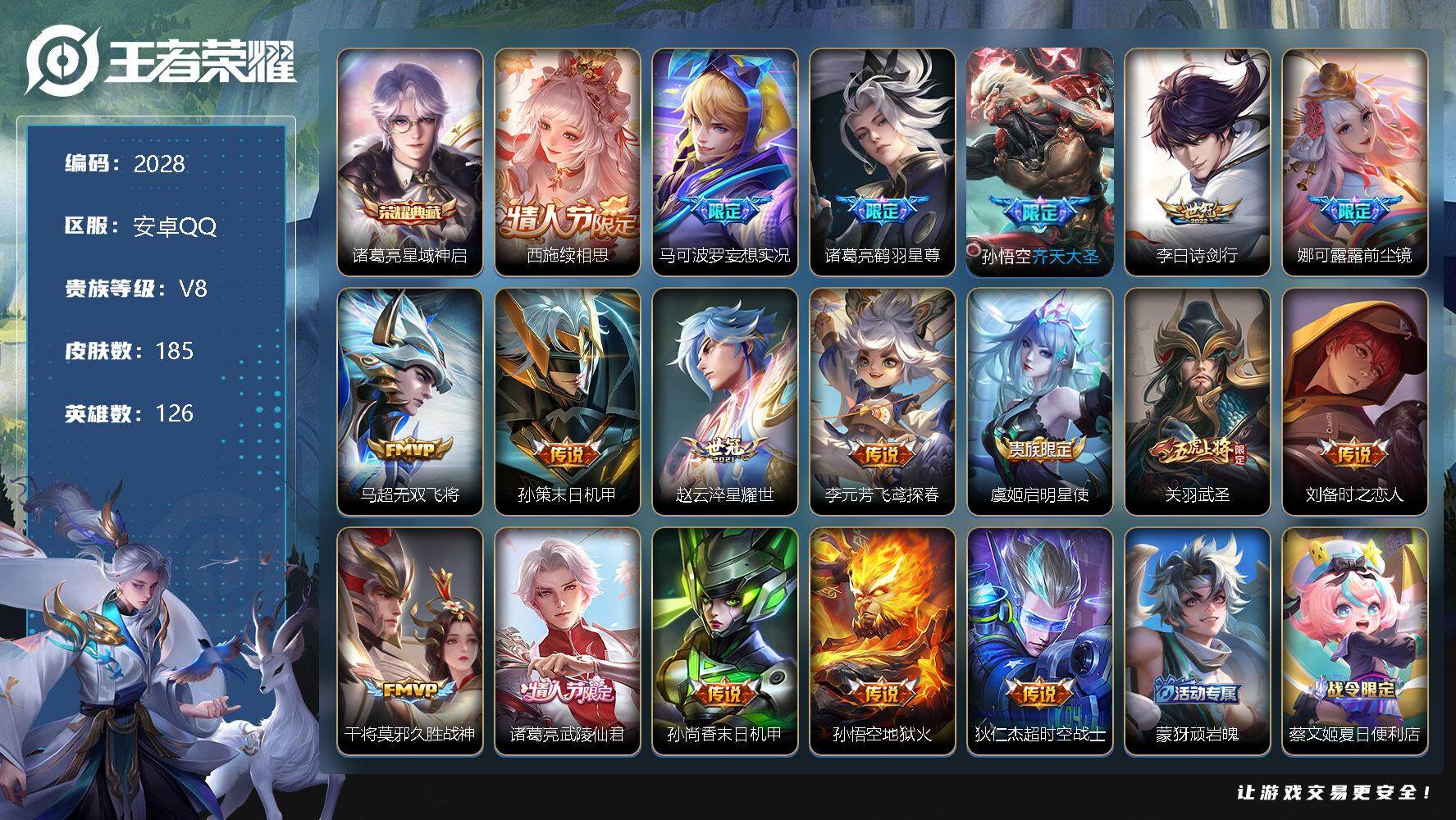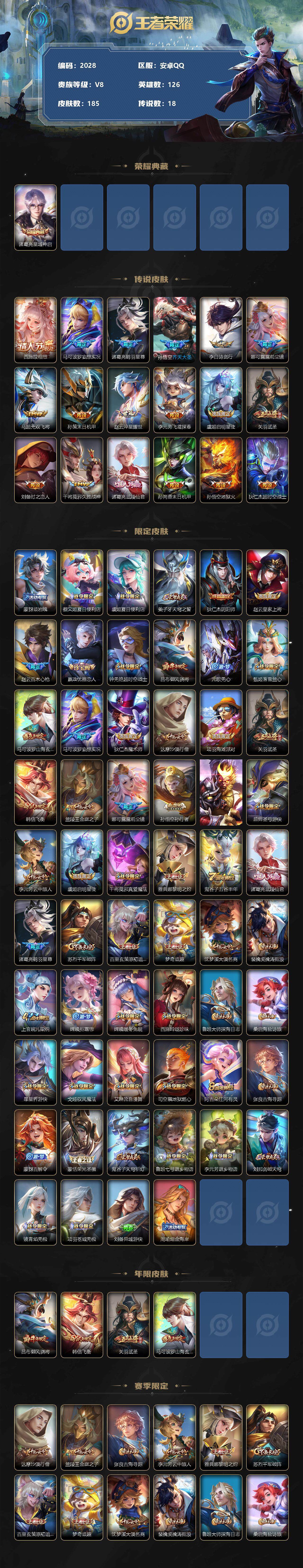 [12745969]安卓Q-V8-最强王者段位-126英雄-185皮肤-1典藏-0珍品无双-0无双-0珍品传说-18传说-65史诗