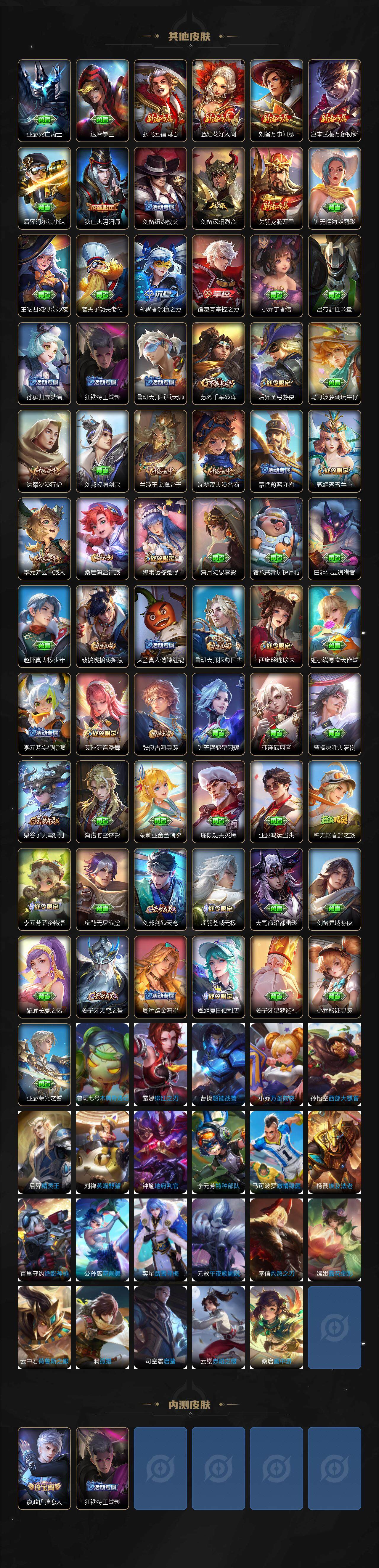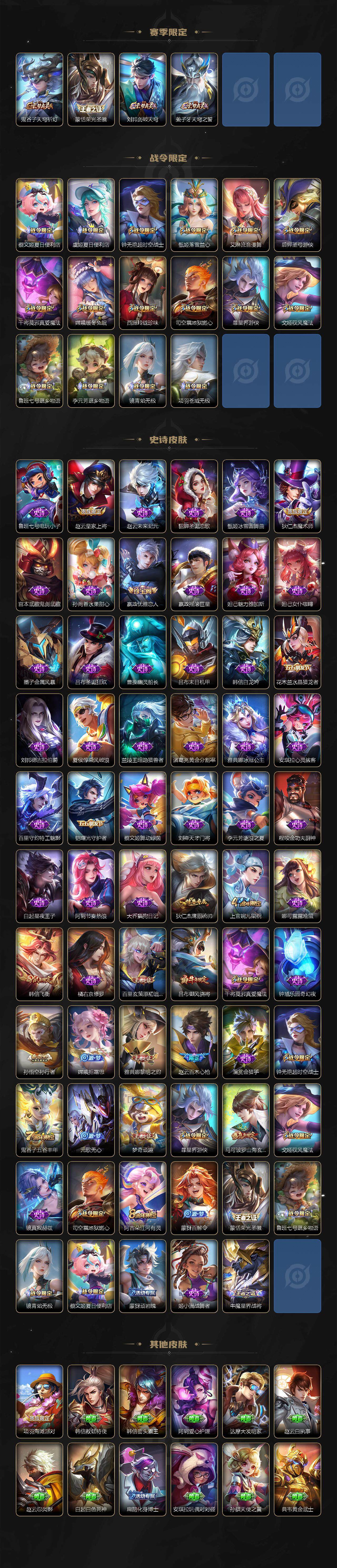 【限定皮肤】:蒙犽顽岩魄,蔡文姬夏日便利店,虞姬夏日便利店,姜子牙天穹之誓,狄仁杰阴阳师,赵云皇家上将,赵云百木心枪,嬴政优雅恋人,钟无艳超时空战士,吕布御风骁将,元歌无心,甄姬落雪兰心,马可波罗山海玄木吟,马可波罗妄想实况,狄仁杰魔术师,达摩沙漠行僧,项羽海滩派对,关羽武圣,韩信飞衡,兰陵王金庭之子,娜可露露前尘镜,孙悟空孙行者,孙悟空齐天大圣,后羿圣弓游侠,李元芳云中旅人,虞姬启明星使,干将莫邪真爱魔法,雅典娜黎明之约,鬼谷子五谷丰年,诸葛亮武陵仙君,诸葛亮鹤羽星尊,苏烈千军破阵,百里玄策原初追逐者,梦奇顽趣,沈梦溪大漠名商,裴擒虎擒涛扼浪,上官婉儿梁祝,嫦娥拒霜思,嫦娥暖冬兔眠,西施玲珑珍味,鲁班大师探海日志,桑启海盐诗旅,暃星界游侠,戈娅驭风魔法,艾琳流音漫舞,司空震地狱燃心,阿古朵江河有灵,张良古海寻踪,蒙犽百解令,蒙恬荣光圣徽,鬼谷子天穹祈灯,鲁班七号蔬乡物语,李元芳蔬乡物语,刘邦剑破天穹,镜青焰无极,项羽苍威无极,刘备异域游侠,周瑜熔金海岸